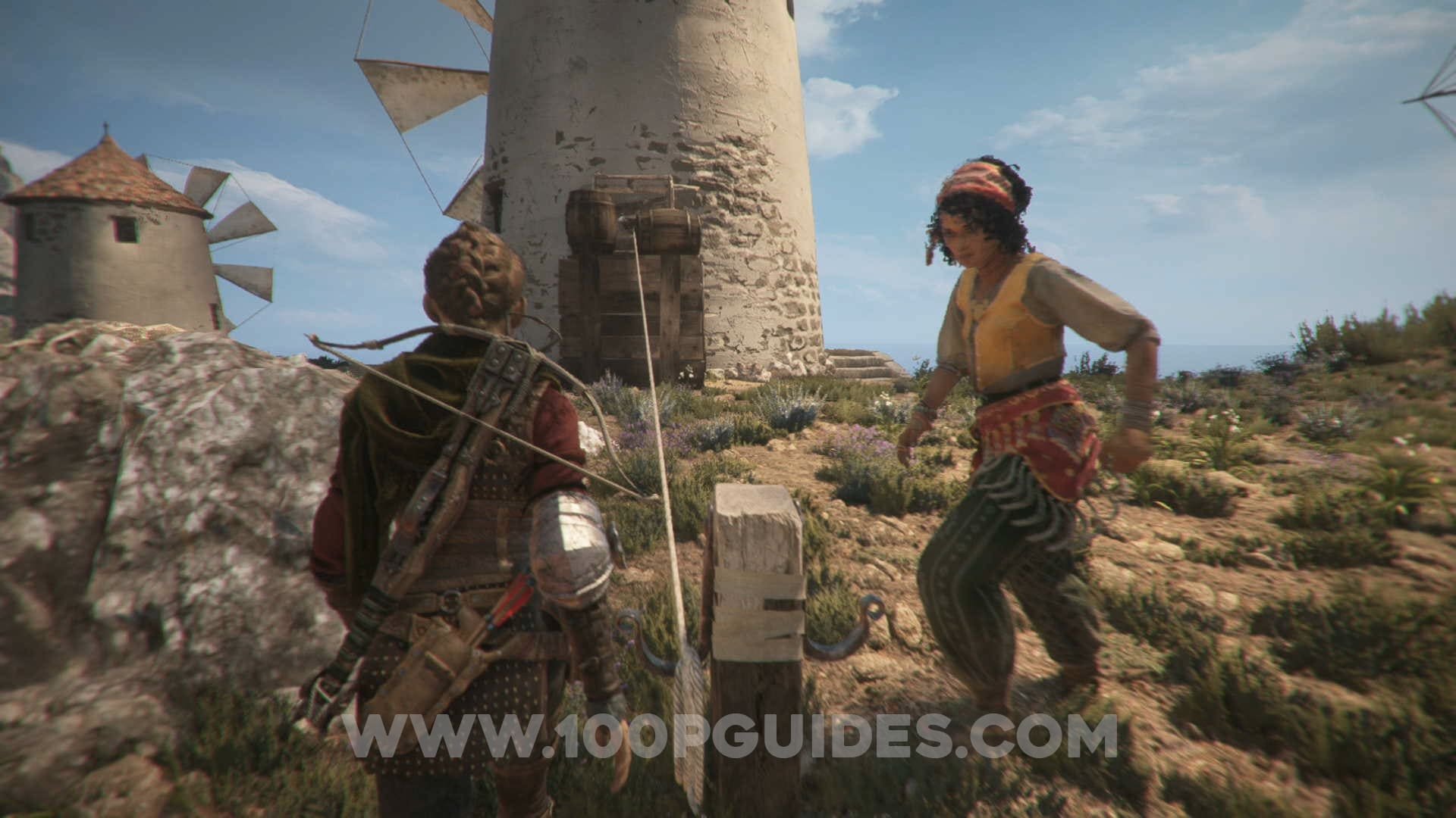 Move a long to the next windmill and go behind it to find a rope. Go to the end of the rope and pull on it to gain access to the inside of the windmill. Once inside use the break to turn it off.
