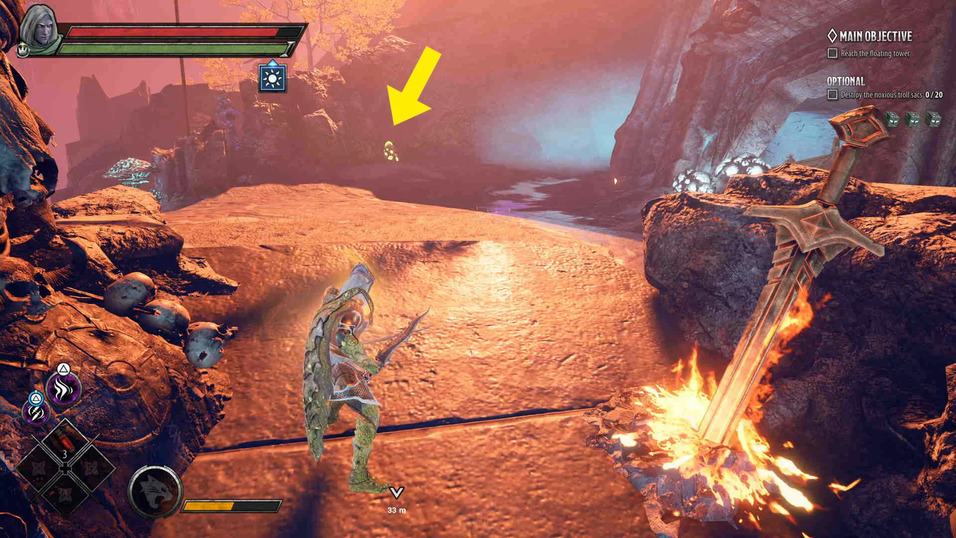 4. In the next open area where you have to fight multiple big trolls to reveal the flame sword in the middle, the sac is found to the right in a little cave.
