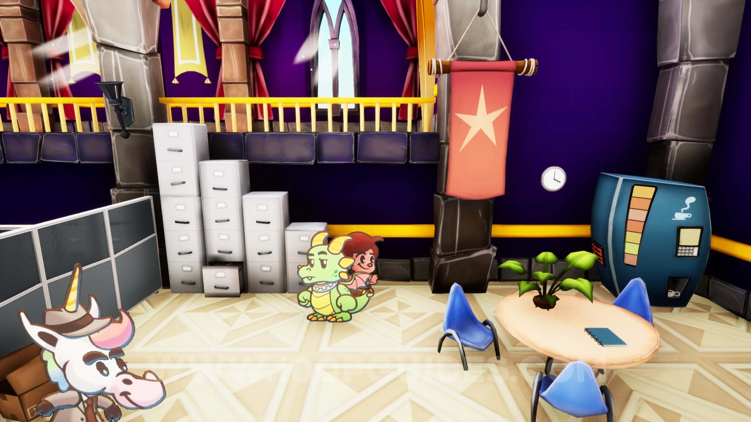 Sun Gem #6 & Trinket #5 - Winged Smackdown. Talk to Pinocchio on the right side of the office, then go to the left and talk to the fairy in the cubicle. She will describe 3 items that you must order from 3 different NPCs that you must remember (don’t worry if you don’t get them right, since you can purchase the bonus price for 30 gold if you screw up). First, go to the Library that can be found by going through the door to the right of the front desk room (the first room of the game), talk to the fairy behind the counter and select the correct banner. Then go to the courtyard by going through the wooden door at the back of the front desk room. Go left and talk to the vampire NPC and select the correct options. Finally, go through the door on the left of the vampire NPC to enter the cafeteria. Talk to the NPC behind the counter and ask for the correct cake. After talking to the 3 NPCs, return to the fairy in the office and talk to her. After the event, you will get a Sun Gem no matter what, as well as the Trinket if you got everything right. If you didn’t, he will sell you the trinket for 30 gold.