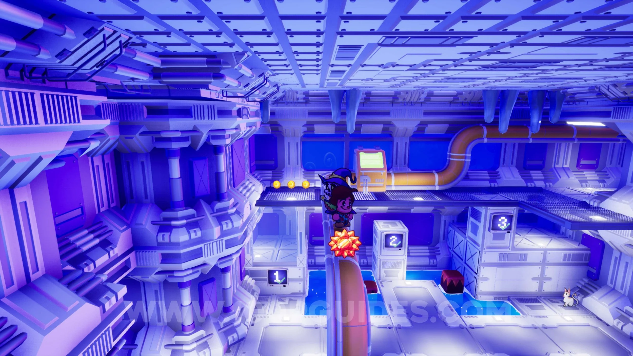 Sun Gem #62. Once you have all party members again, enter the R&D lab and return to the area with the switches that open the cells. With Eva in the party, you will now be able to open cell number 2 by transforming the cat into a jump shroom. With the cell open, go left and talk to the alien in cell number 2. Now return to the shop in the alien village to get the Sun Gem.