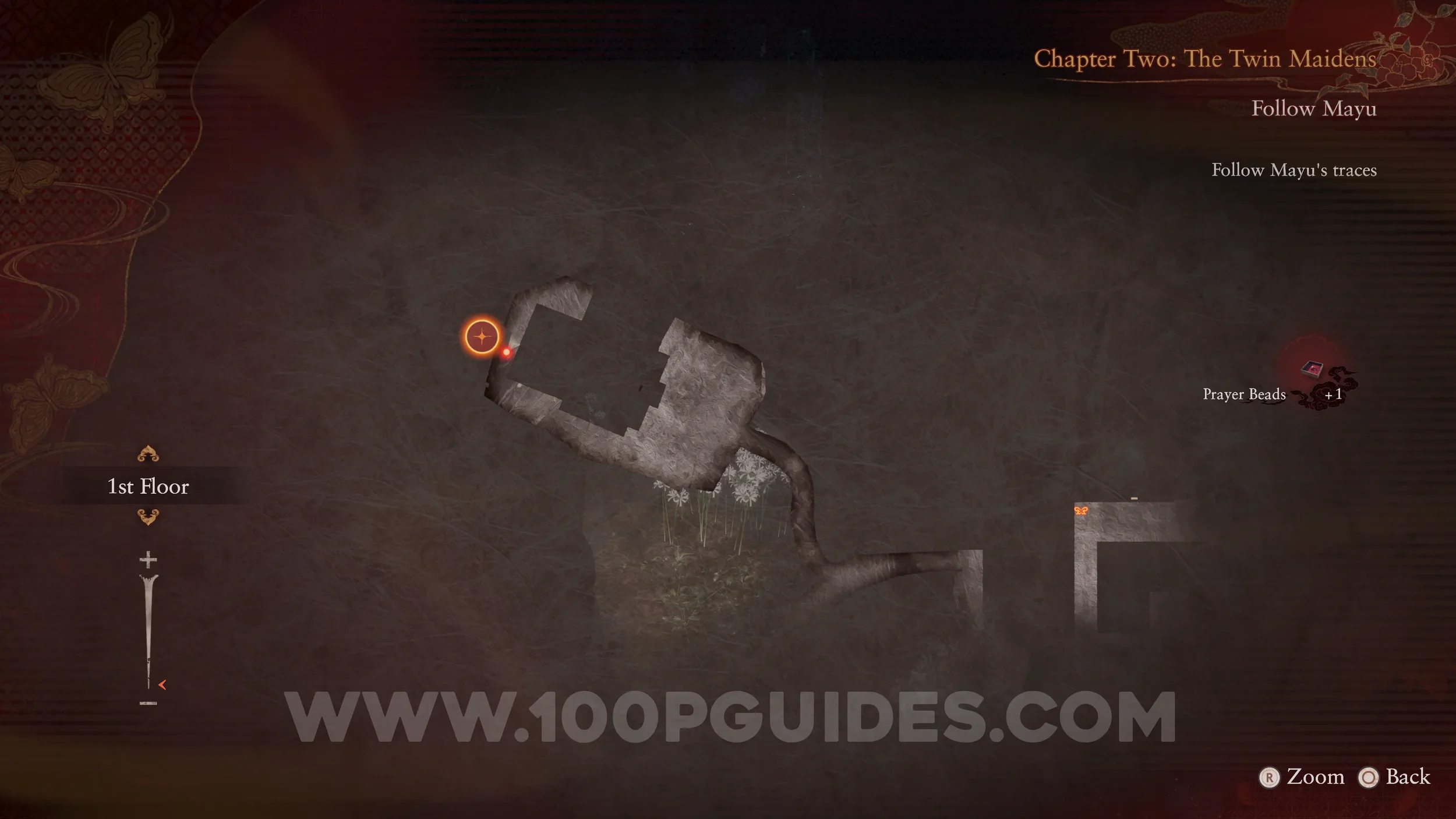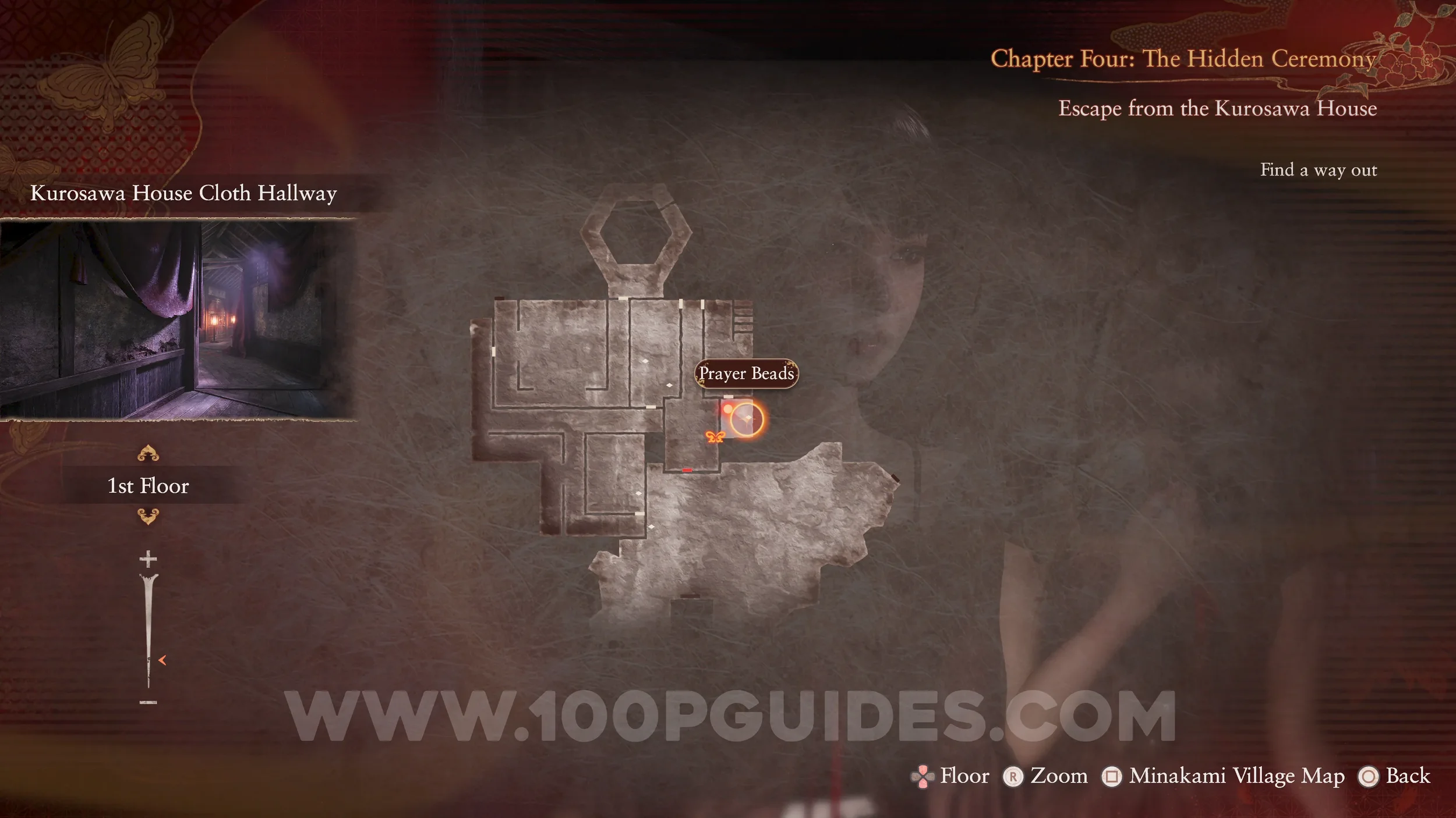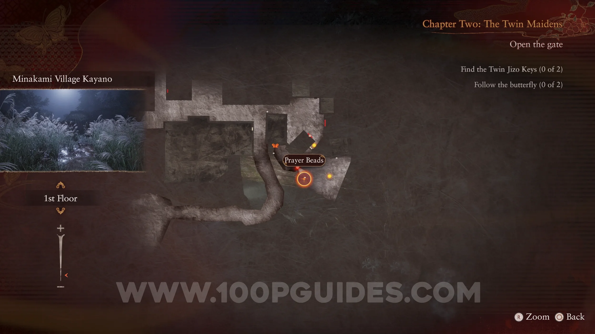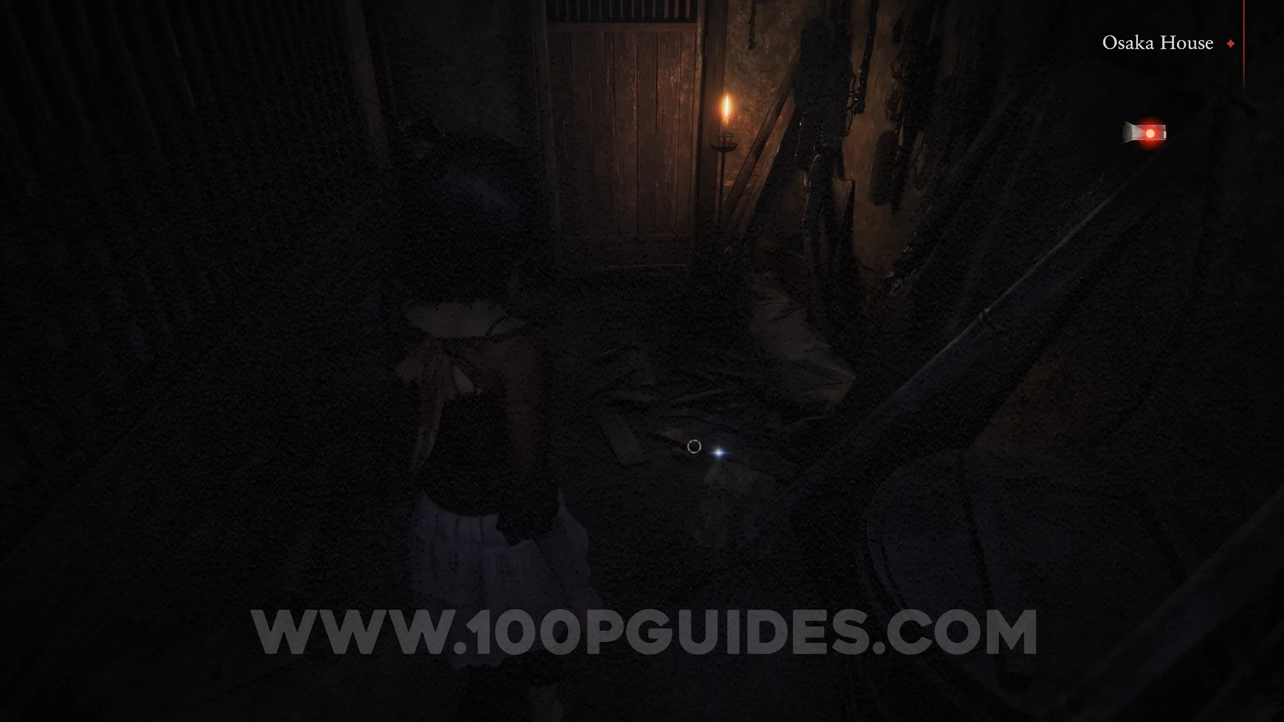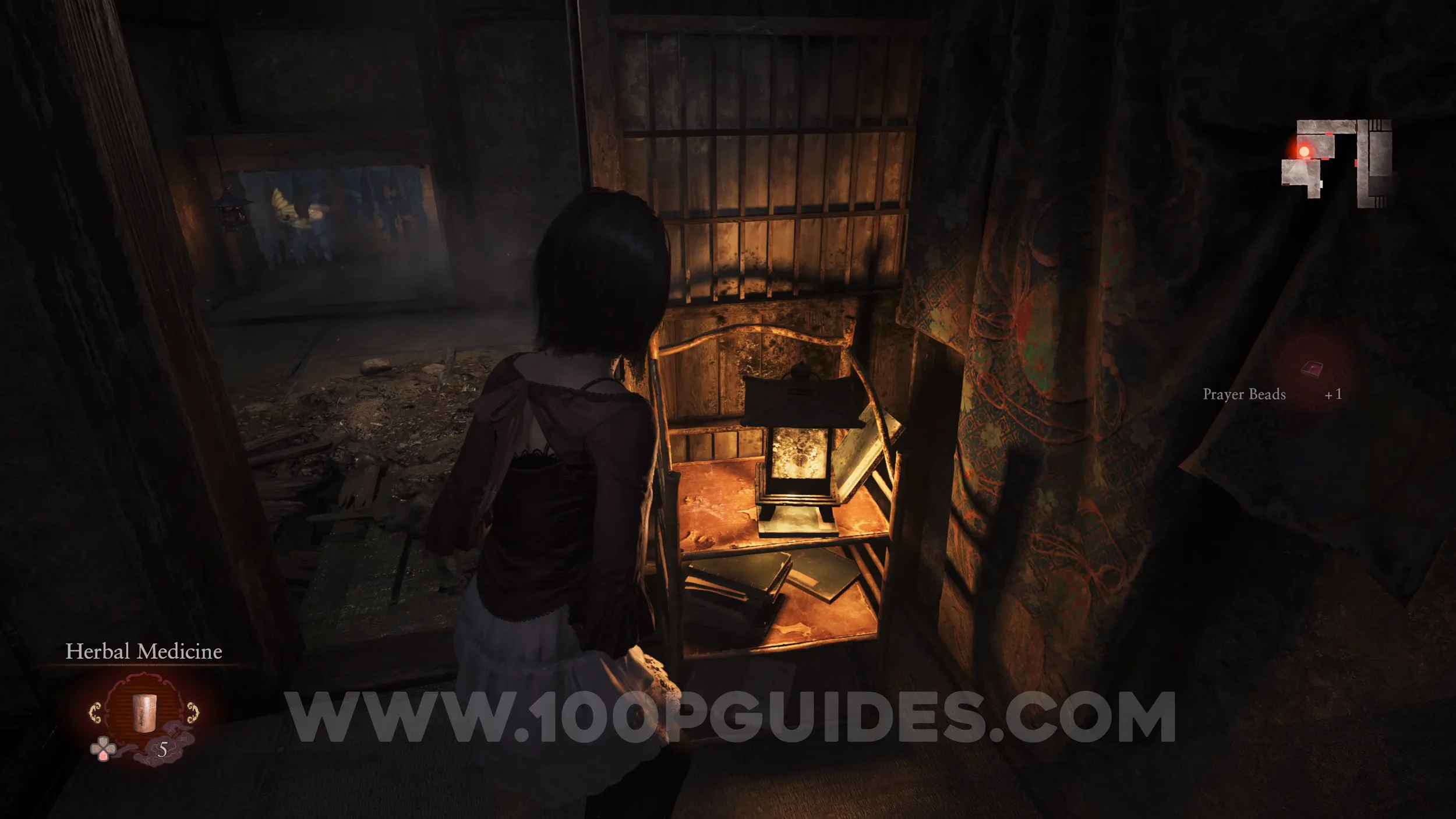 Prayer Beads #1. After leaving the Osaka House, go around the left corner and follow the path west. Continue up the hill to reach a temple. The bead can be found behind the temple. I recommend using it to unlock the Zoom feature for the Camera Obscura, as some of the upcoming Twin Dolls will require it. If you do not have it yet, you can return later.