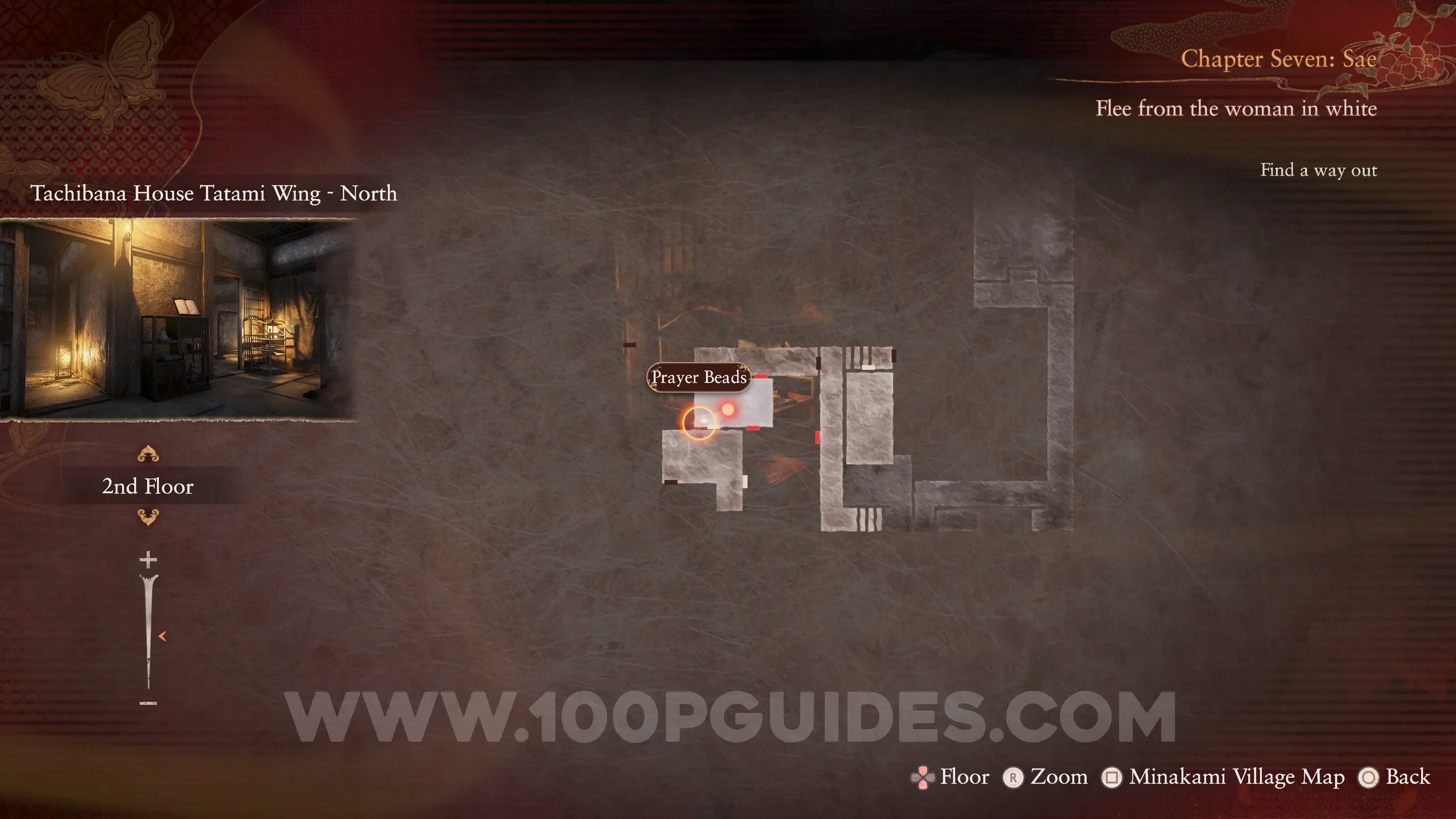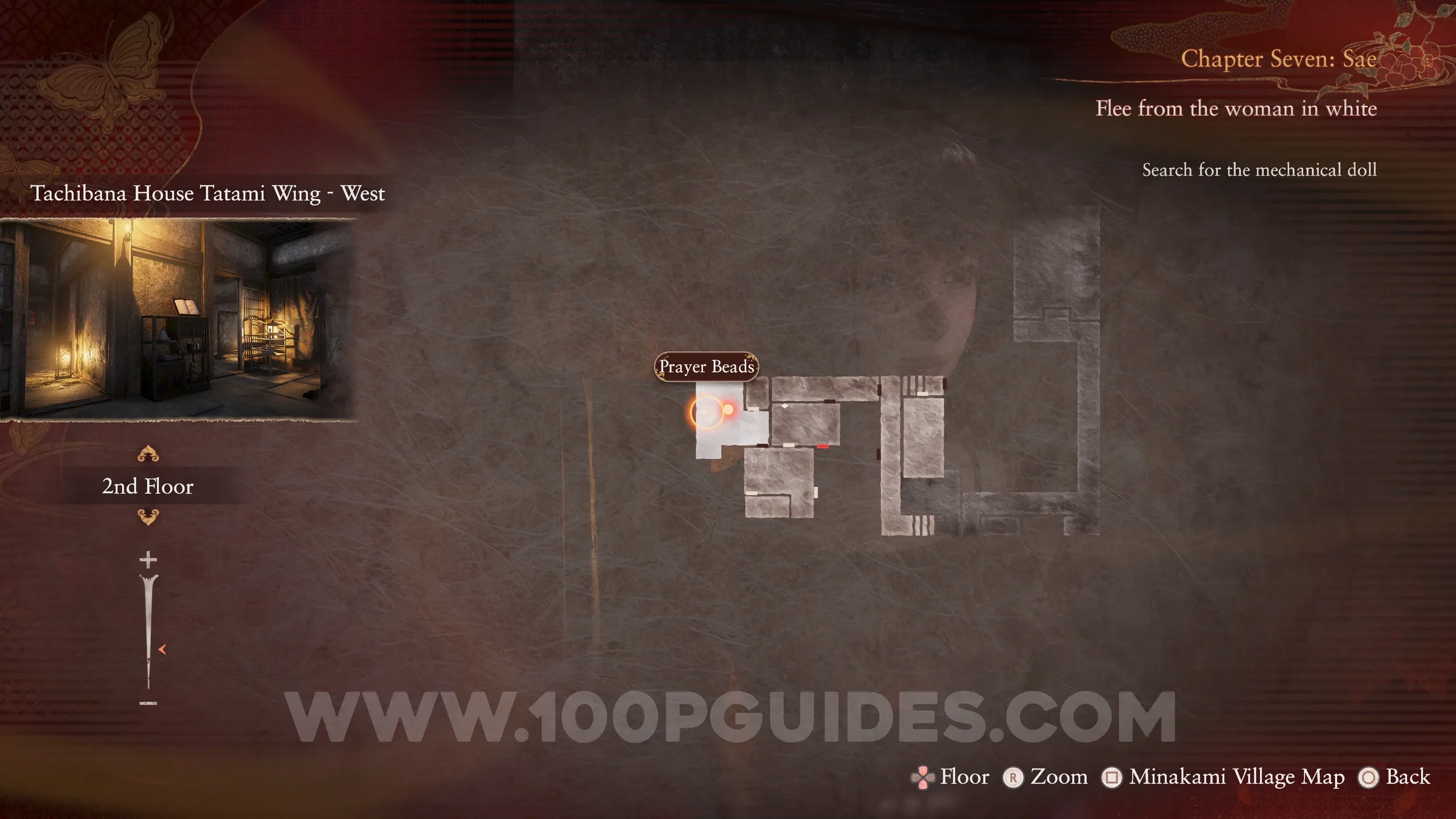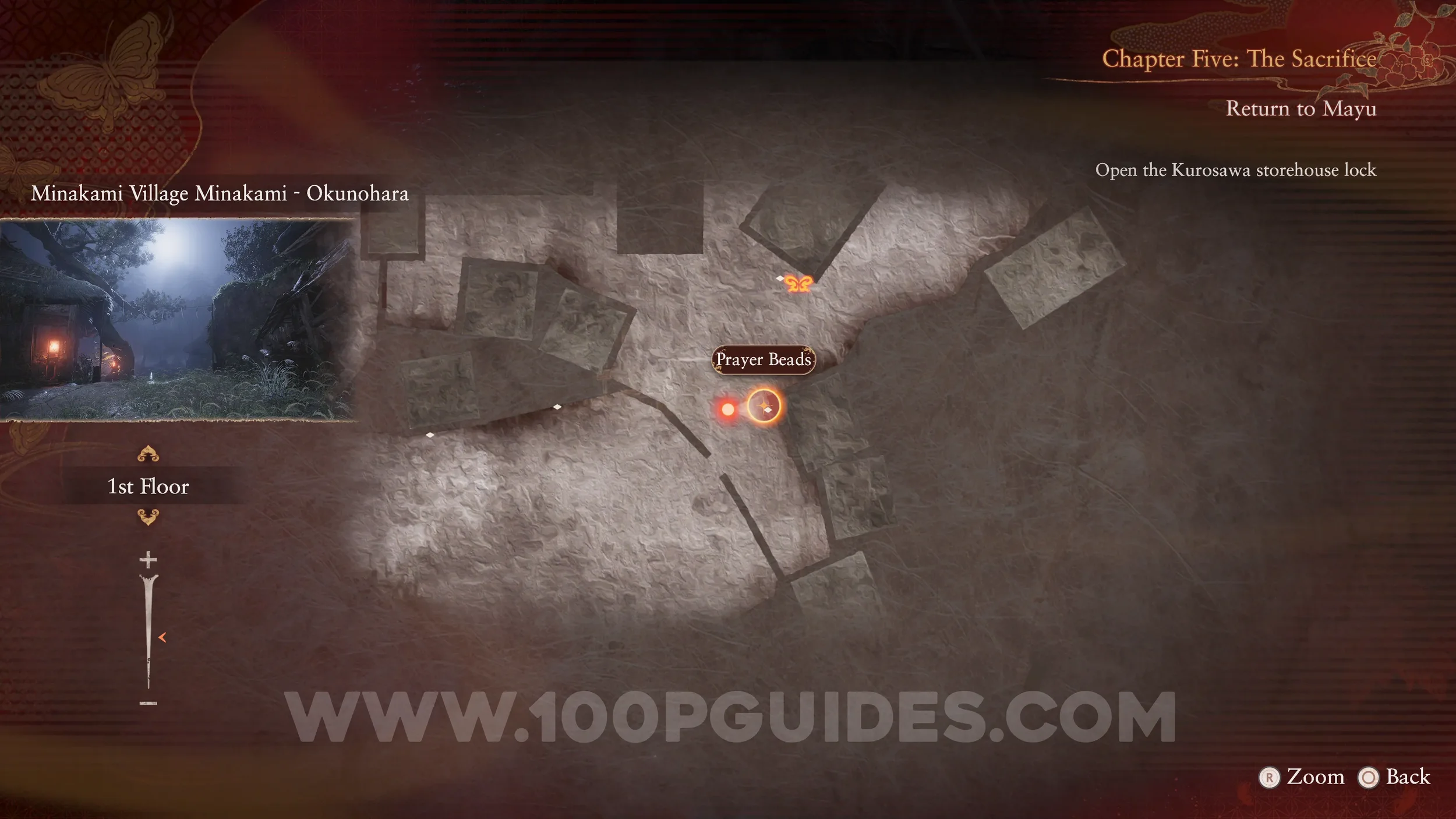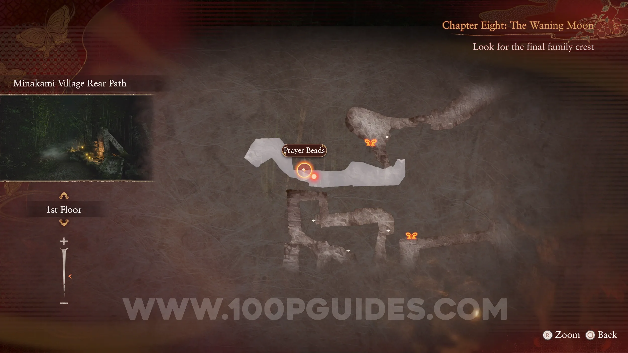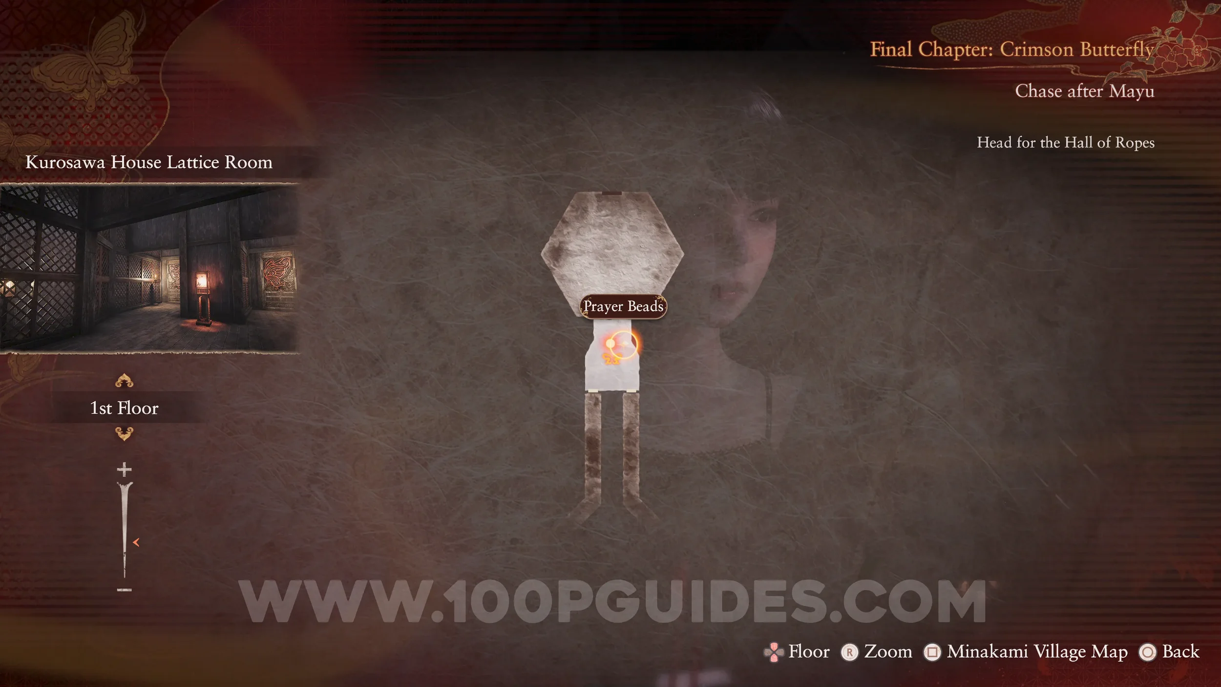 Prayer Beads #1. After leaving the Osaka House, go around the left corner and follow the path west. Continue up the hill to reach a temple. The bead can be found behind the temple. I recommend using it to unlock the Zoom feature for the Camera Obscura, as some of the upcoming Twin Dolls will require it. If you do not have it yet, you can return later.