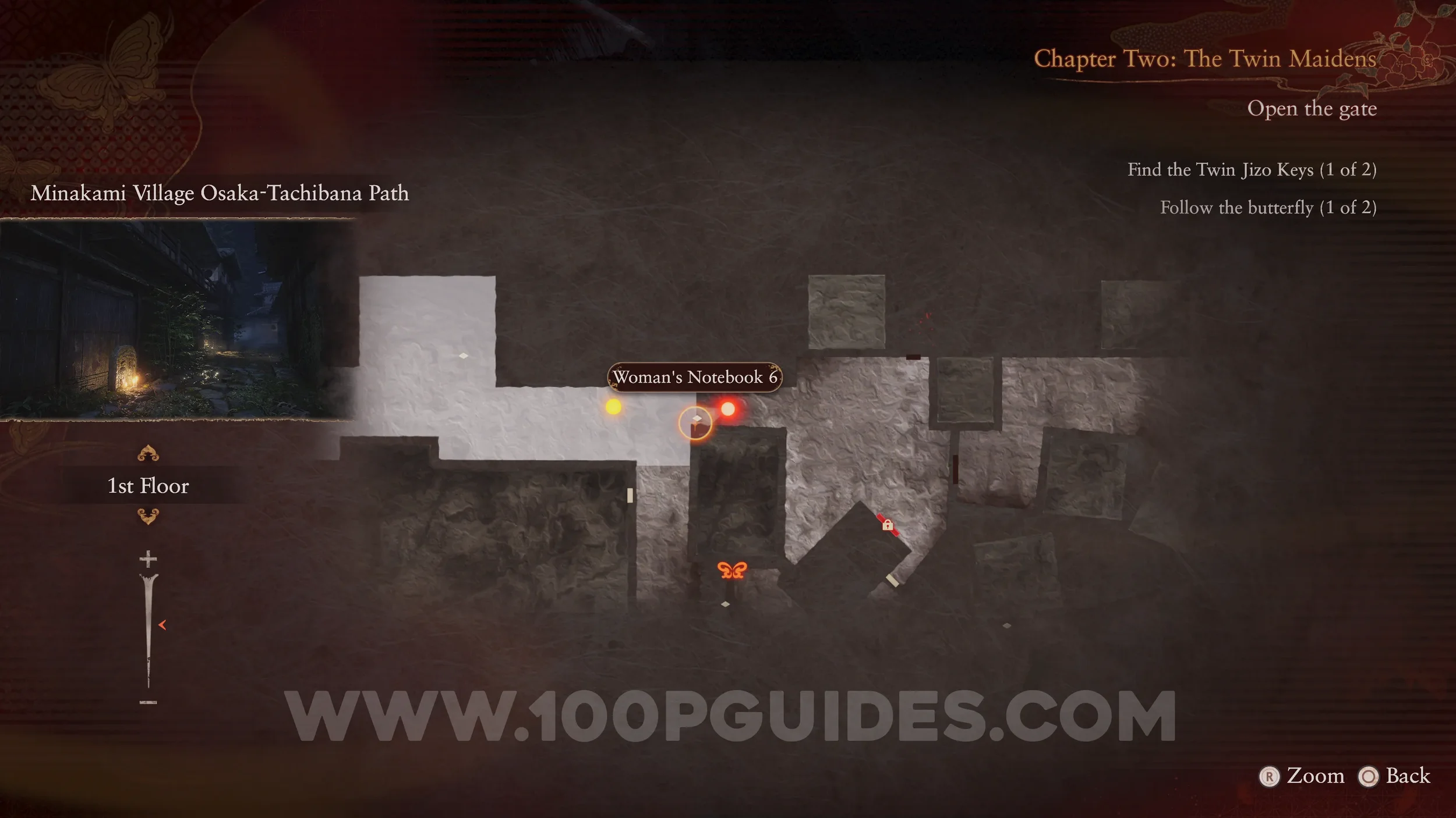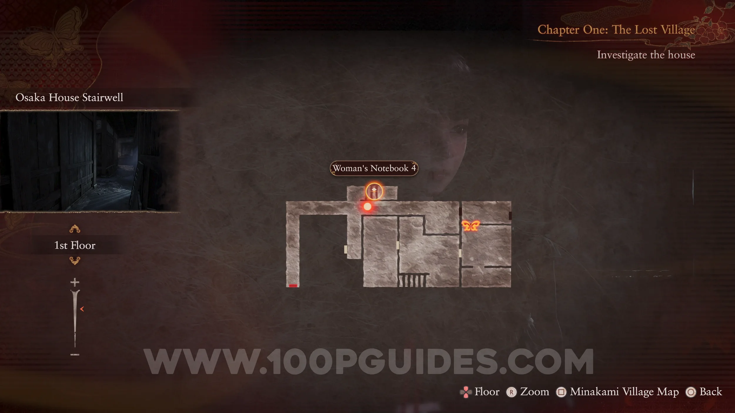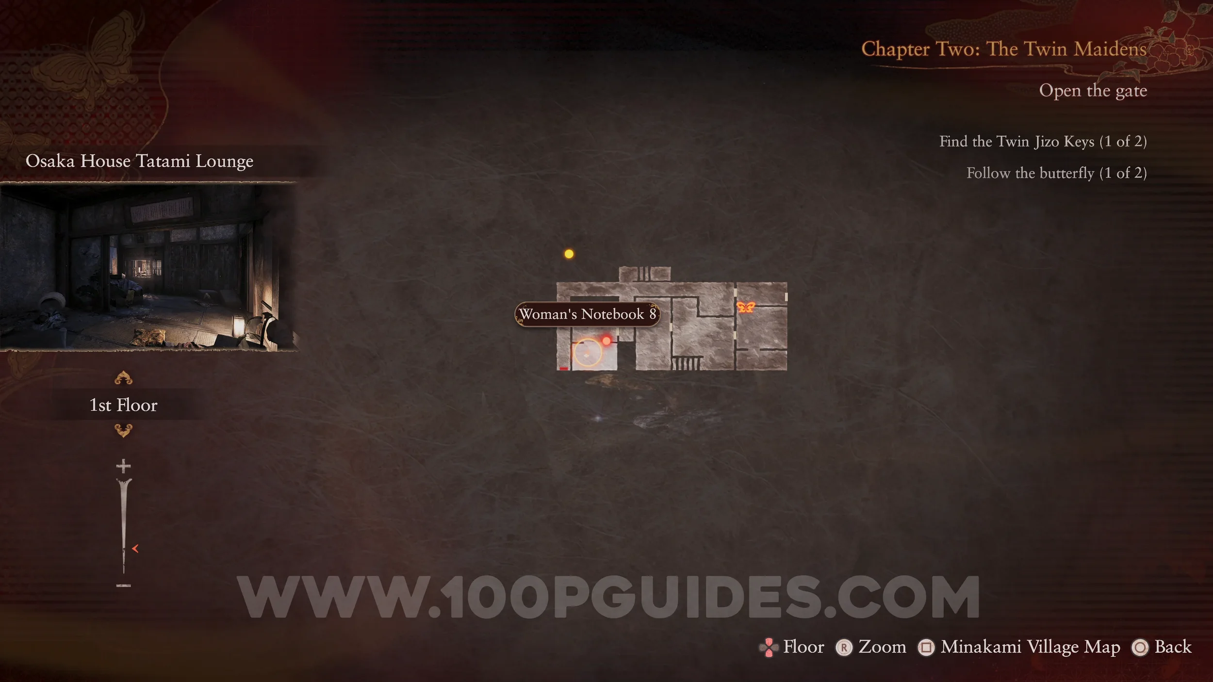 Document #14 - Woman’s Notebook 6, Spirit Stone #5 - Zoisite (1/2), Specter #20 - 165 Woman Adrift and Side Quest #2 - Miyako Sudo. Found on the ground in the street just before reaching the Osaka House while following the second butterfly. The specter will spawn in front of you after picking it up. This will start the “Miyako Sudo” side quest.