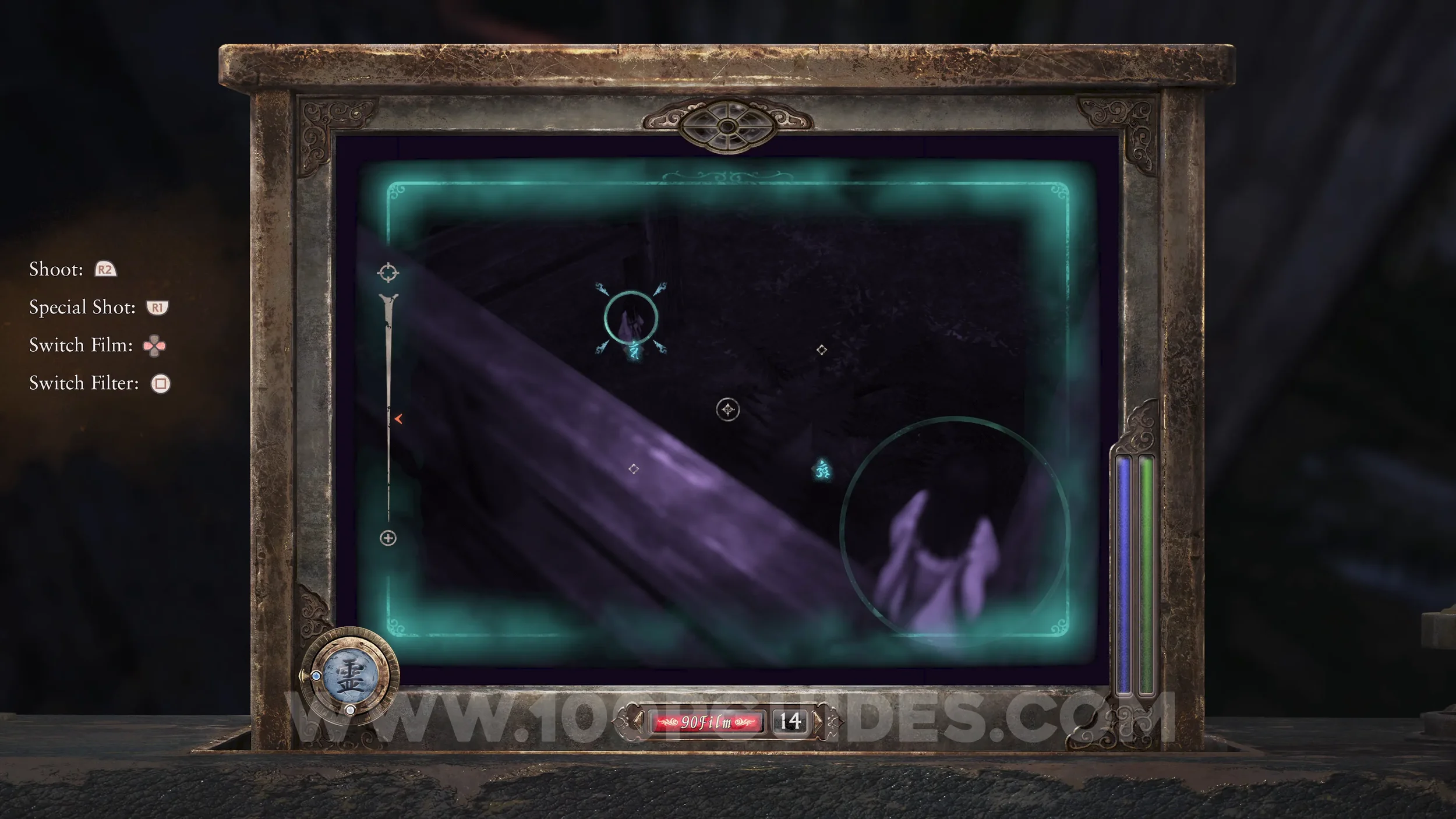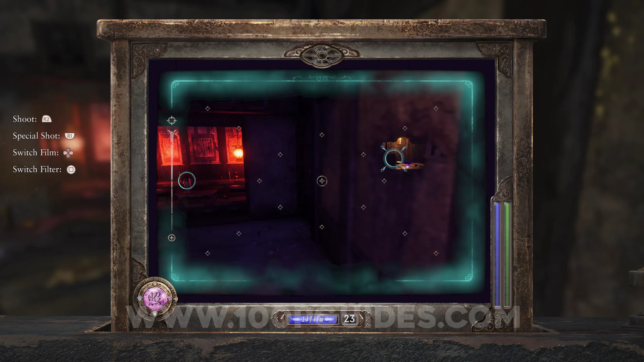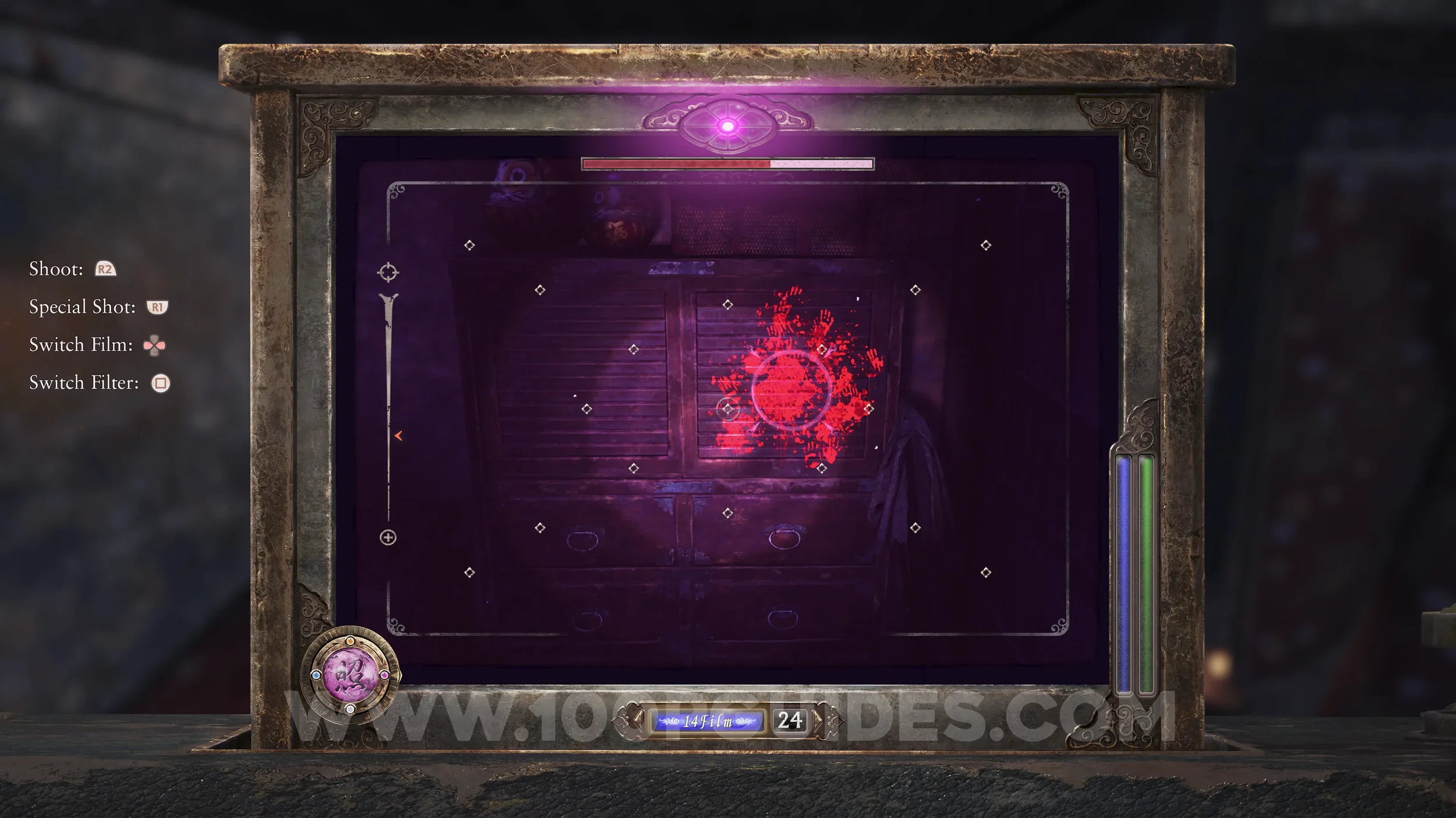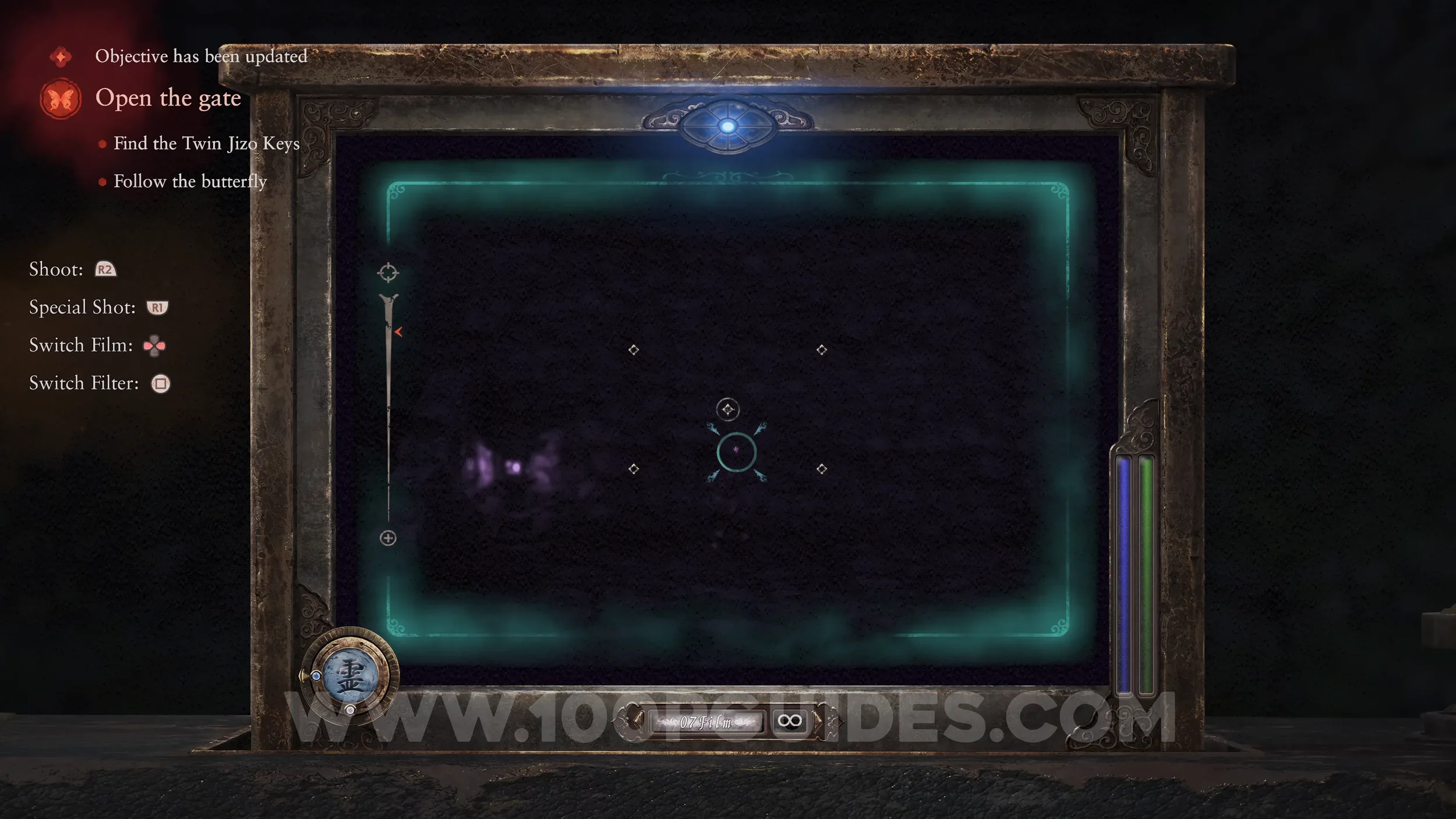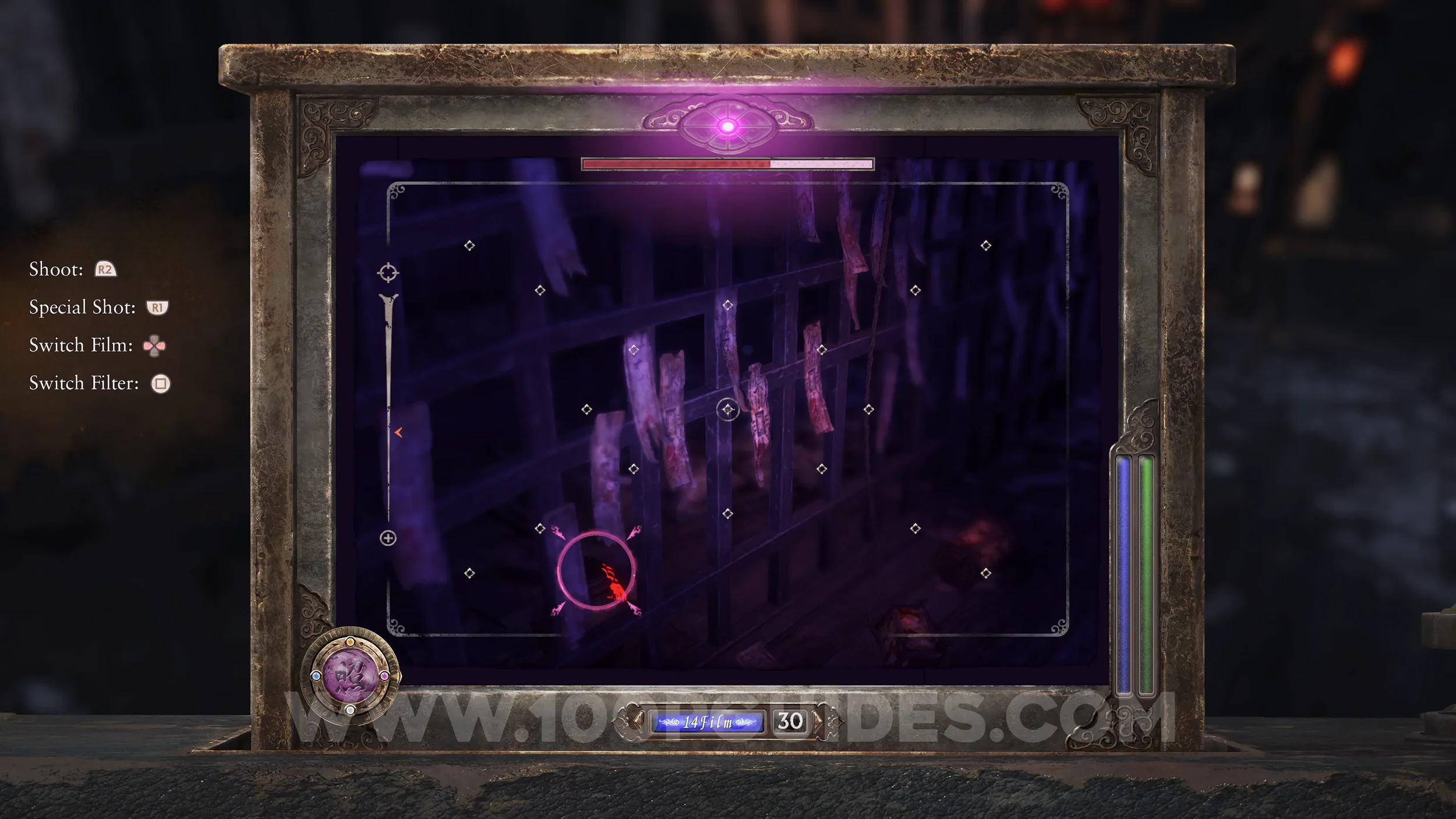 Specter #13 - 016 Beckoning Crimson Butterfly. After examining the gate just past the save point, turn around and look through the camera to see the Specter Butterfly.