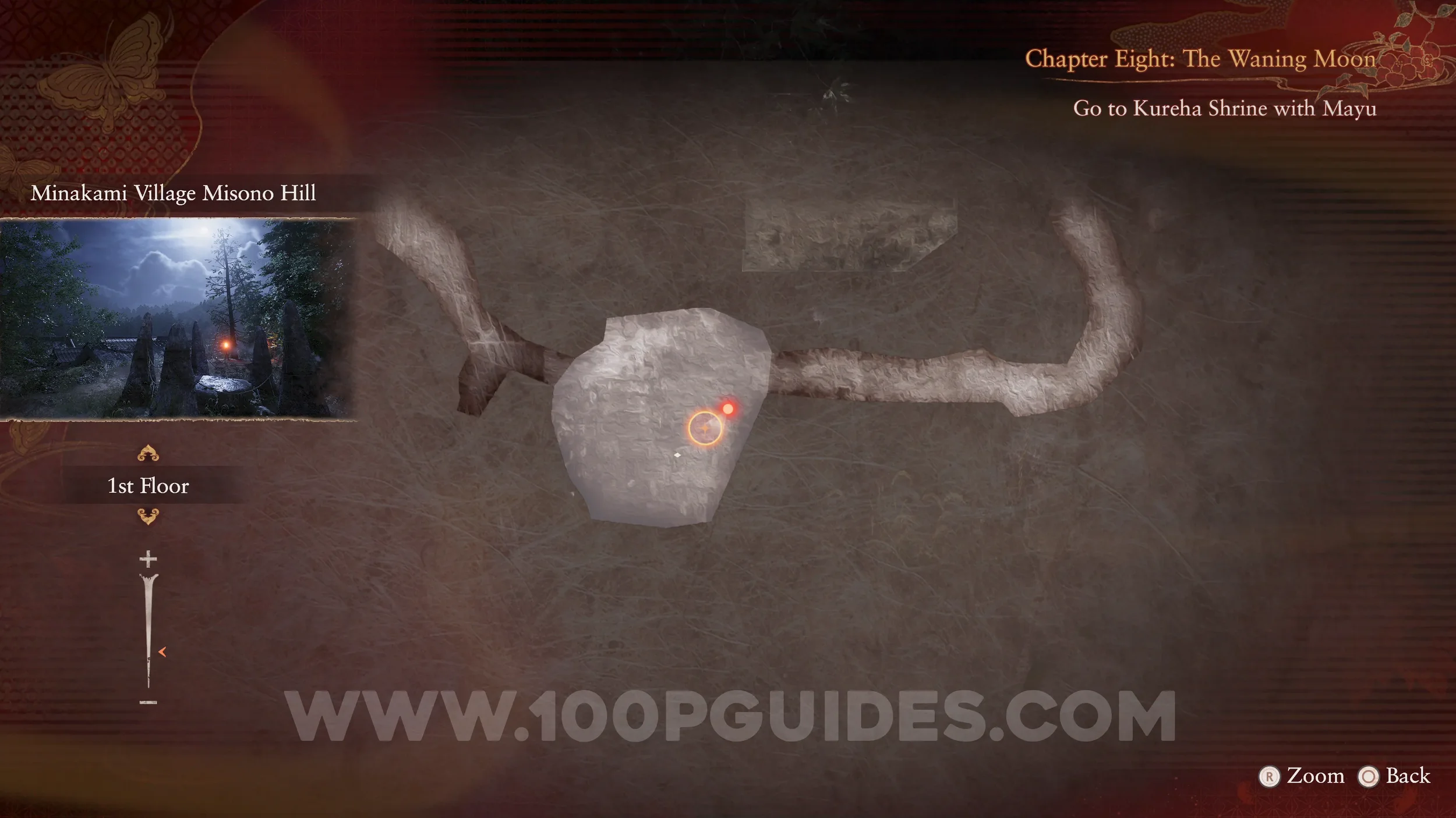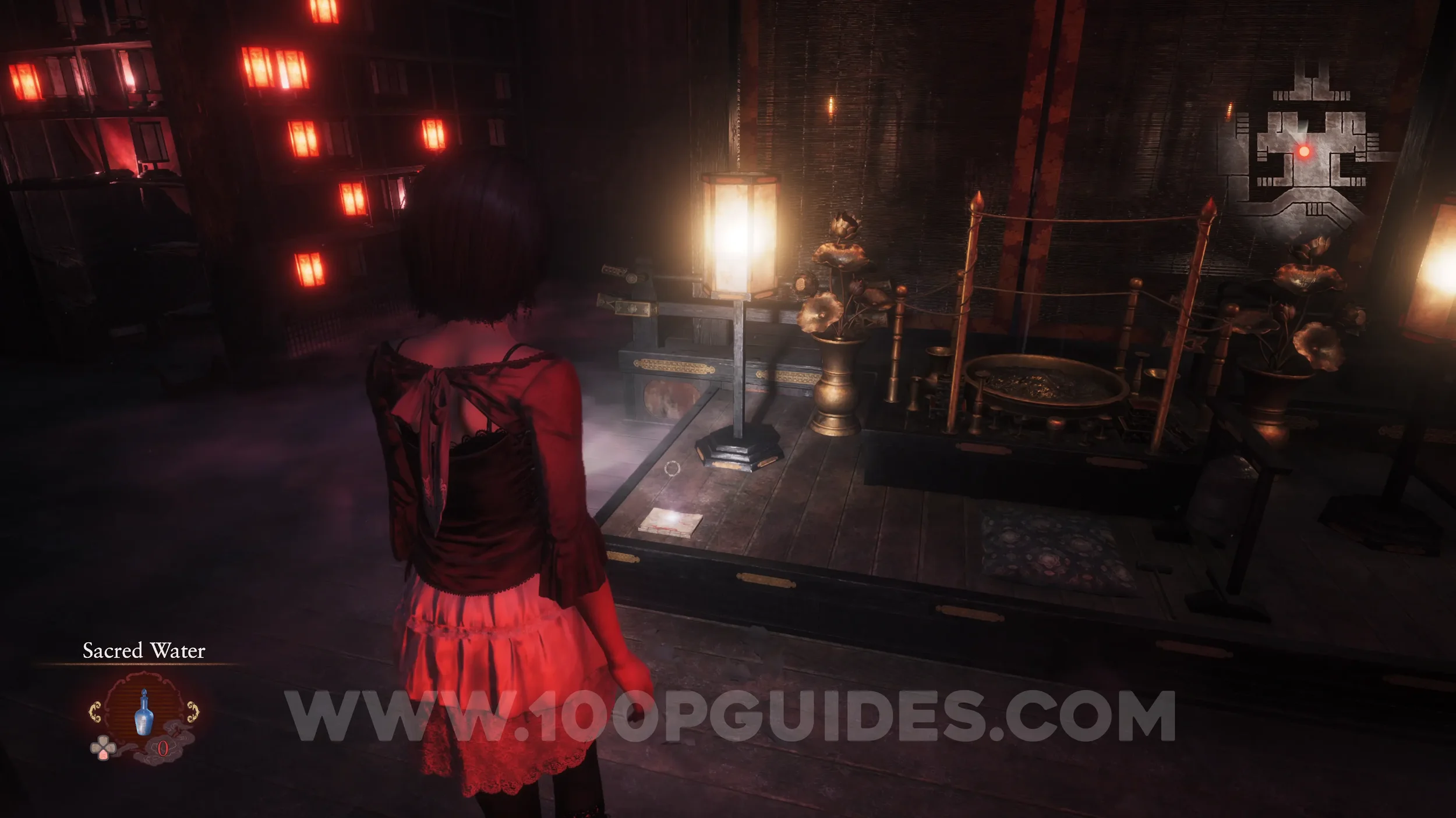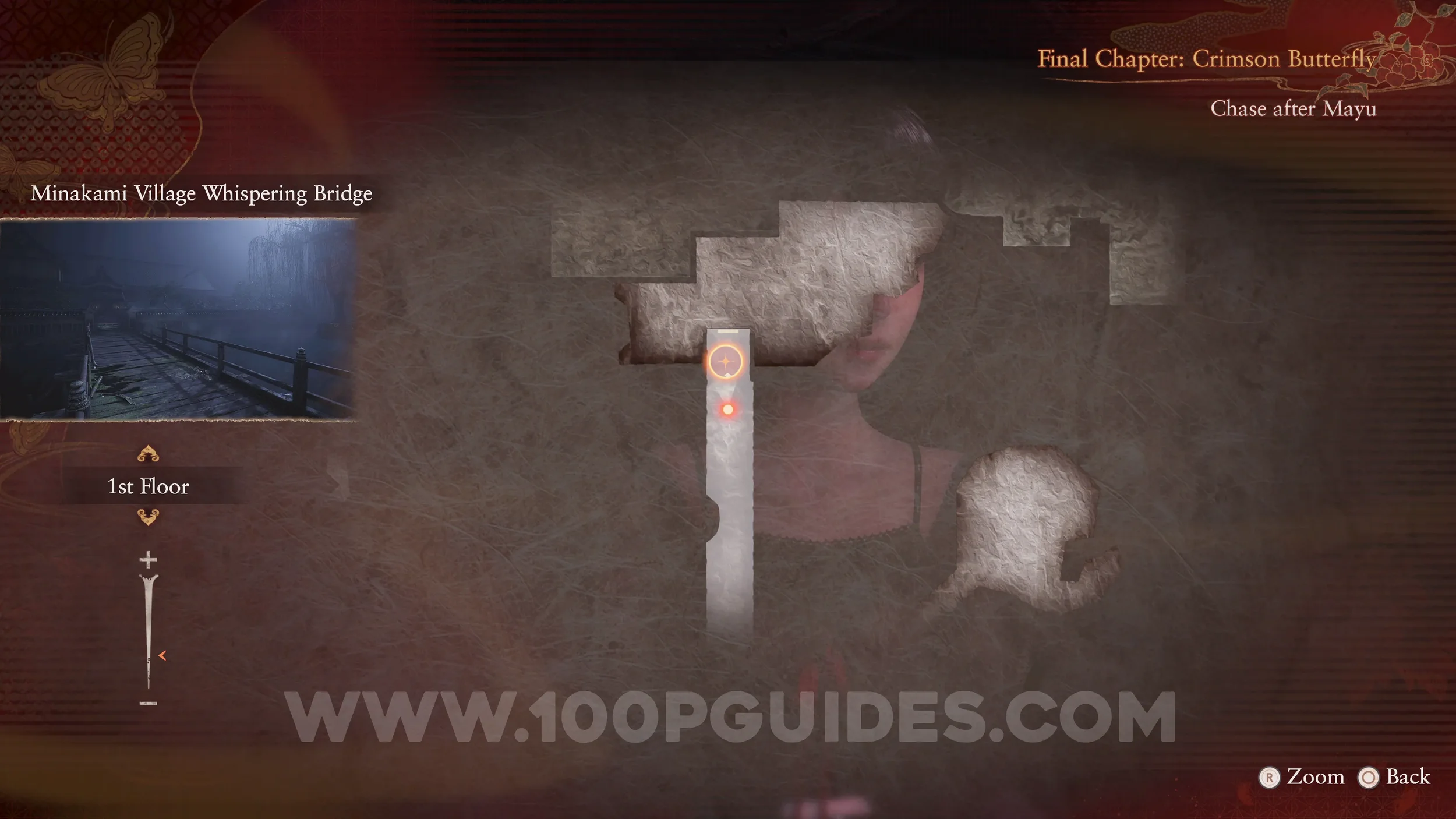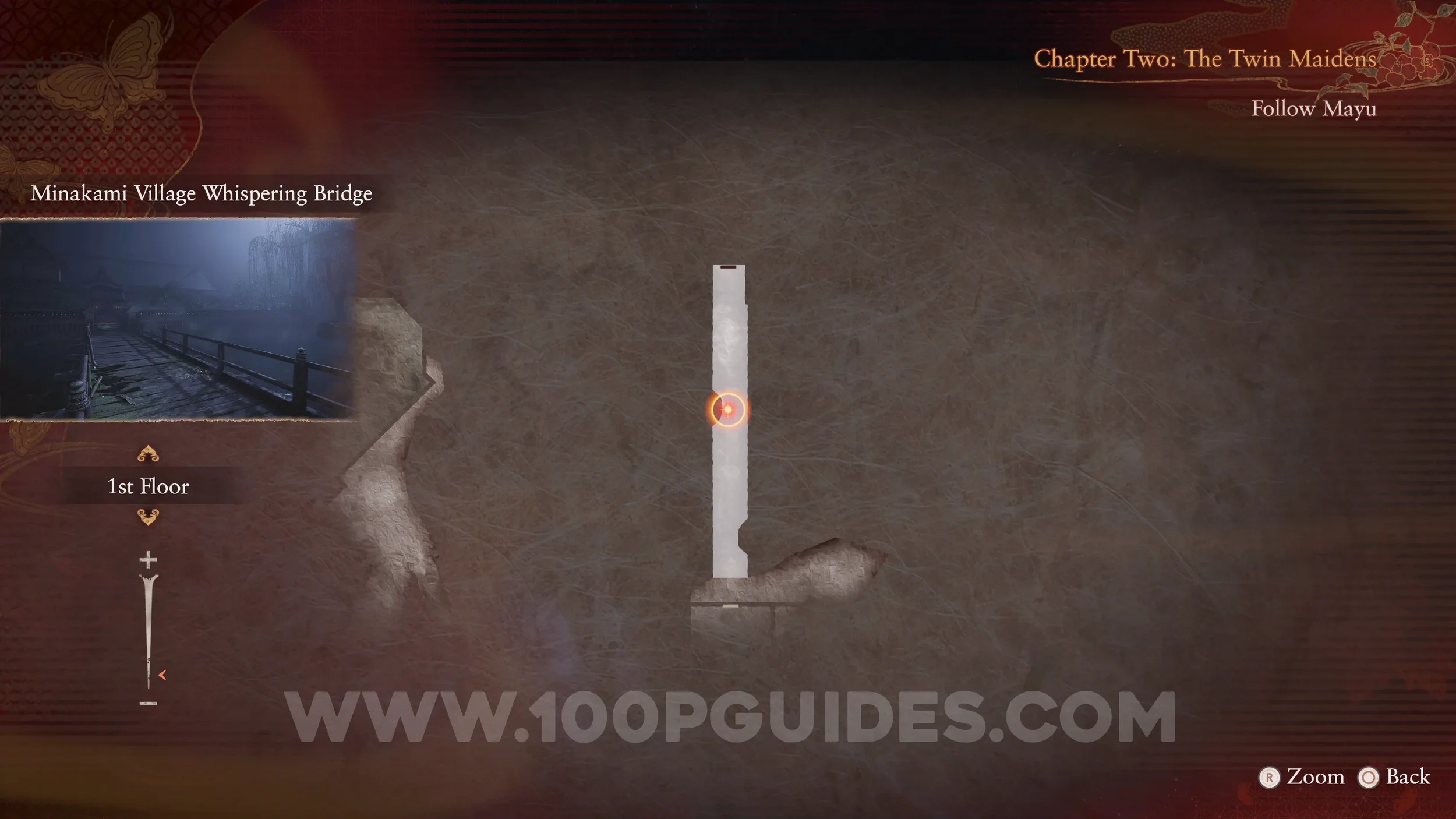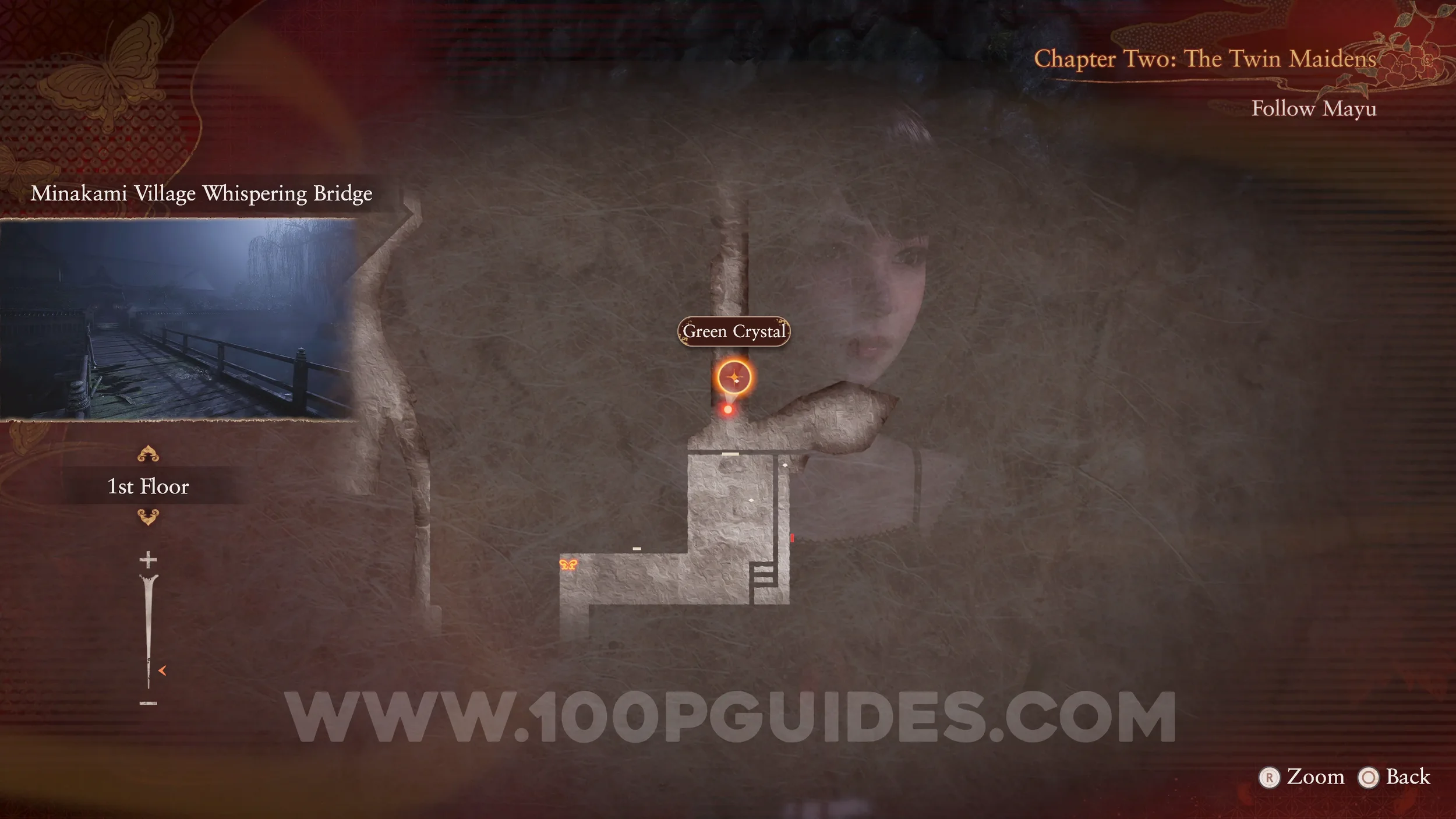 Specter #195 - 232 Girl in Waiting, Spirit Stone #36 - Pale Crimson Crystal (1/2) and Side Quest #11 - Azami Kiryu. On the wooden bridge as you leave Eikado Temple after finishing the Children at Play side quest.