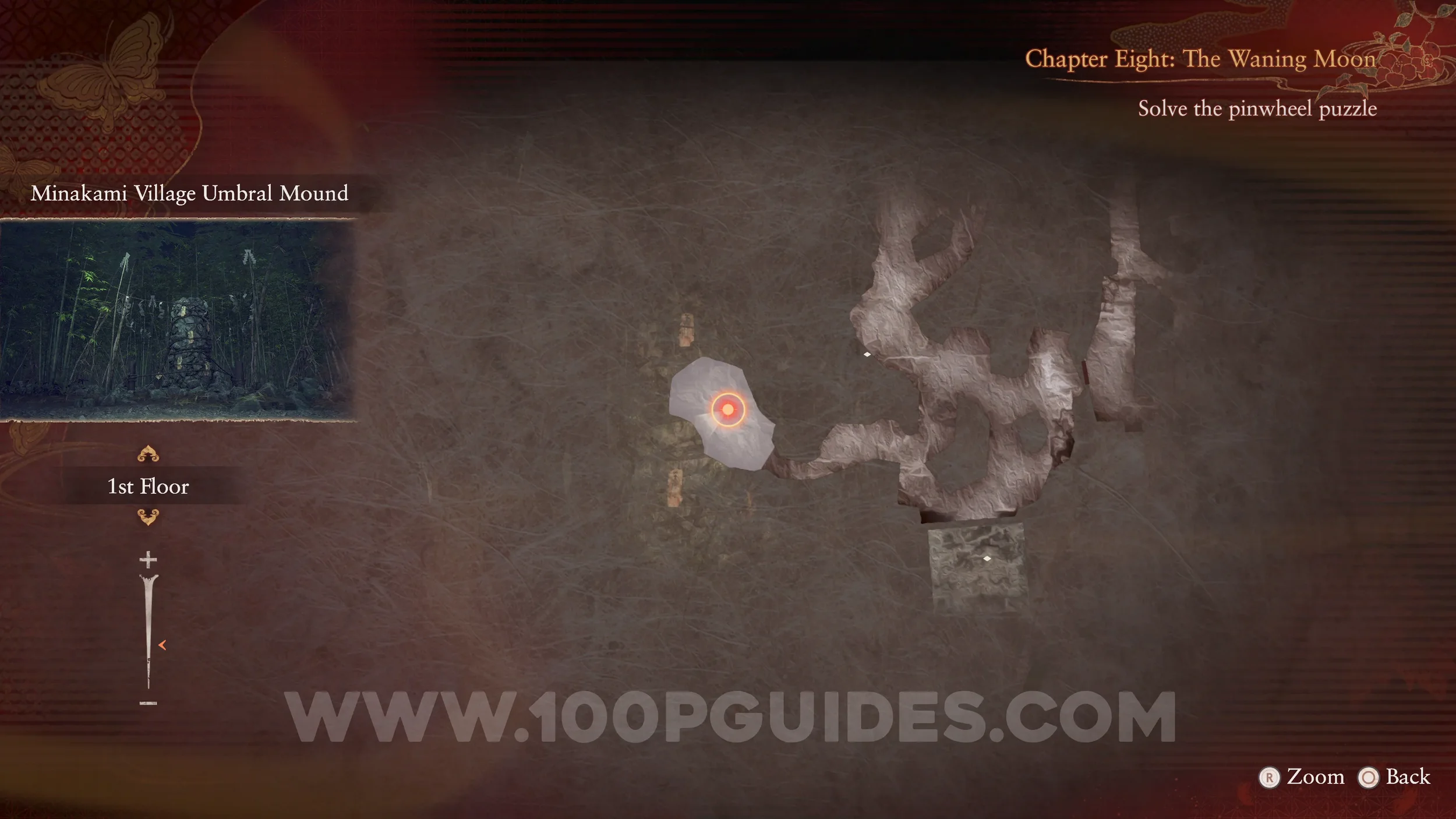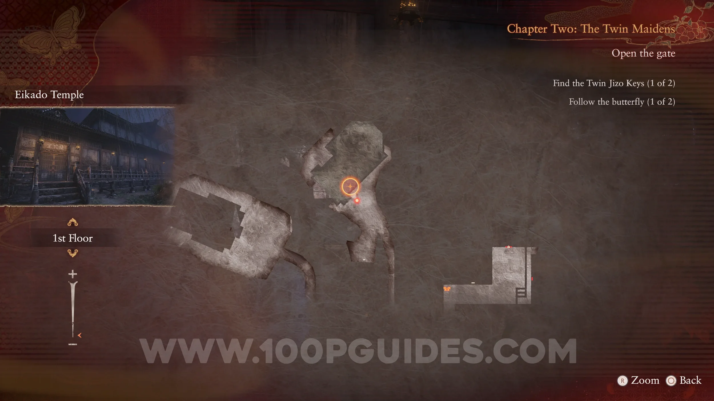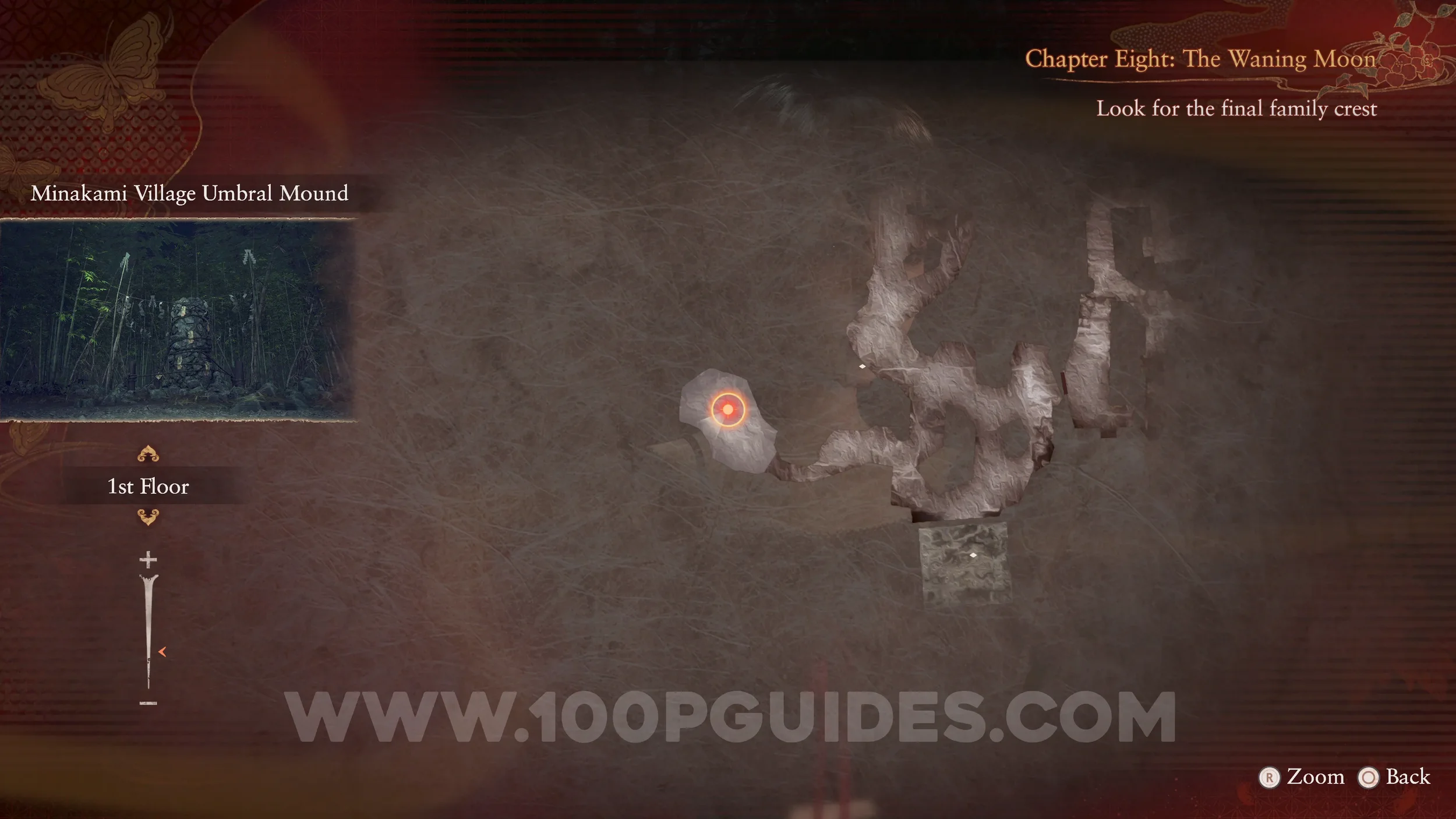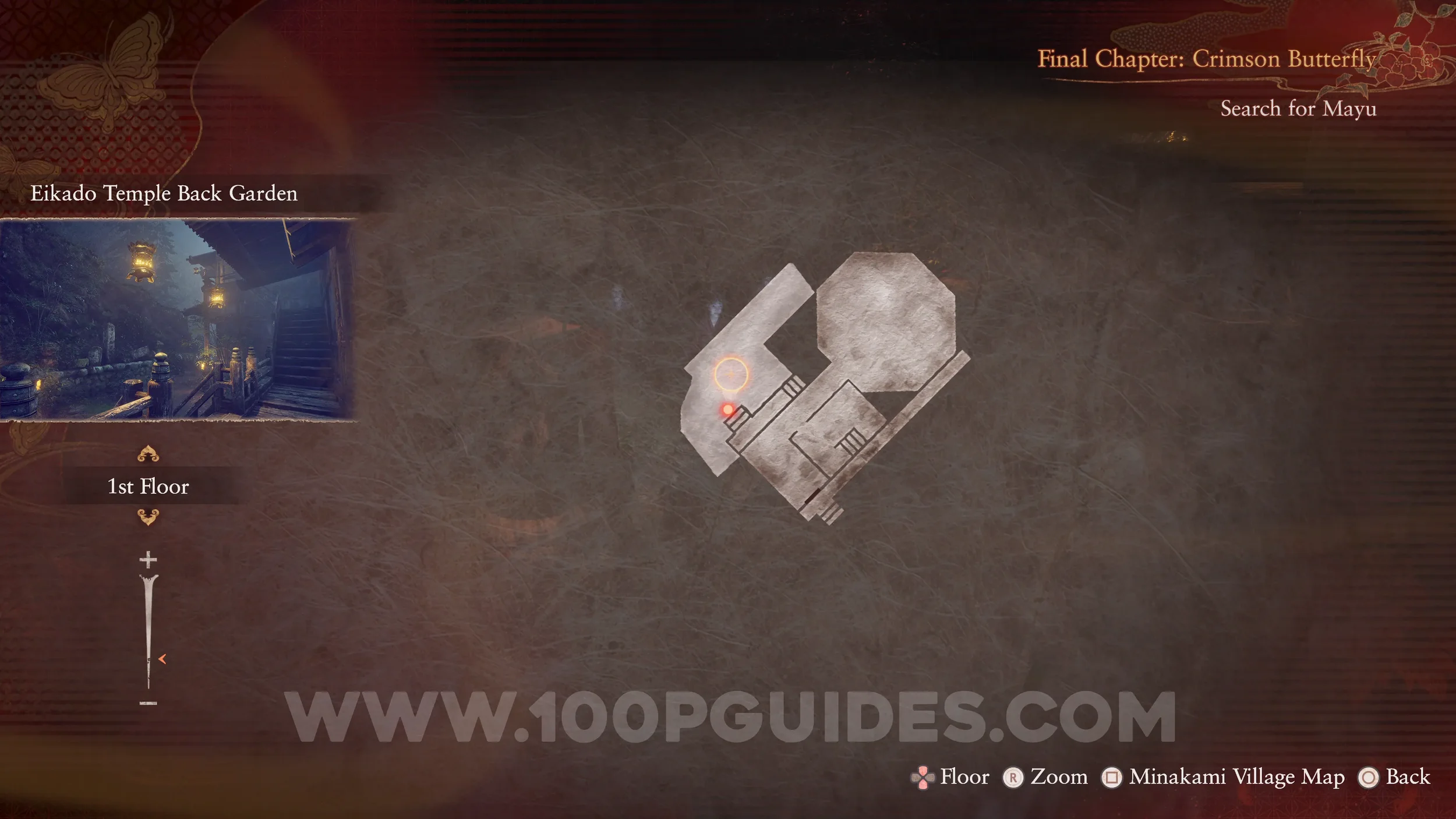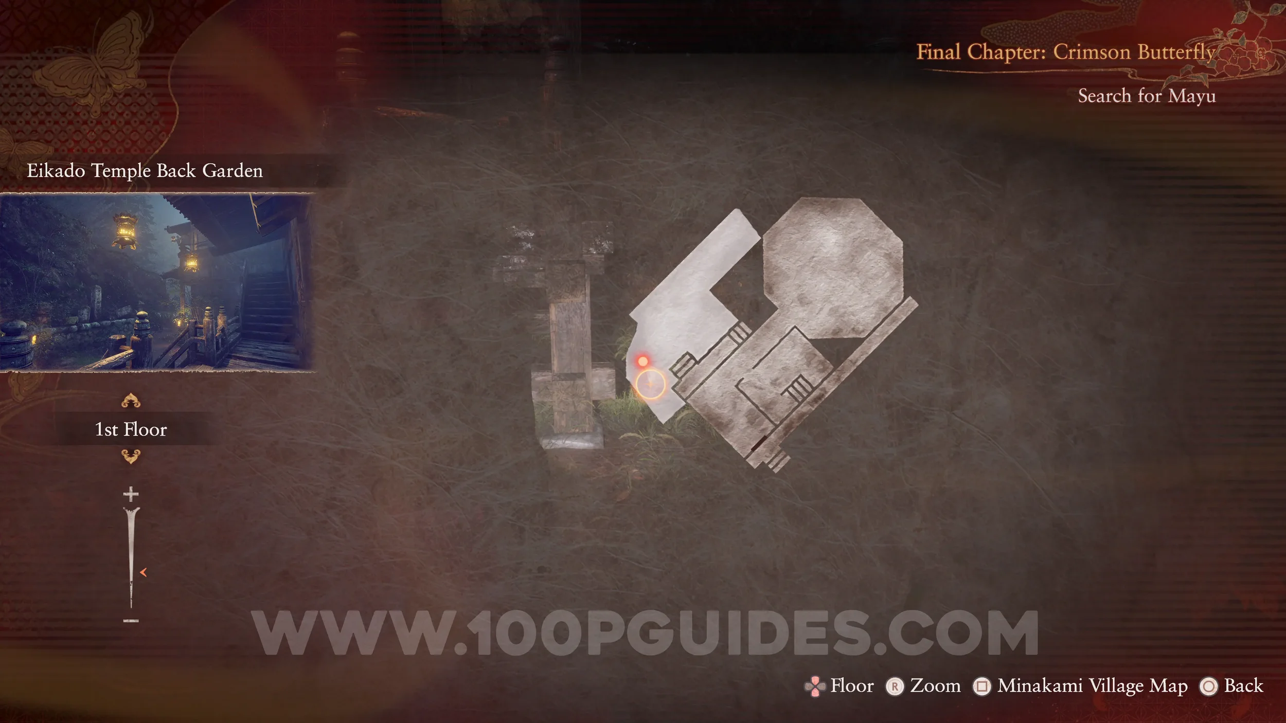 Specter #195 - 232 Girl in Waiting, Spirit Stone #36 - Pale Crimson Crystal (1/2) and Side Quest #11 - Azami Kiryu. On the wooden bridge as you leave Eikado Temple after finishing the Children at Play side quest.