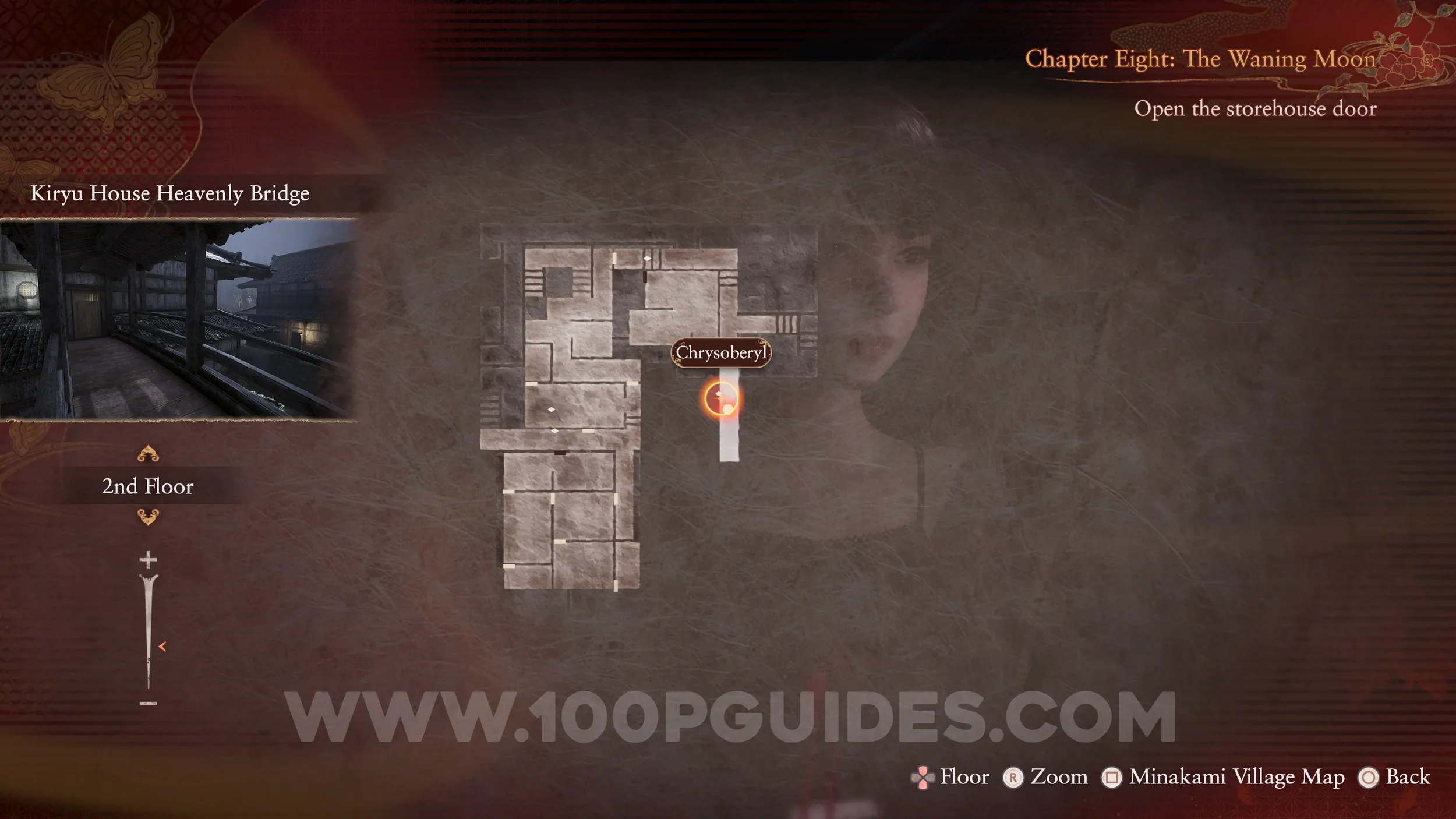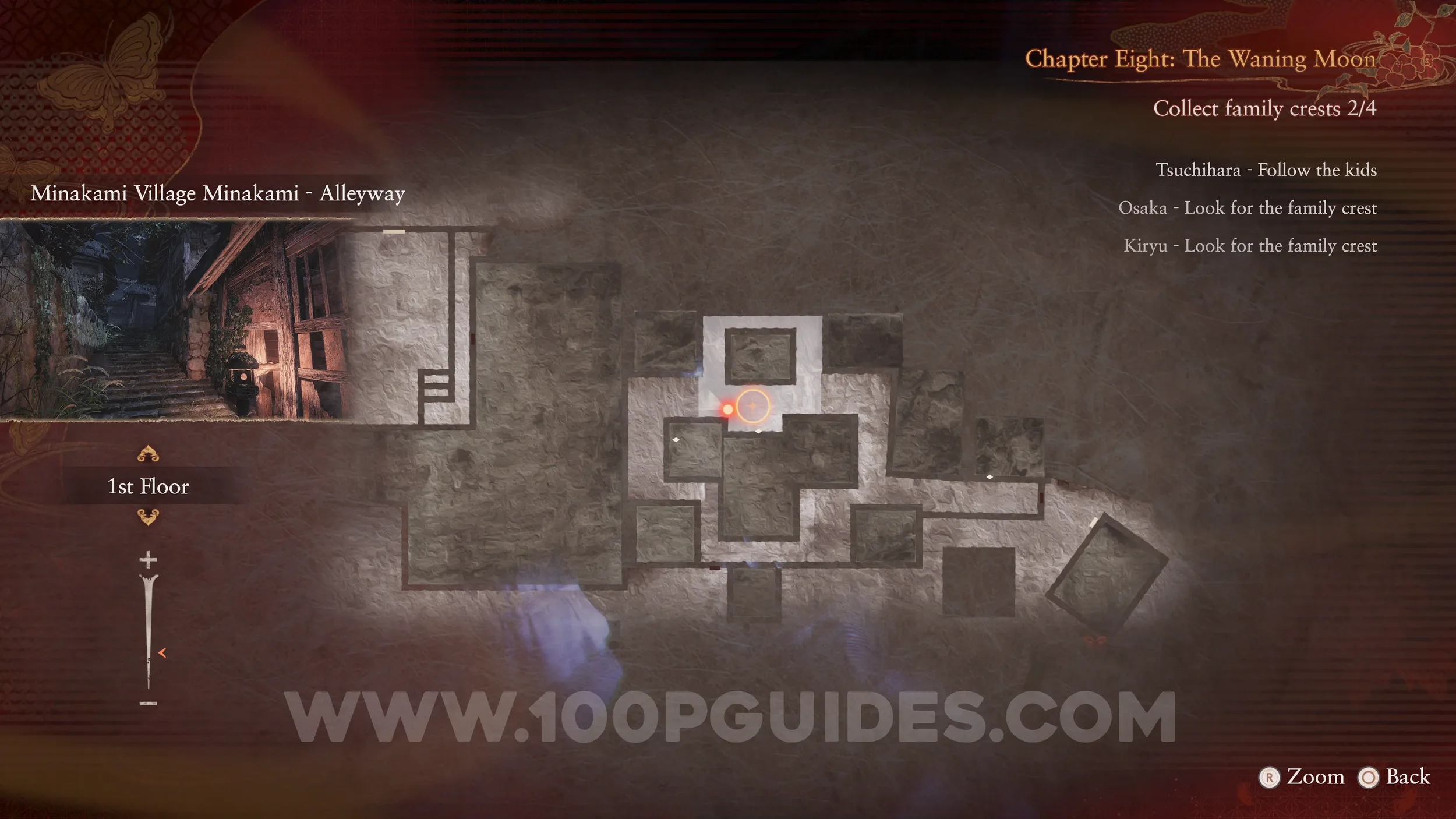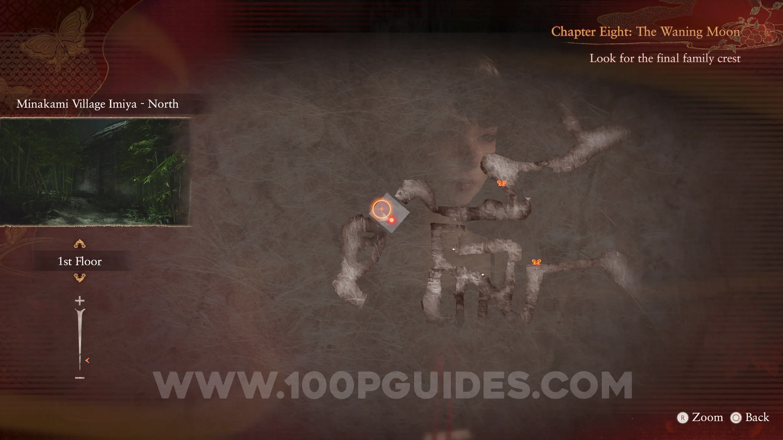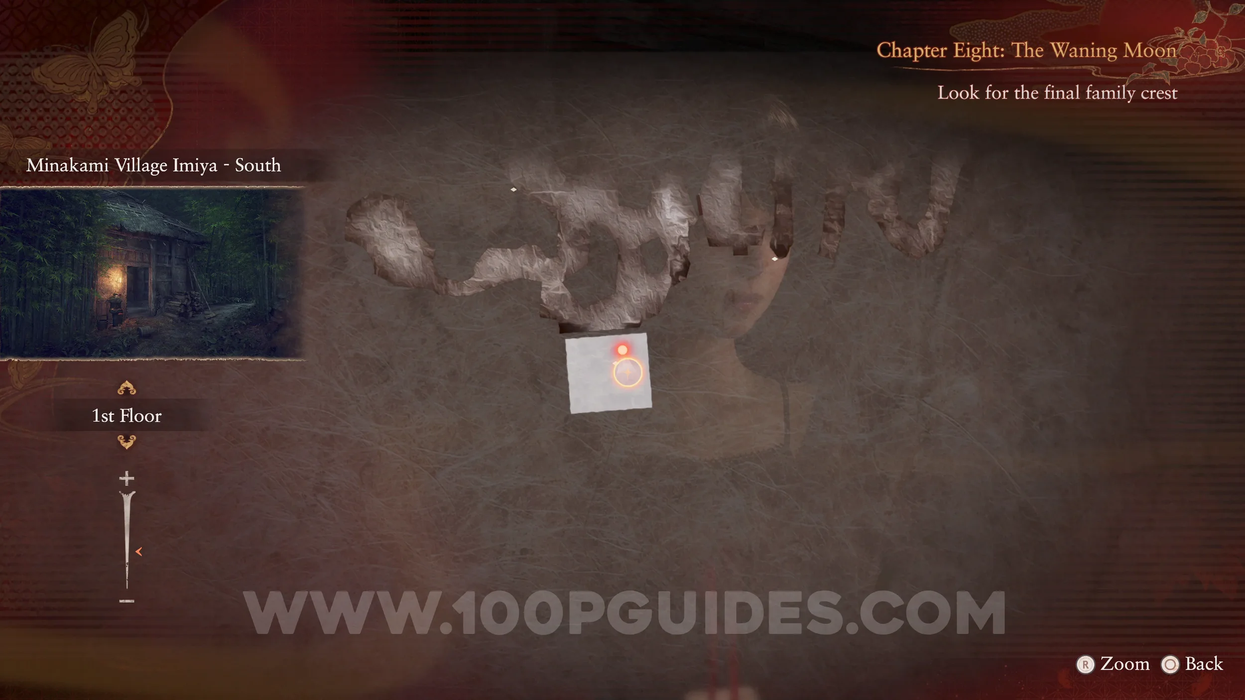 Specter #195 - 232 Girl in Waiting, Spirit Stone #36 - Pale Crimson Crystal (1/2) and Side Quest #11 - Azami Kiryu. On the wooden bridge as you leave Eikado Temple after finishing the Children at Play side quest.