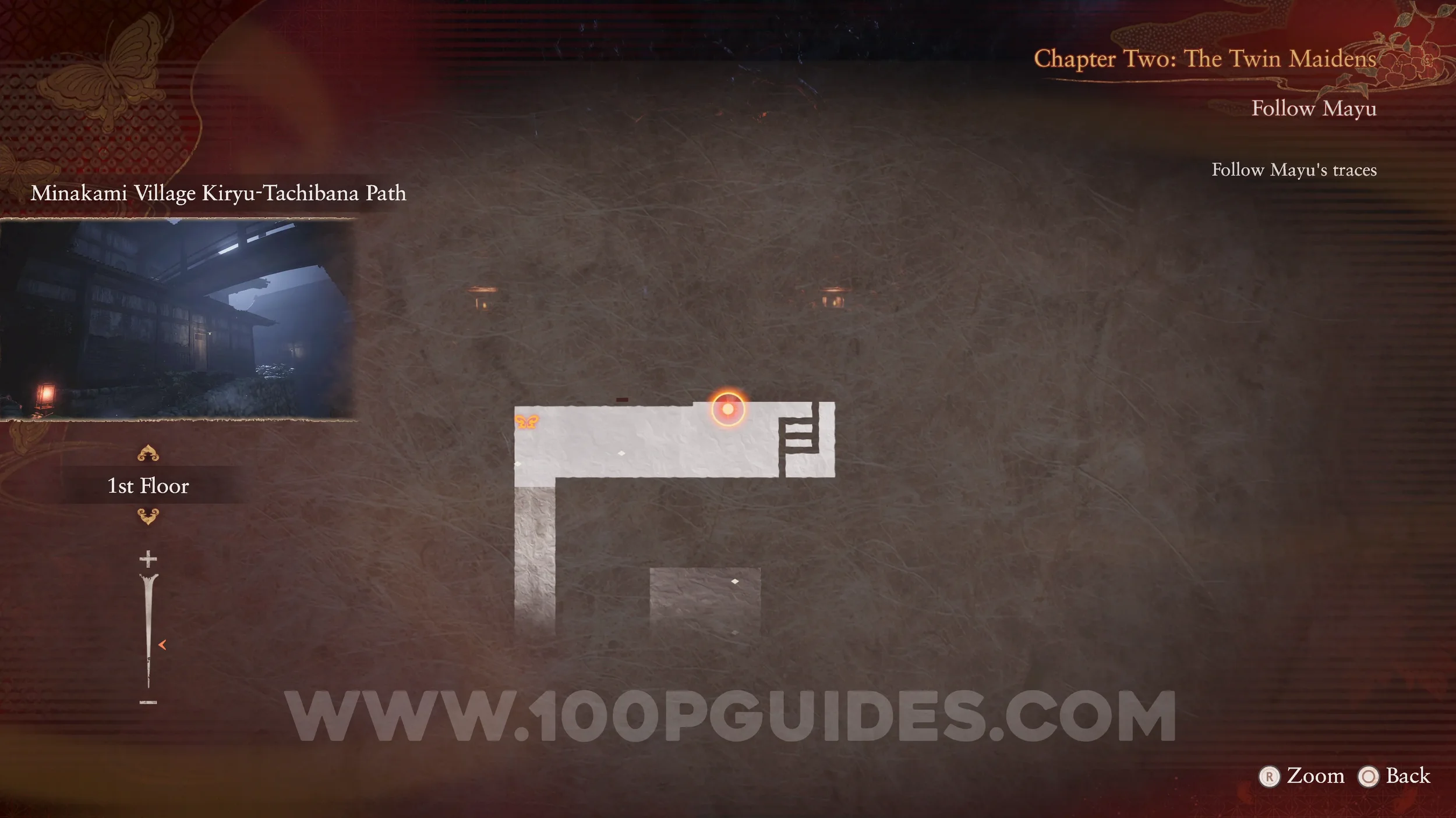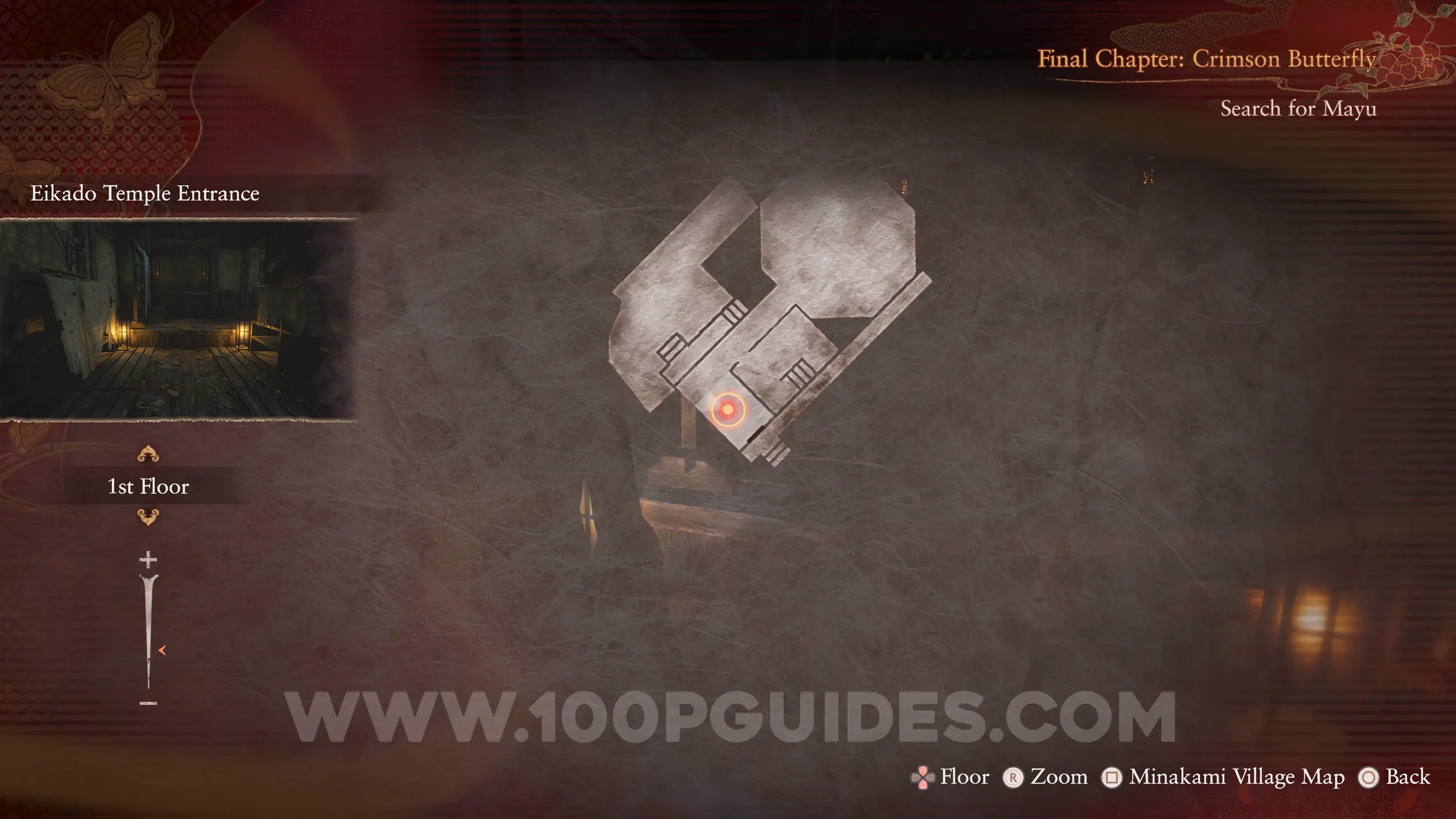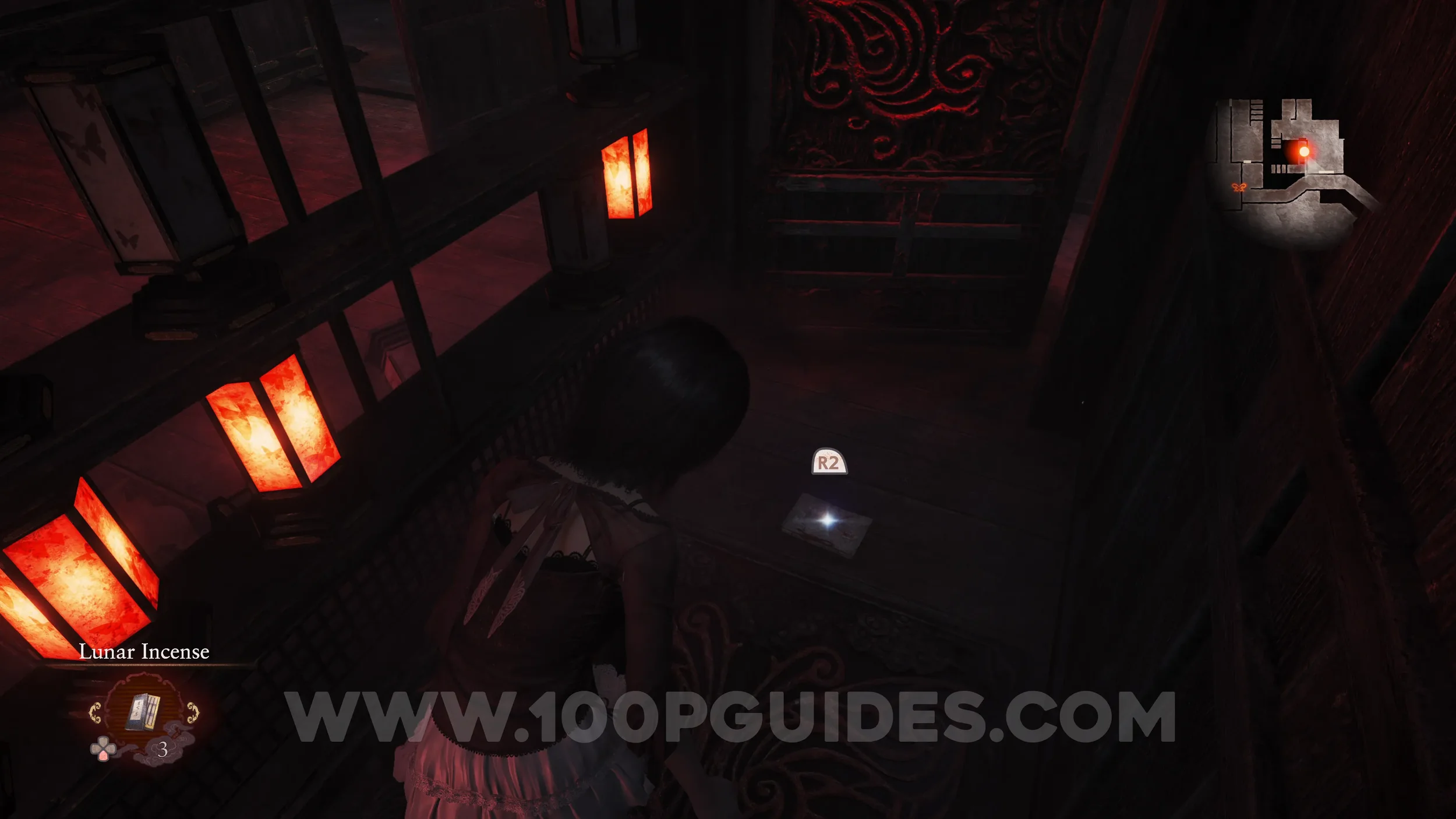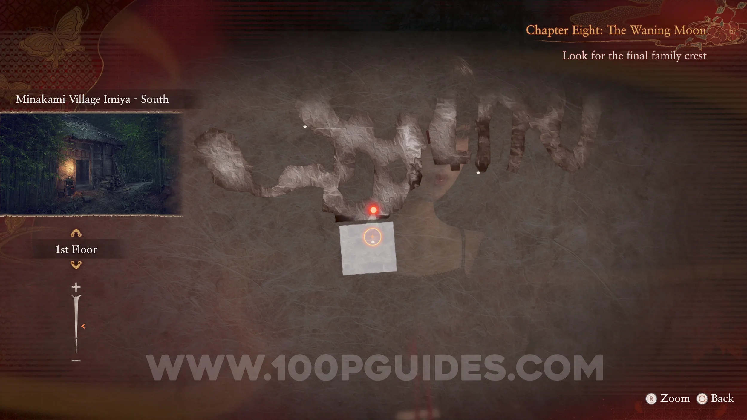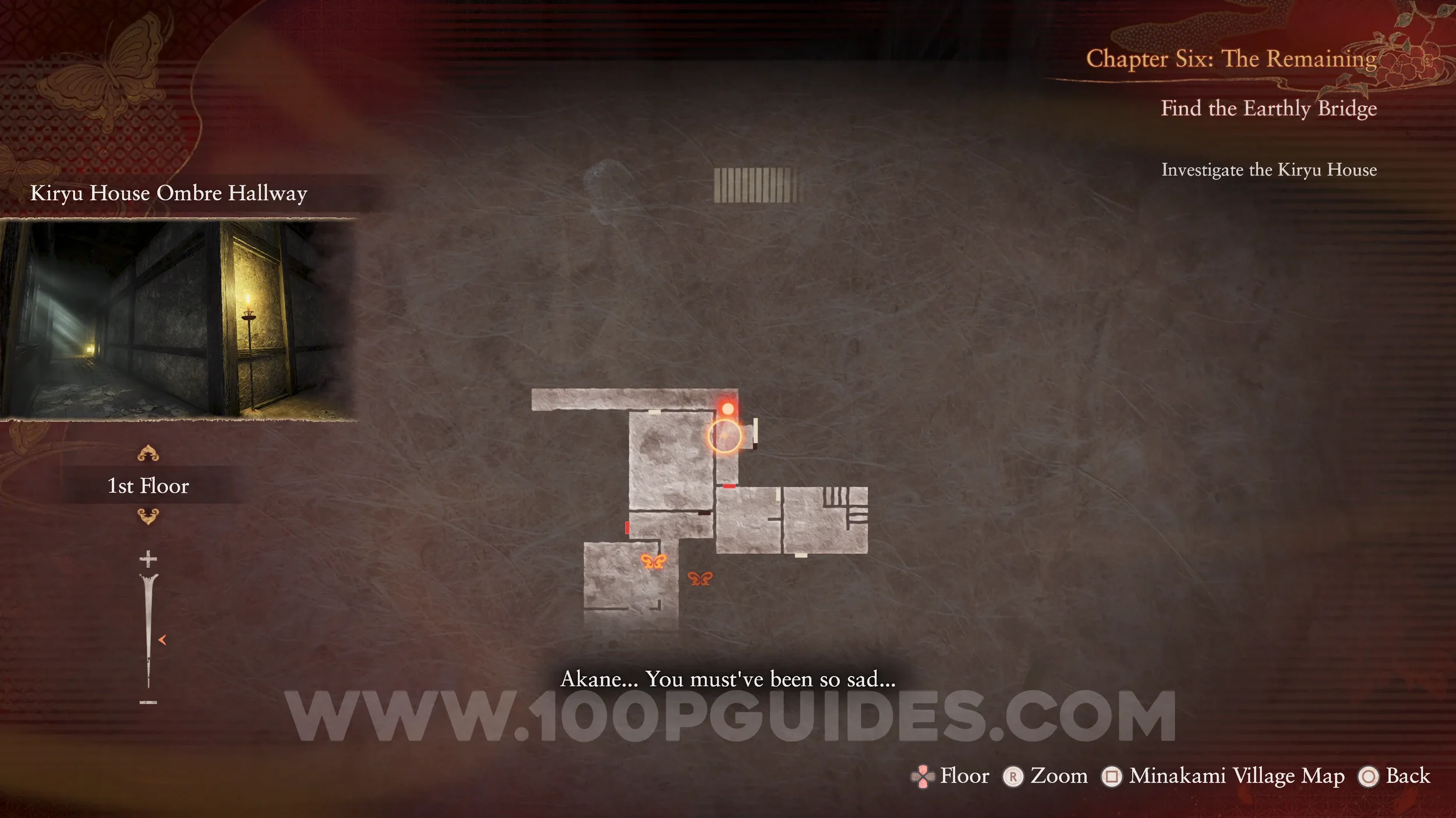 Specter #195 - 232 Girl in Waiting, Spirit Stone #36 - Pale Crimson Crystal (1/2) and Side Quest #11 - Azami Kiryu. On the wooden bridge as you leave Eikado Temple after finishing the Children at Play side quest.