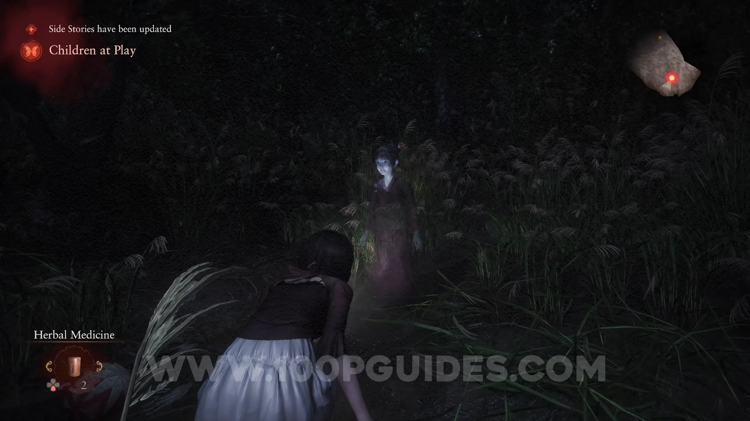 Document #13 - Children’s Note 1, Specter #18 - 159 Girl Peeking Into Thatched Hut, Spirit Stone #3 - Broken Garnet (1/2) and Side Quest #1 - Children at Play. Found inside the straw hut. This also starts the “Children at Play” side quest. After leaving the hut, the specter will appear in front of you.