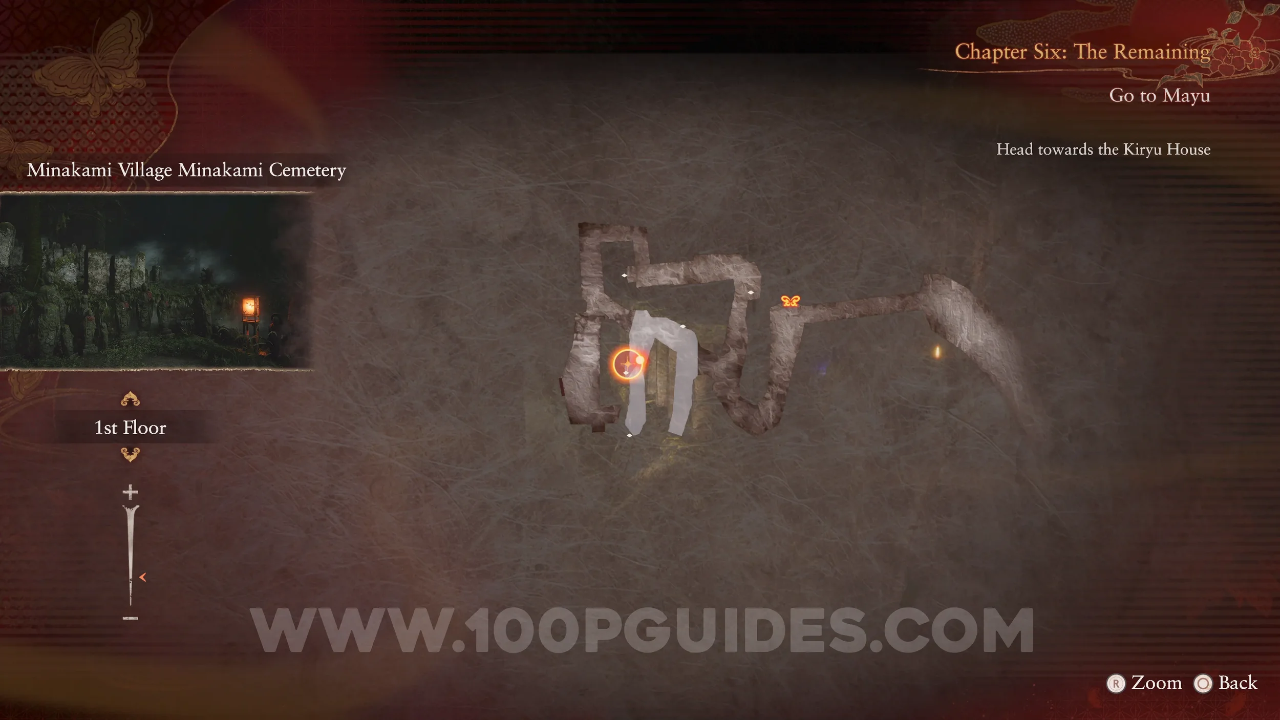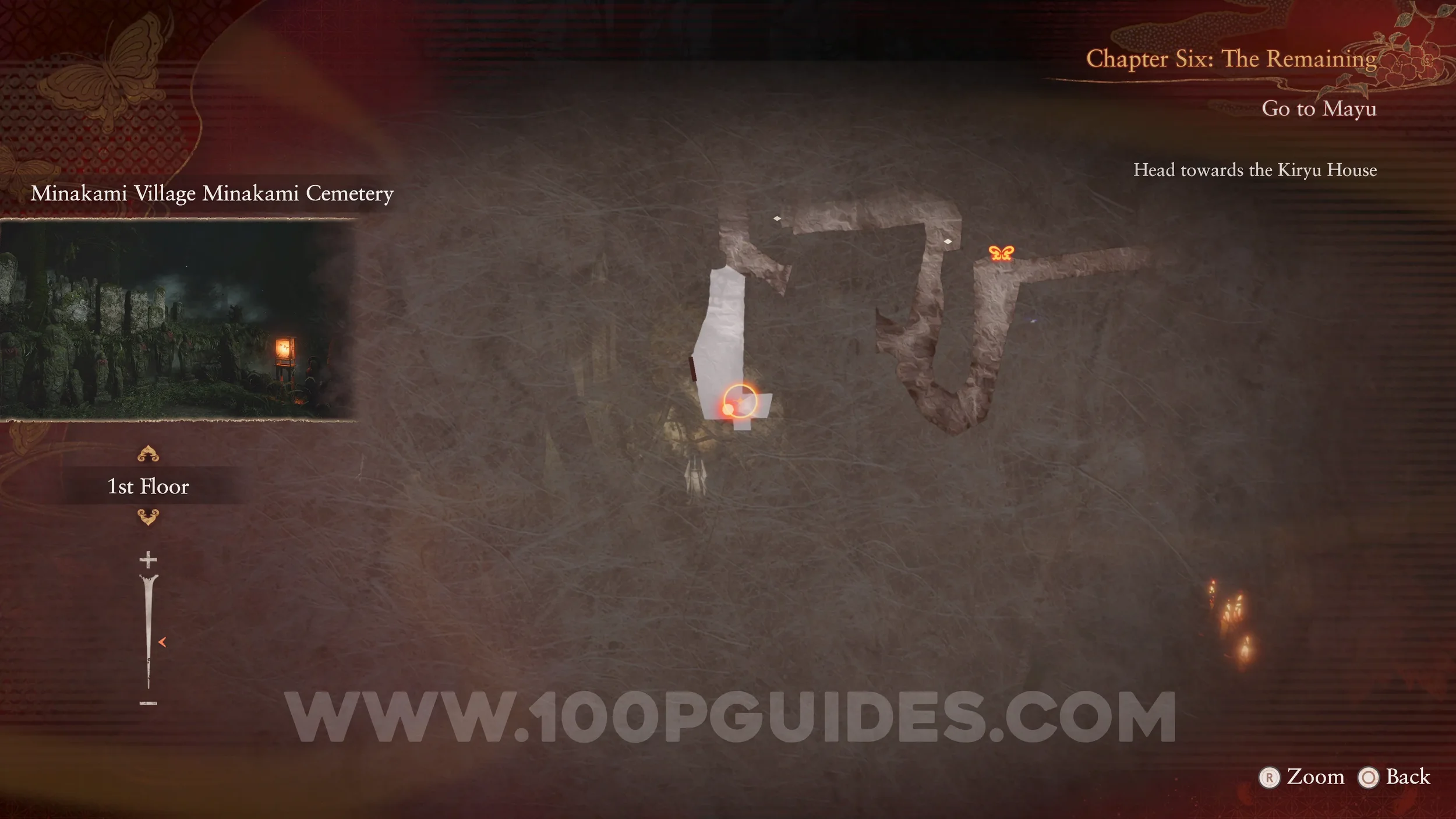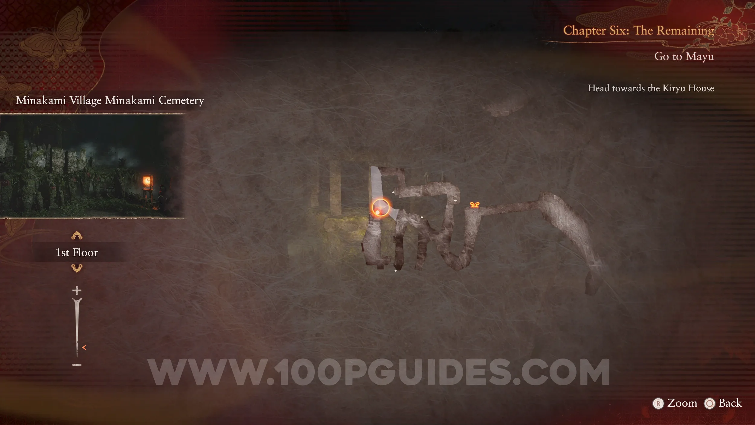 Revenant #30 - 033 Girl Playing, Document #104 - Children’s Note 7 and Spirit Stone #36 - Pale Crimson Crystal (2/2). Now go down the path to the west to find the revenant at the end. After taking the photo, pick up the document and the Spirit Stone to finish the Azami Kiryu side quest.