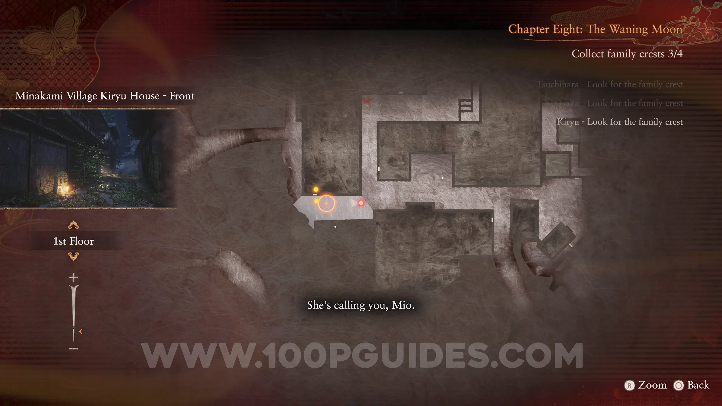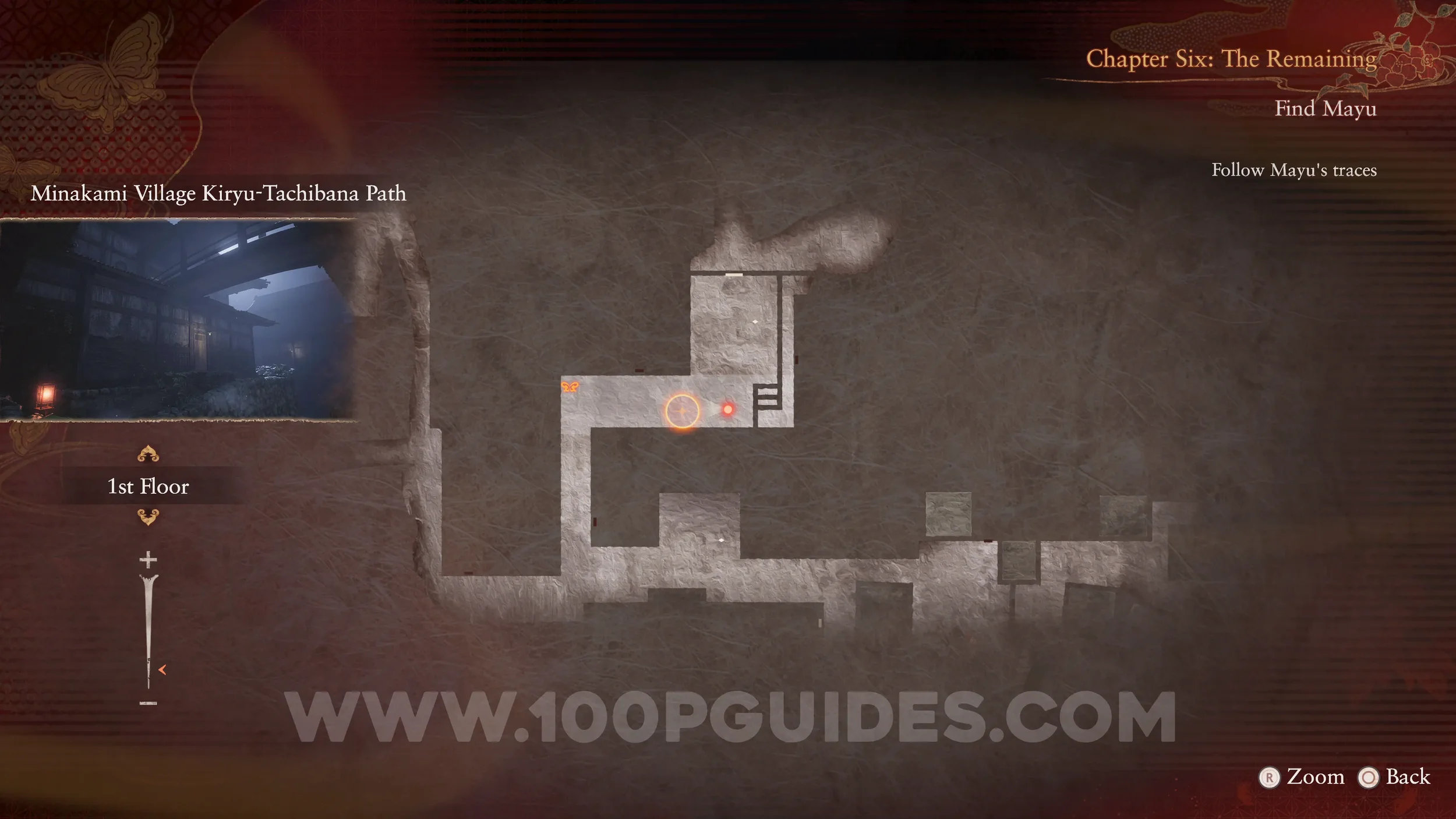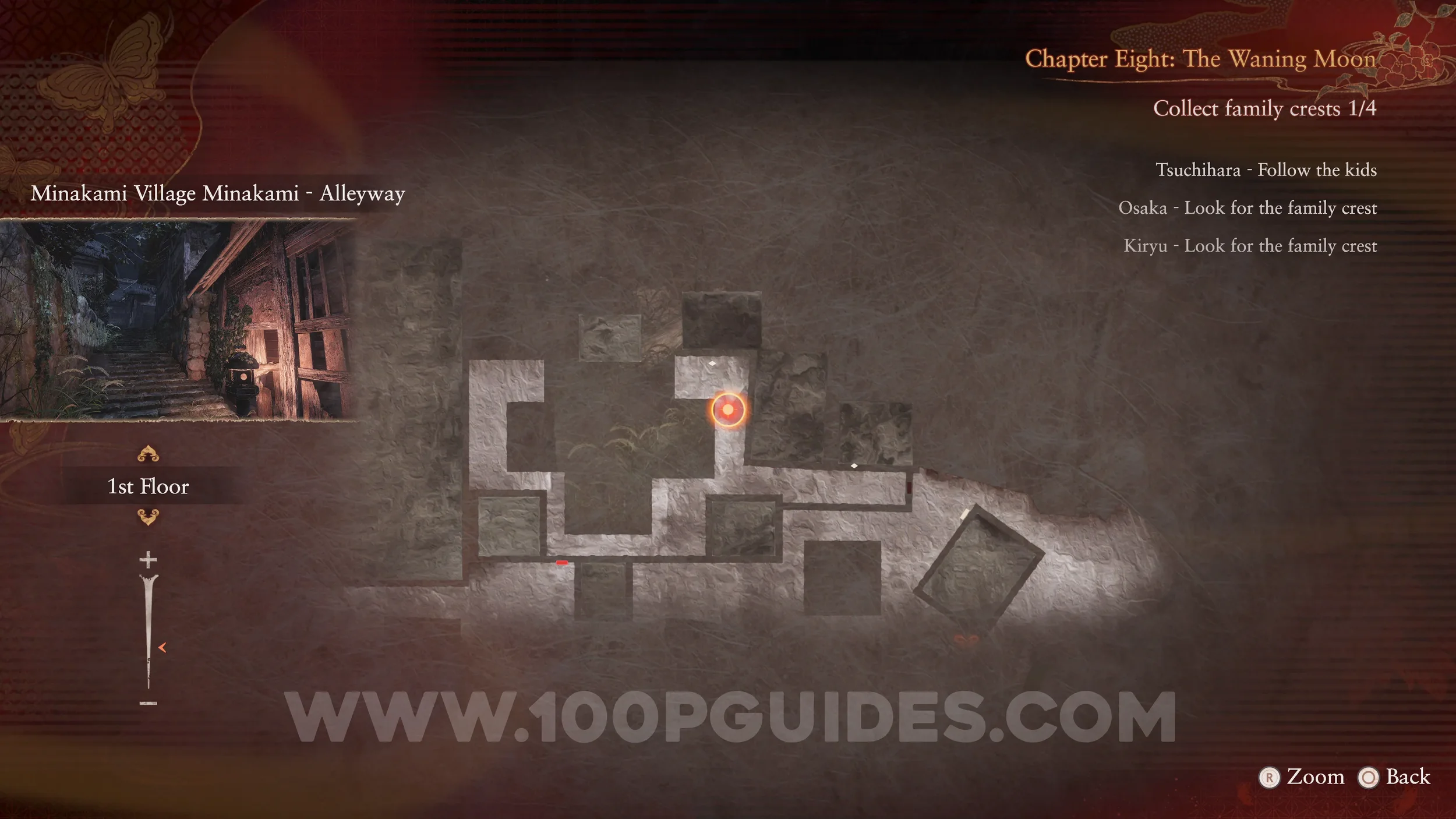 Revenant #30 - 033 Girl Playing, Document #104 - Children’s Note 7 and Spirit Stone #36 - Pale Crimson Crystal (2/2). Now go down the path to the west to find the revenant at the end. After taking the photo, pick up the document and the Spirit Stone to finish the Azami Kiryu side quest.