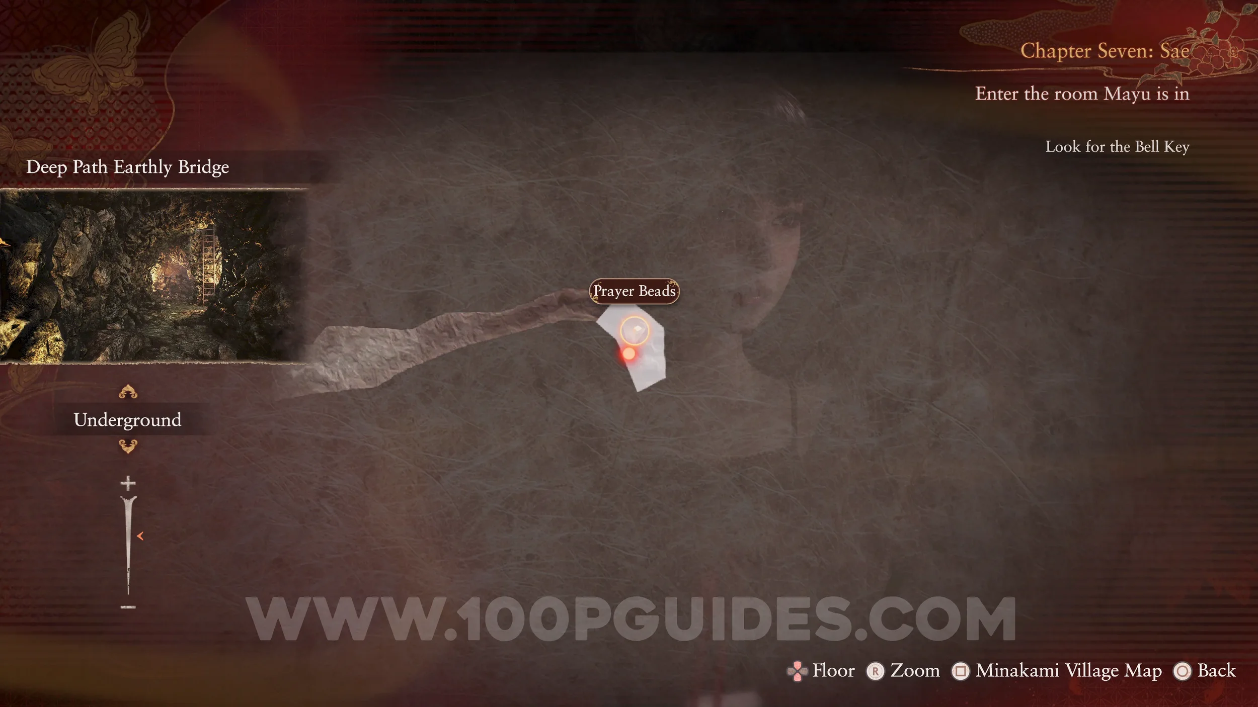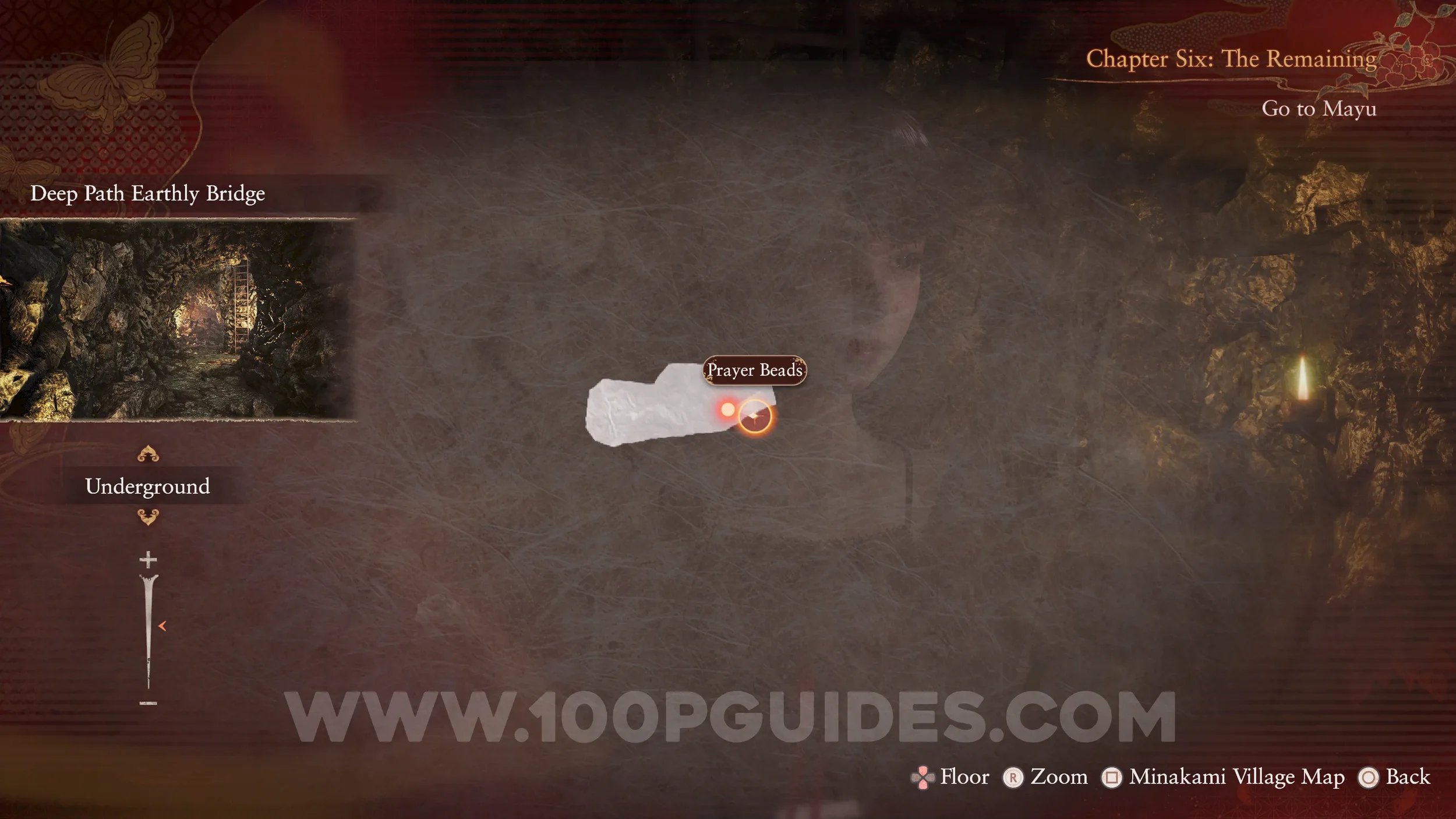 Revenant #32 - 012 Failed Kusabi and Prayer Beads #80. Just after the water area, look for a hole in the wall on the right. The revenant can be seen on the other side. After taking the photo, the beads will appear where you are standing.