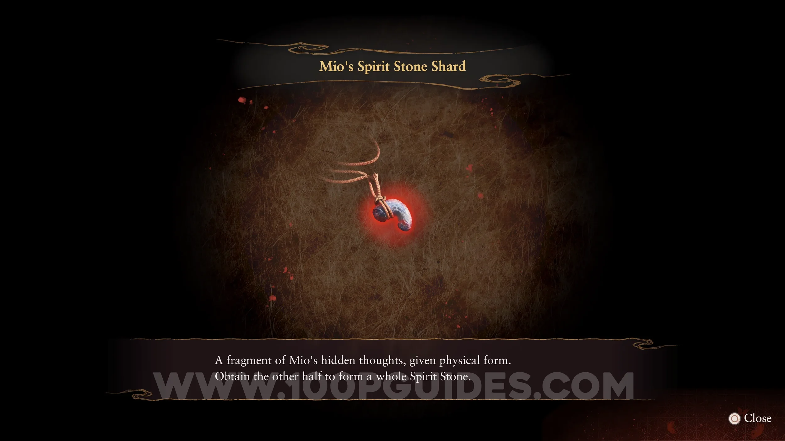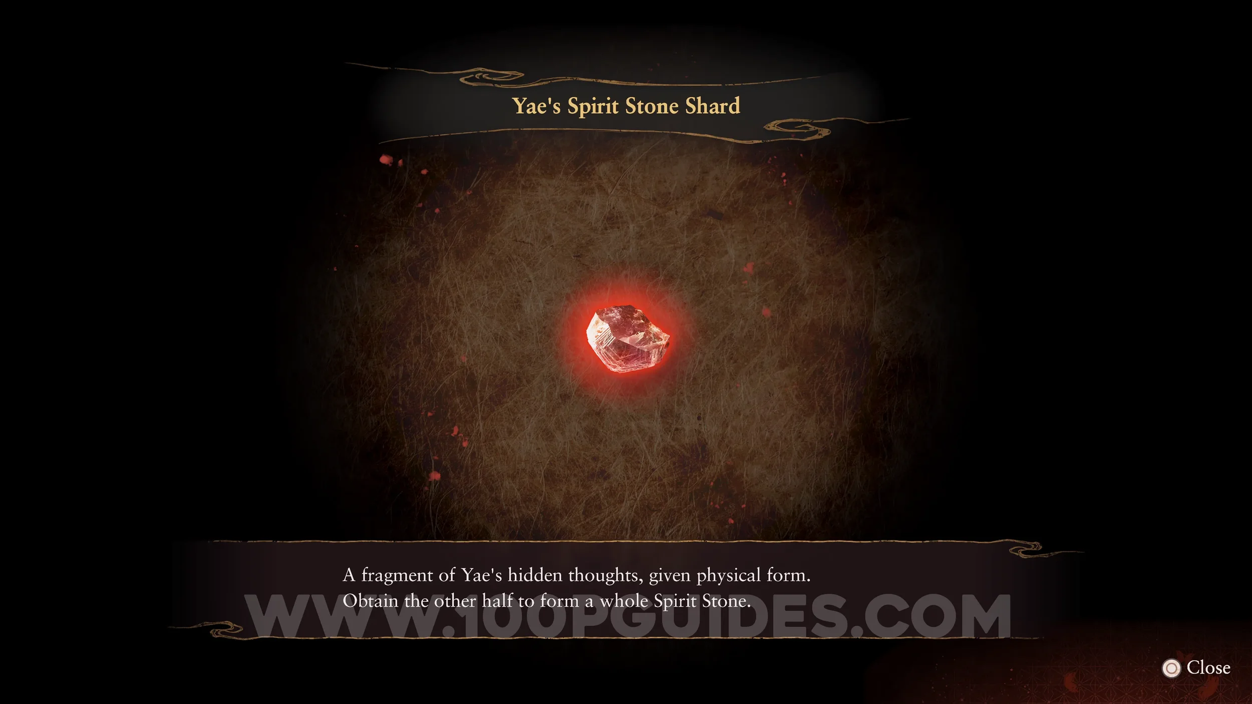 Specter #250 - 238 Woman Crying by Torii Gate, Document #117 - Blotched Note and Spirit Stone #42 - Yae’s Spirit Stone Shard (2/2) (Yae’s Sparkling Spirit Stone). Head to Misono Hill, the area where the game starts, and look for the specter to the south of the stone structures along with the note and the second half of the Spirit Stone. This will also bring the “Yae Kurosawa” side quest to an end.