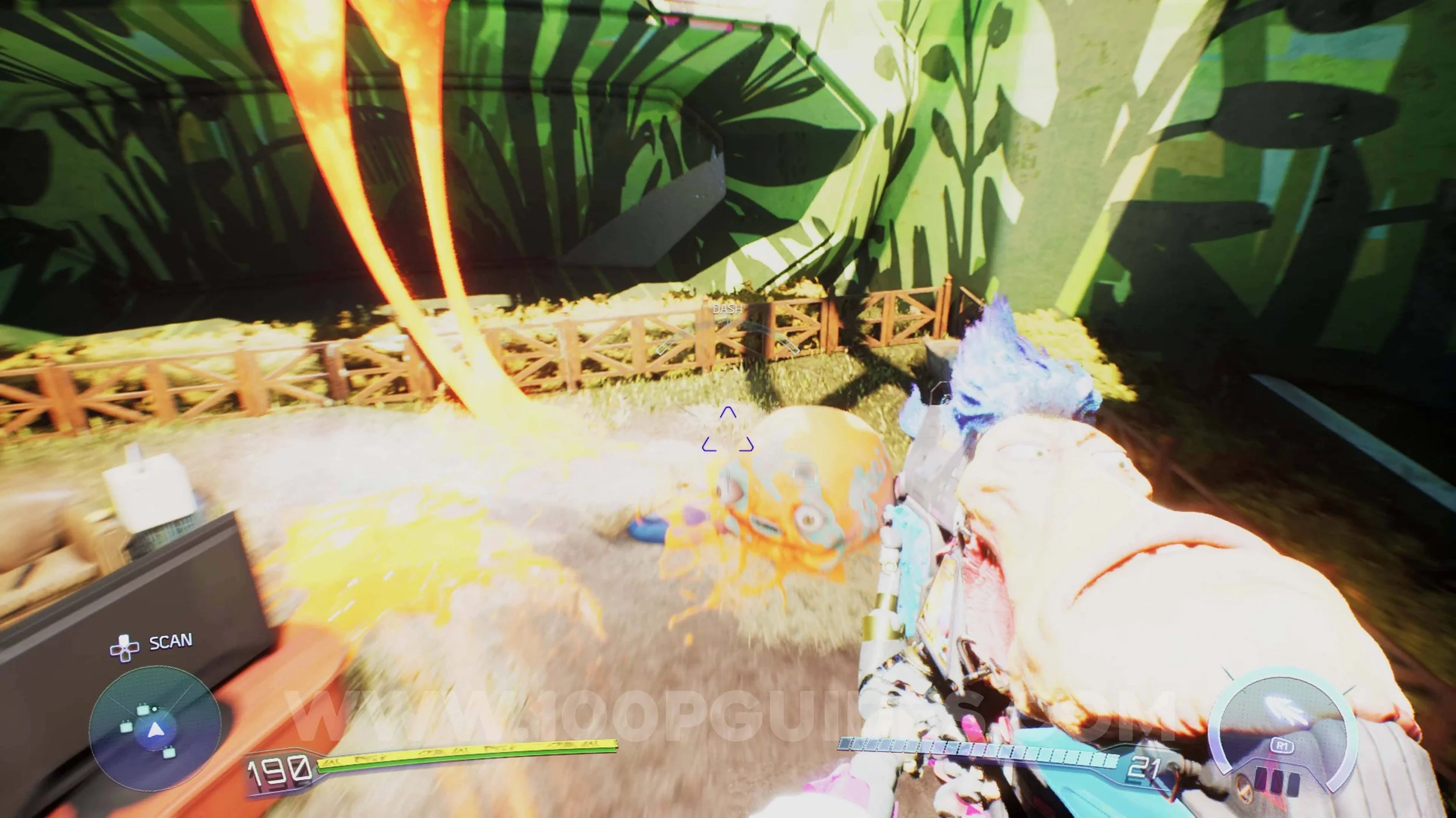 Game #6 (Radical Rex). Found in the Human stables area in the Zoo. To open the gate, grab the Lugblob and place it under the half-open gate. Then shoot it with Sweezy’s time bubble. Inside, grab the blob from the pen and the one in a container next to the electricity node. Now use the 2 Lugblobs as nodes to open the container where the game is found.