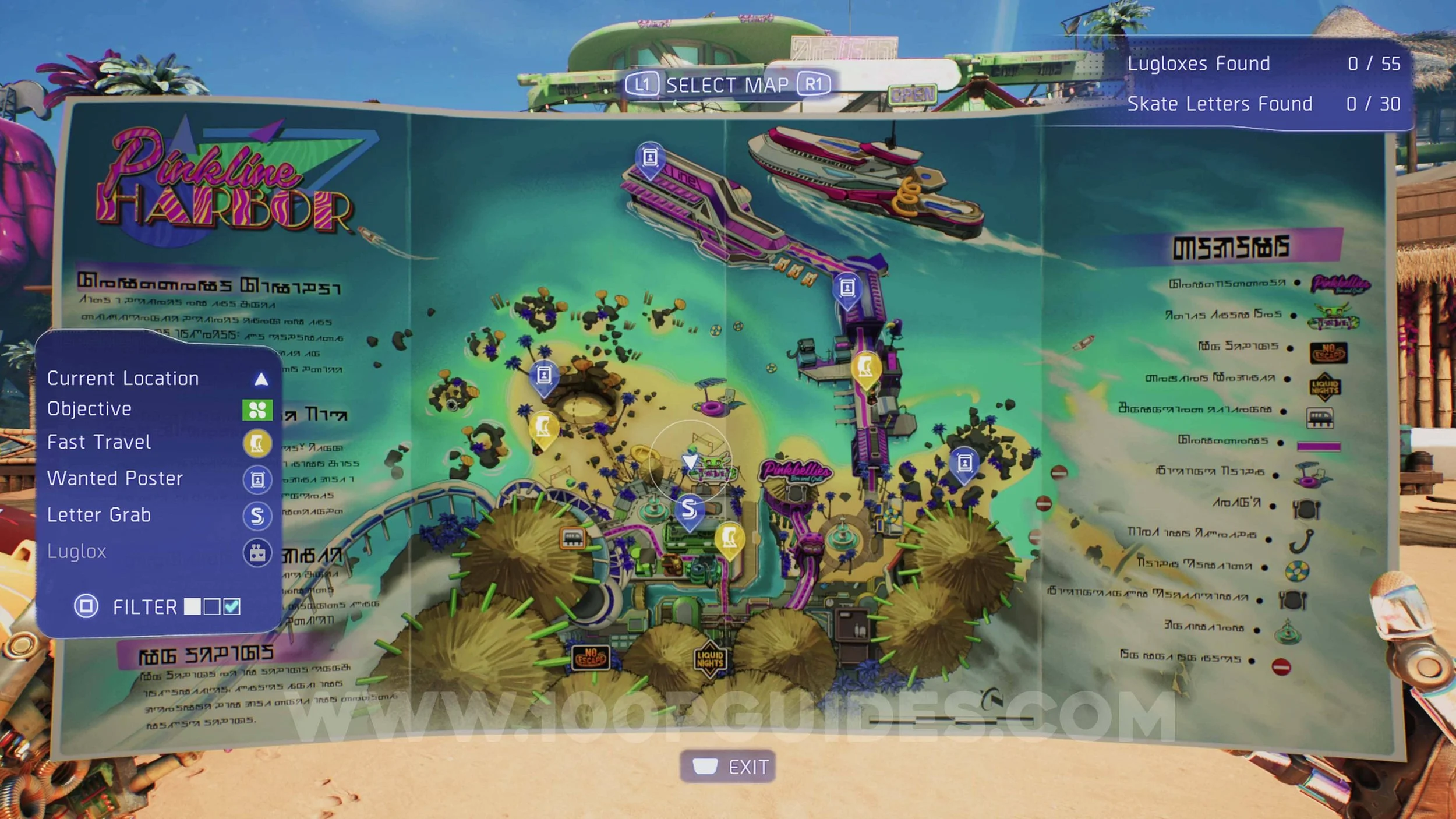 To get the Pro Skater trophy, you must complete all 9 Skateboarding Challenges at the Skateparks. These challenges require you to collect all 10 letters before the time runs out. Each region has a skatepark, and each skatepark has 3 challenges. Here are the locations of the Skateparks.