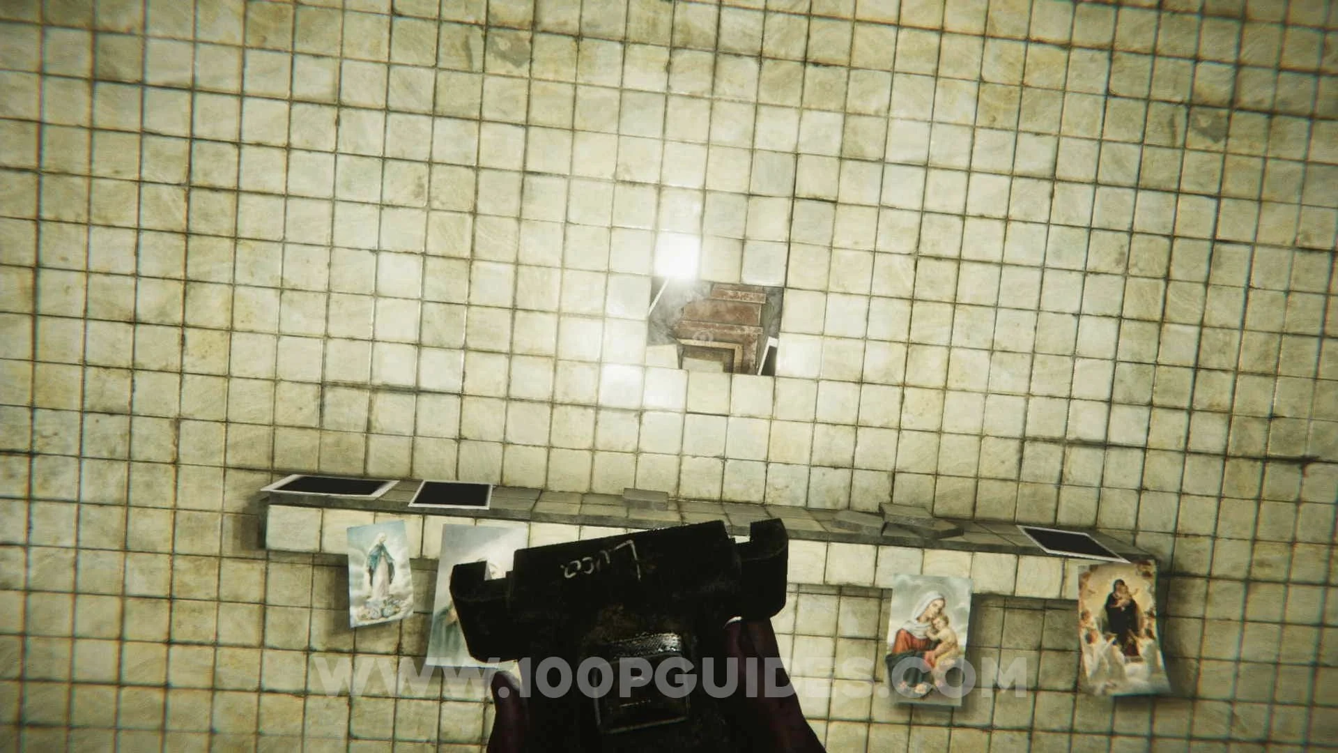 Enter the elevator and go to the 2nd floor. Here take a photo of the hole containing Judith Hale's coffin, then take a photo of the pillar in the middle of the room to find a red collectible.