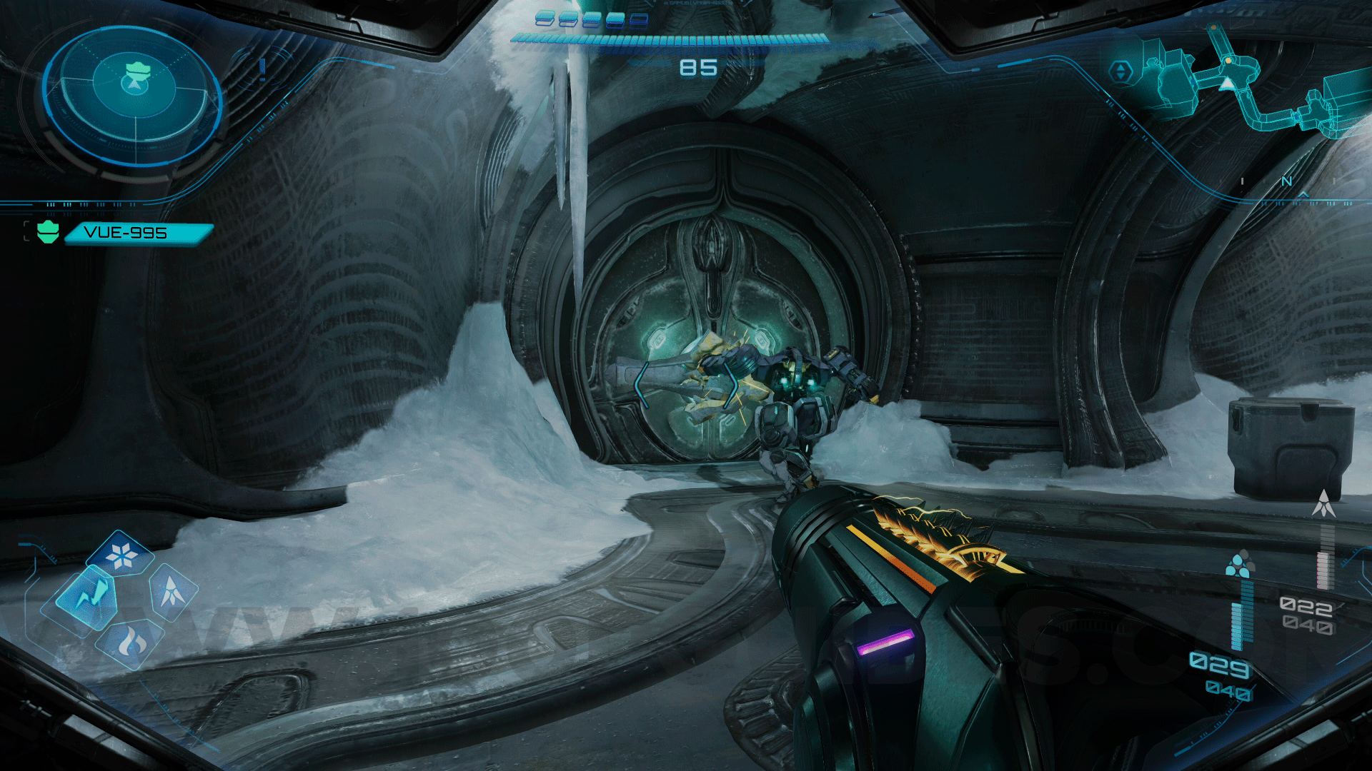 VUE-995. First found in Ice Belt > Surface. Go to the second floor and pass through the door that you need to shoot with the thunder shot, follow the only possible path and pass through the hole in the wall. When you reach the other side, use the thunder shot on VUE-995 to wake it up and scan it.