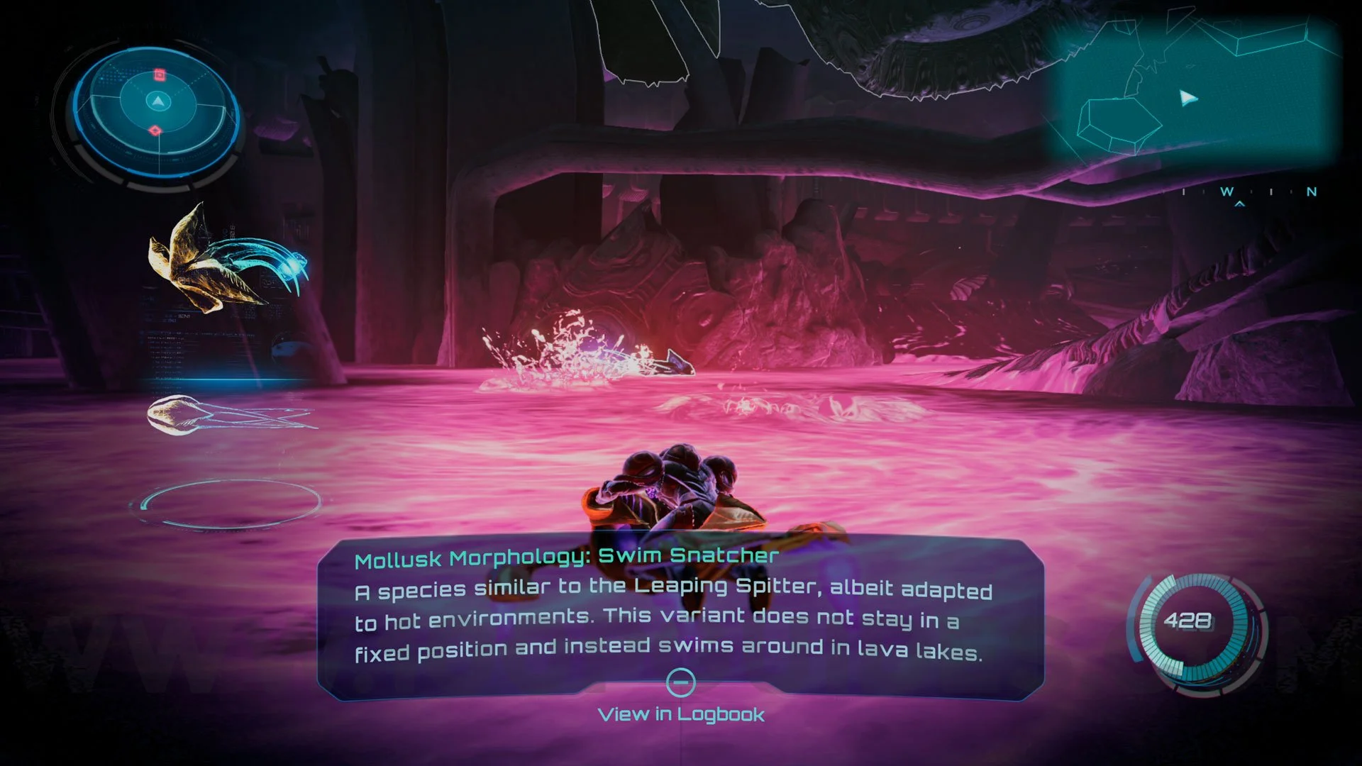 Swim Snatcher. First found in Flare Pool > Volcano Heart. When you get close to the tank, the Swim Snatcher will grab you, and you can scan it.