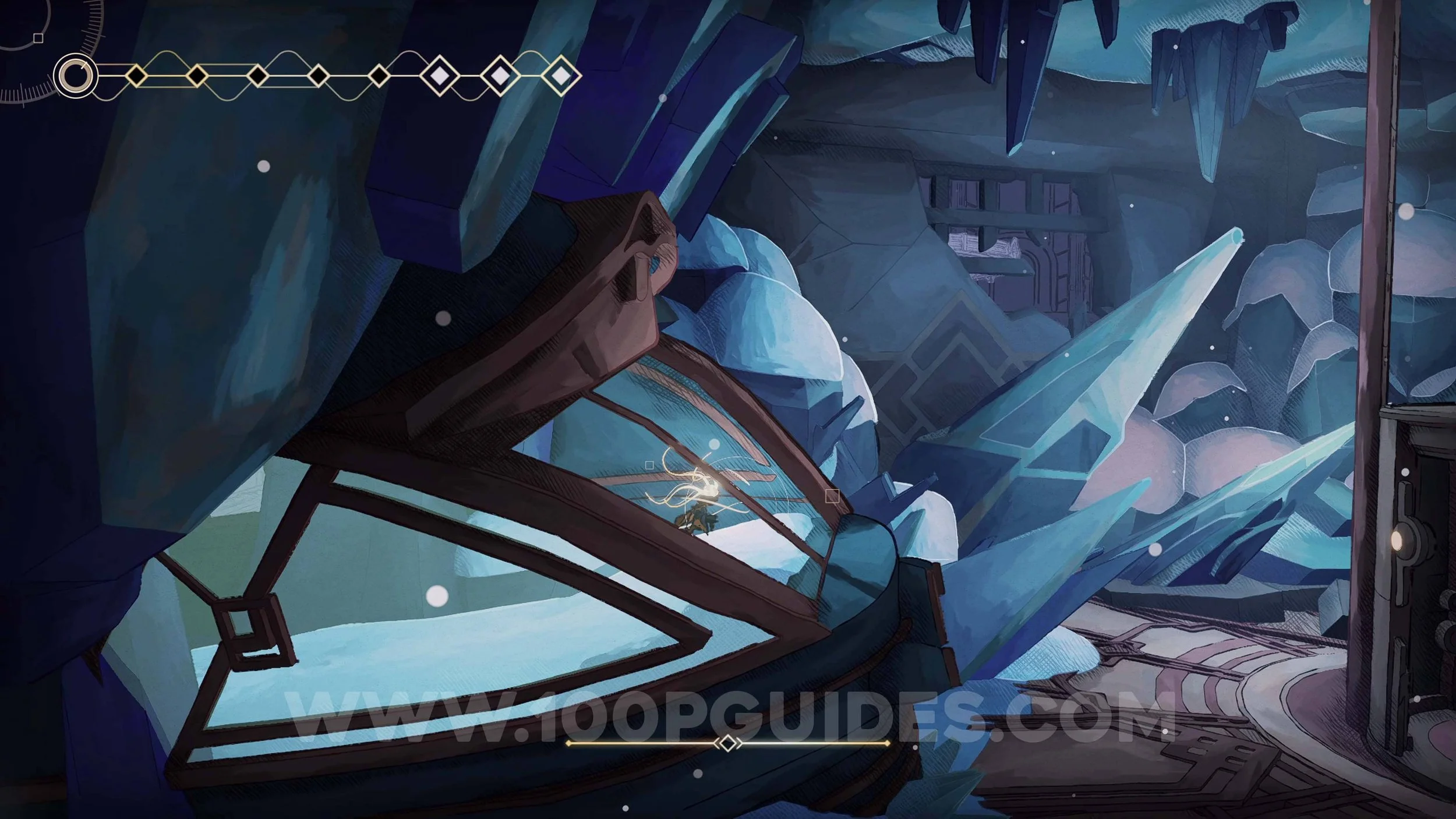 Curio #6 (Earthen Relic). From the bottom of the lift, climb up into the shaft. Then exit through the broken glass and jump to the inverted tower on your right. Climb under it and then climb up the right side. From here, glide across to the trains on the right to find the Curio inside the final one.