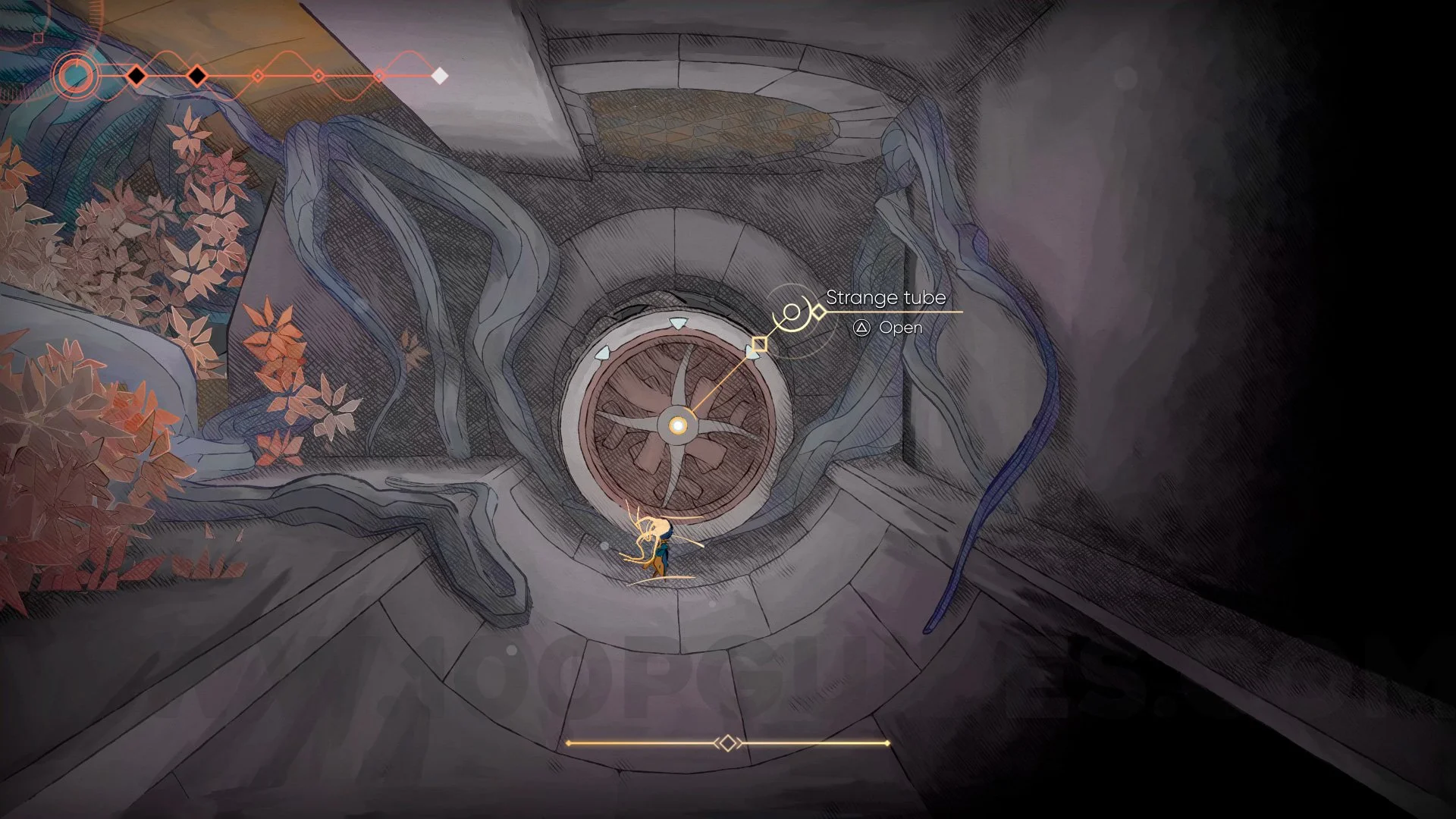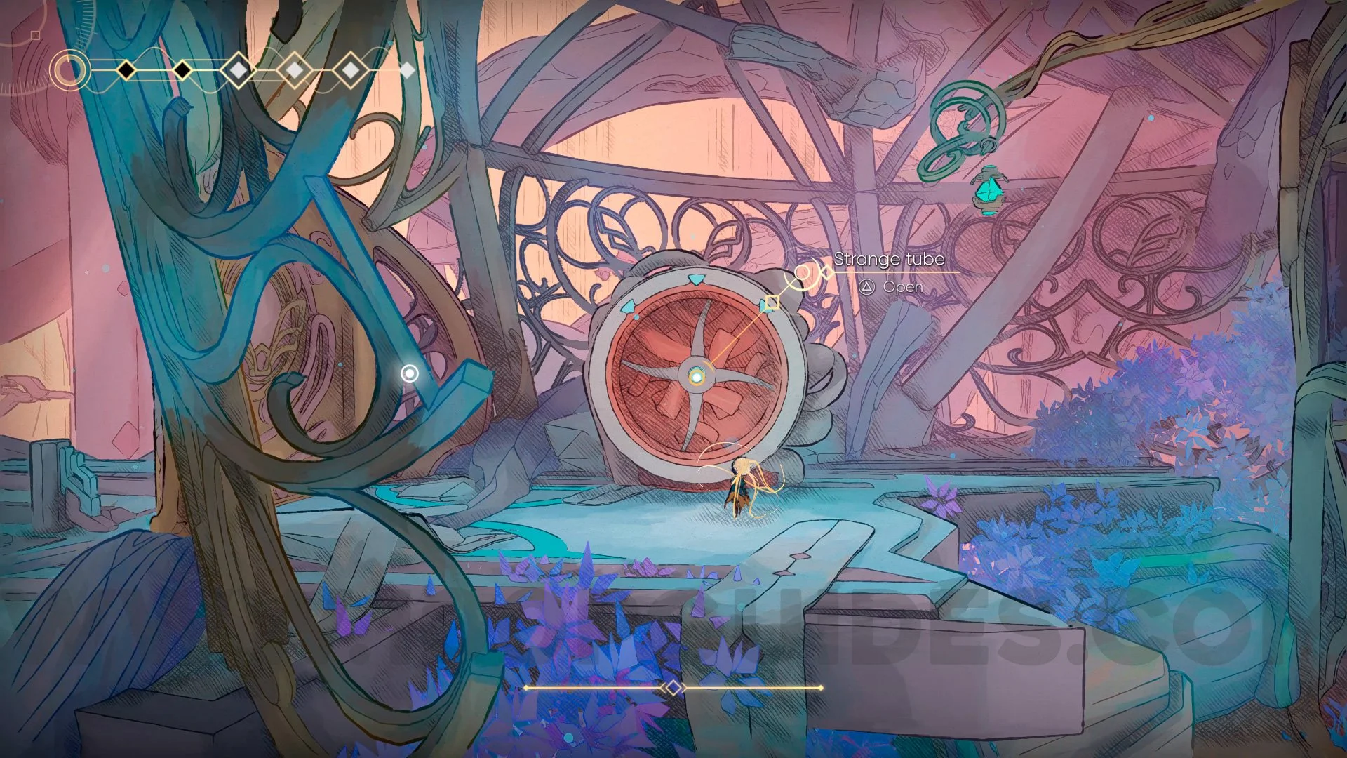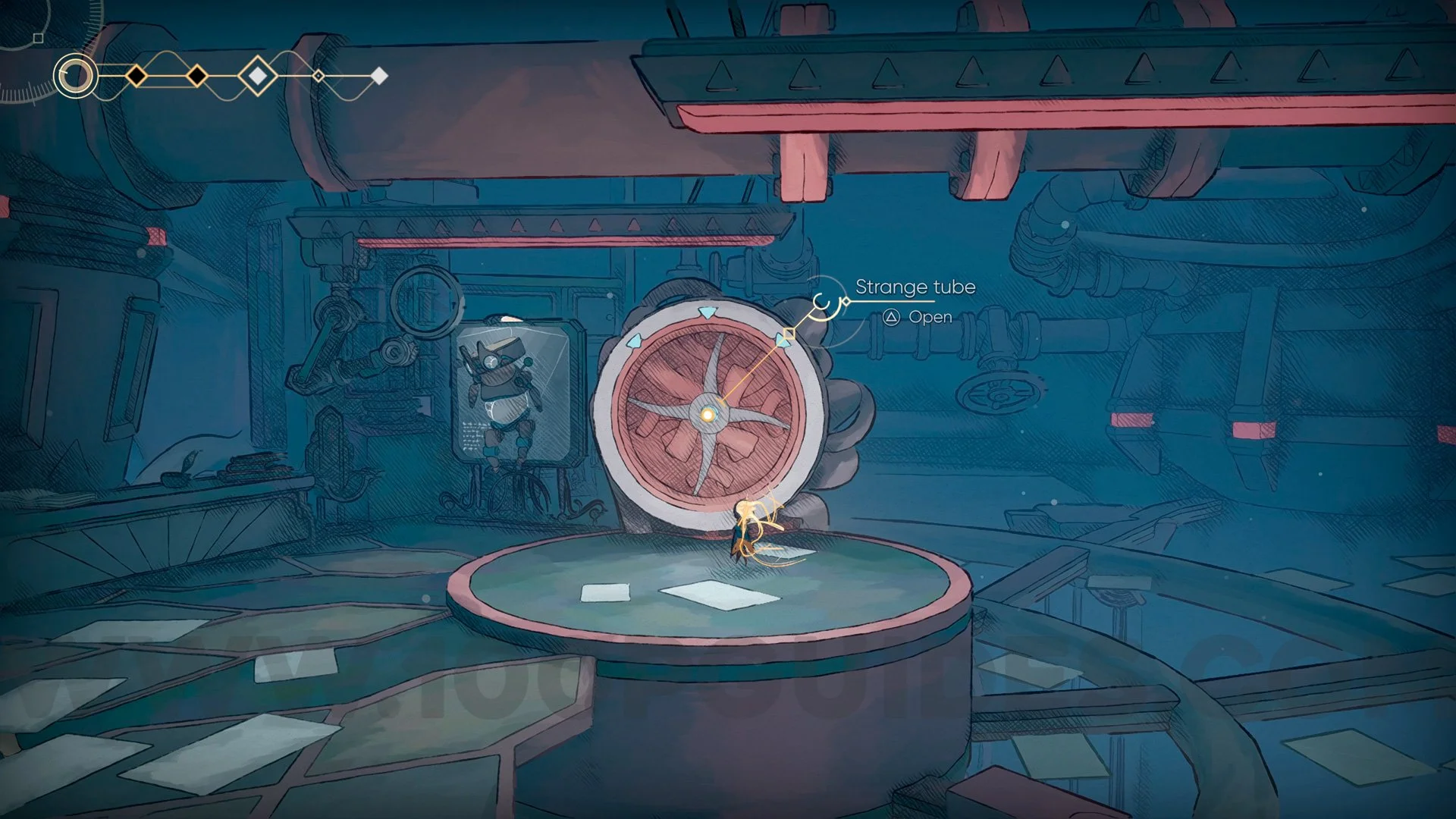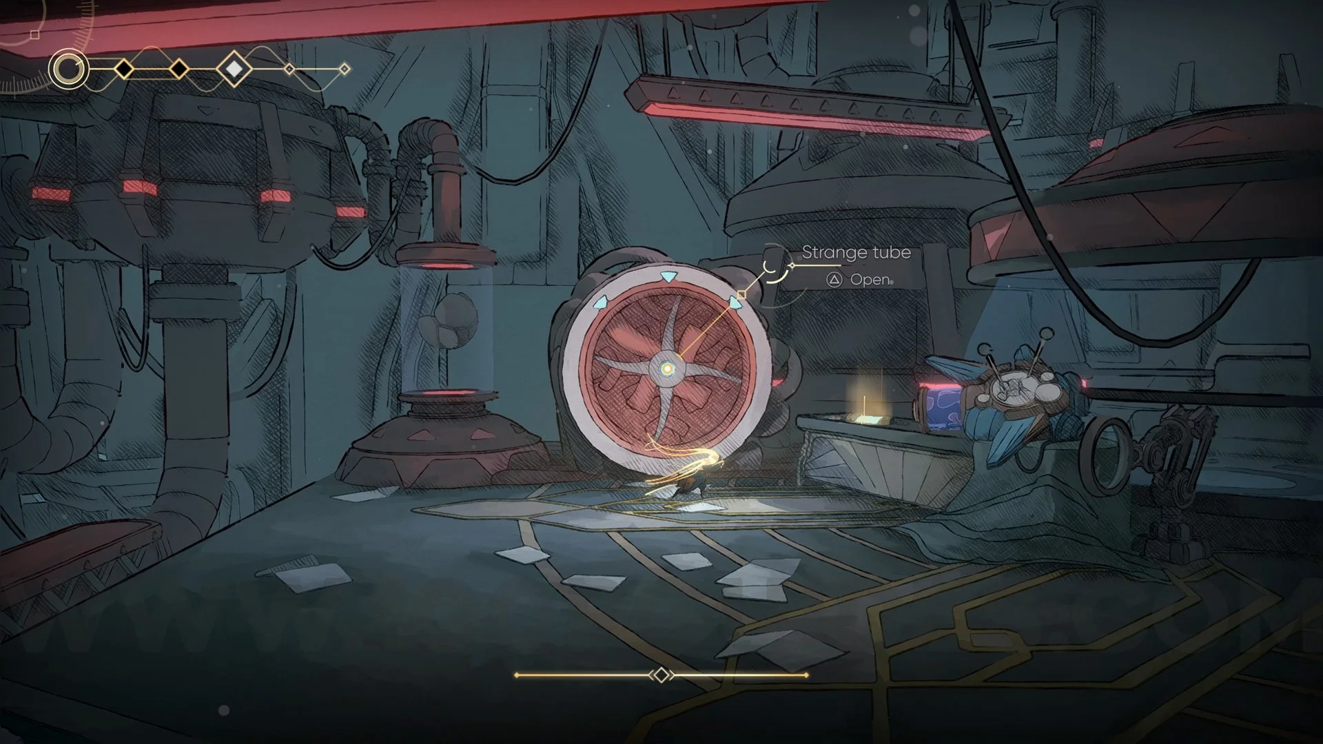 After passing through, head to the right, passing a few more saw blades. You will encounter a large enemy and the doors will close. Defeat the enemy, proceed forward, and you will see the Strange Tube to interact with.