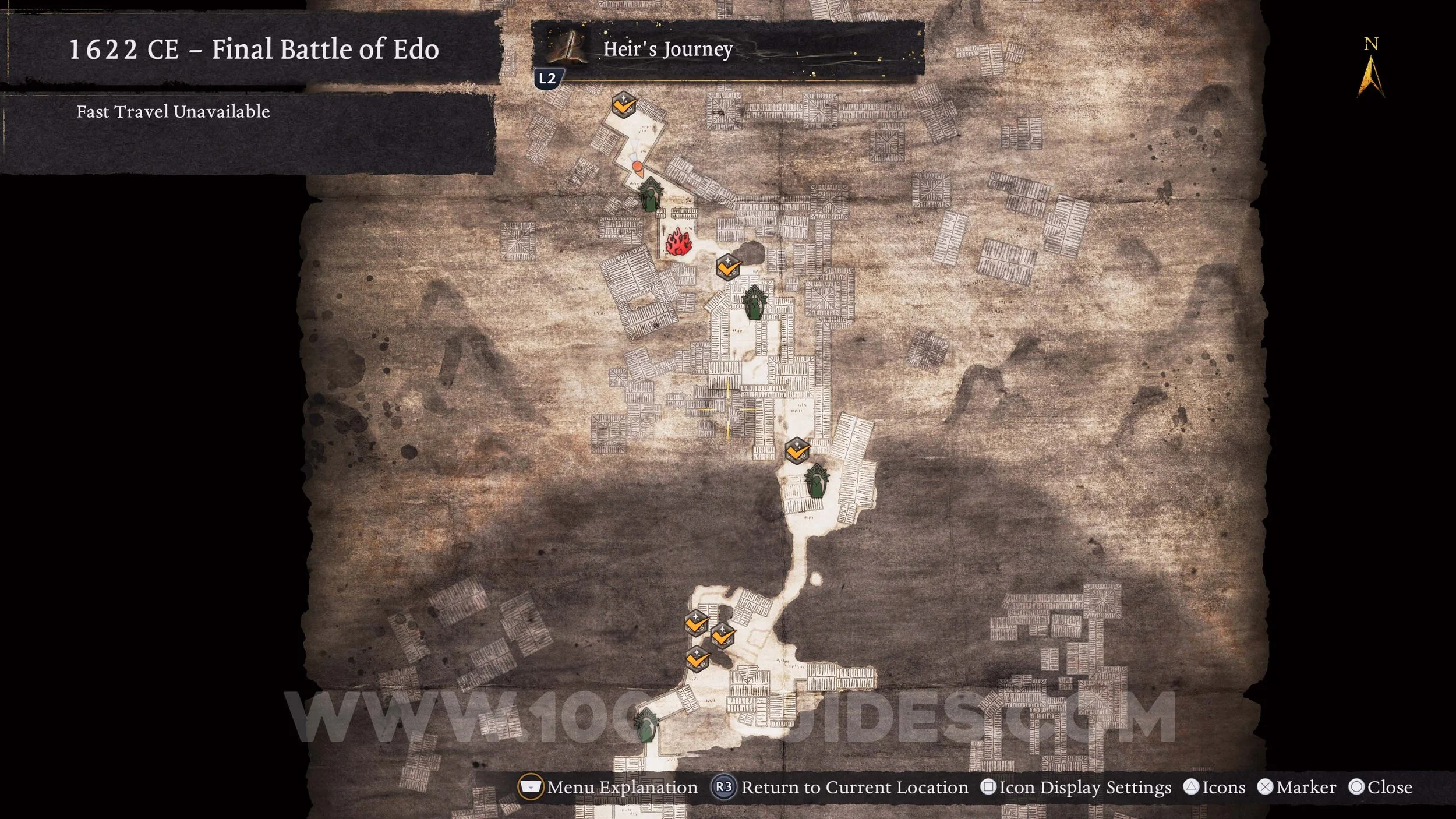 1622 CE - Final Battle of Edo has a total of 27 Collectibles. To revisit this region, you will have to select the A Sinister End Battle Scroll. This region has: