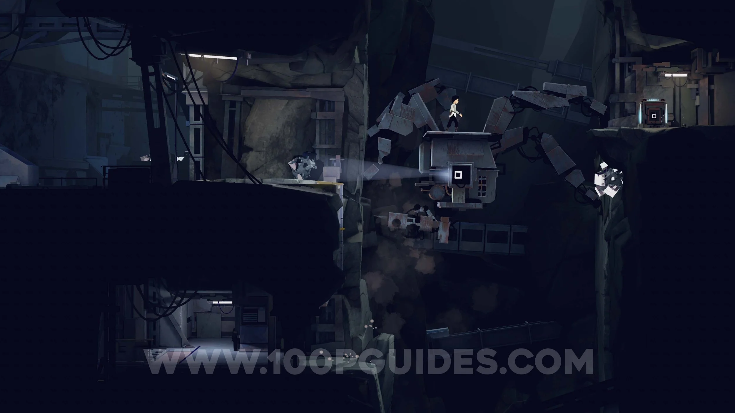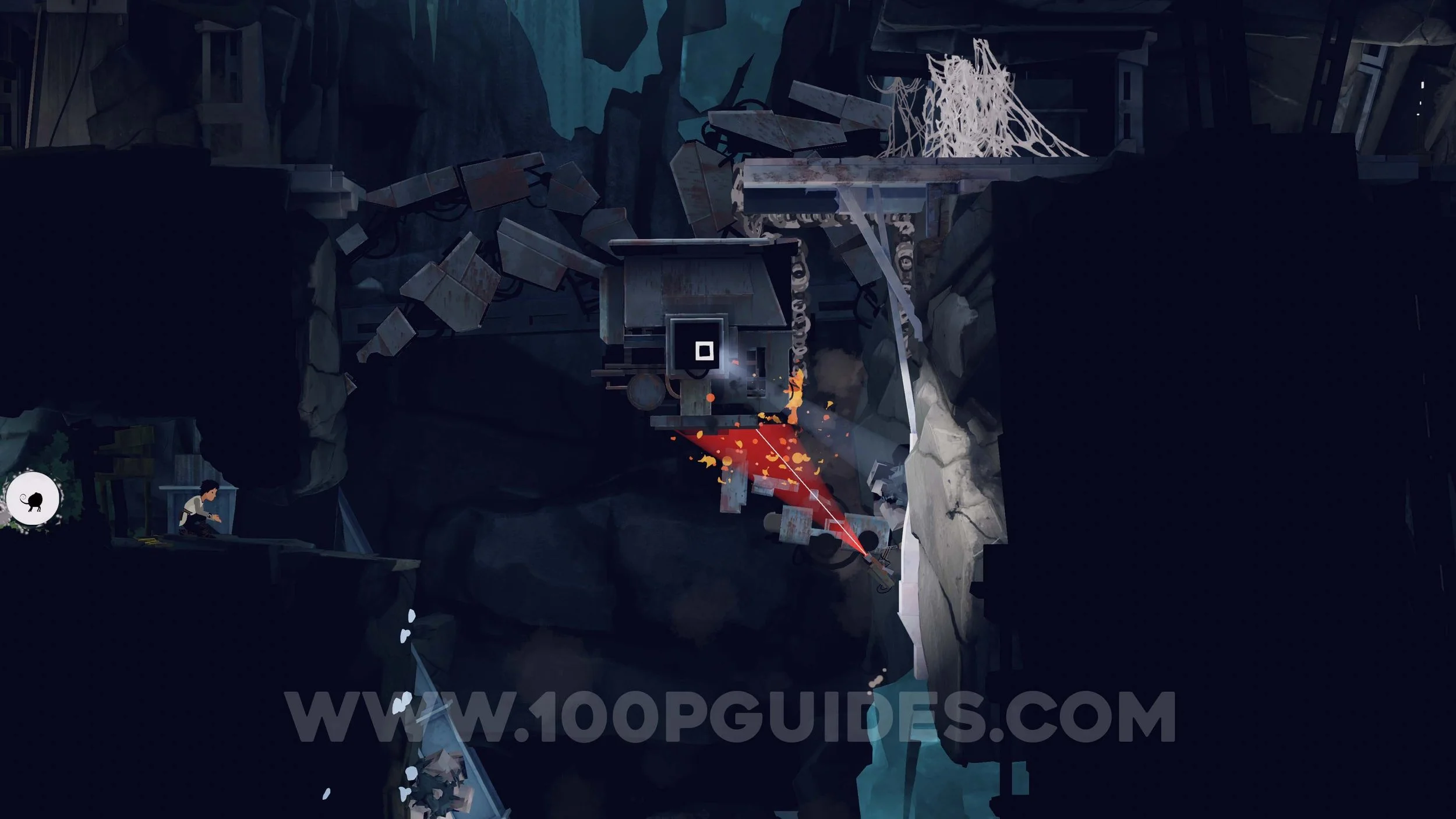 You will then reach another area with a bot mining rocks. Start by climbing onto the left side of the bot and jumping into the lower-left tunnel. Remove the wooden panels and send Mui to the fluff creature to take control of one. Wait for the bot to move close to the wall below, then climb up and reach the web. Create a trail of fluff from the web down onto the top of the bot. When the bot reaches its highest position, continue the trail around the right side of the bot. As soon as you enter the red security camera light, you will ignite, and the flames will follow the trail of fluff to burn the web.