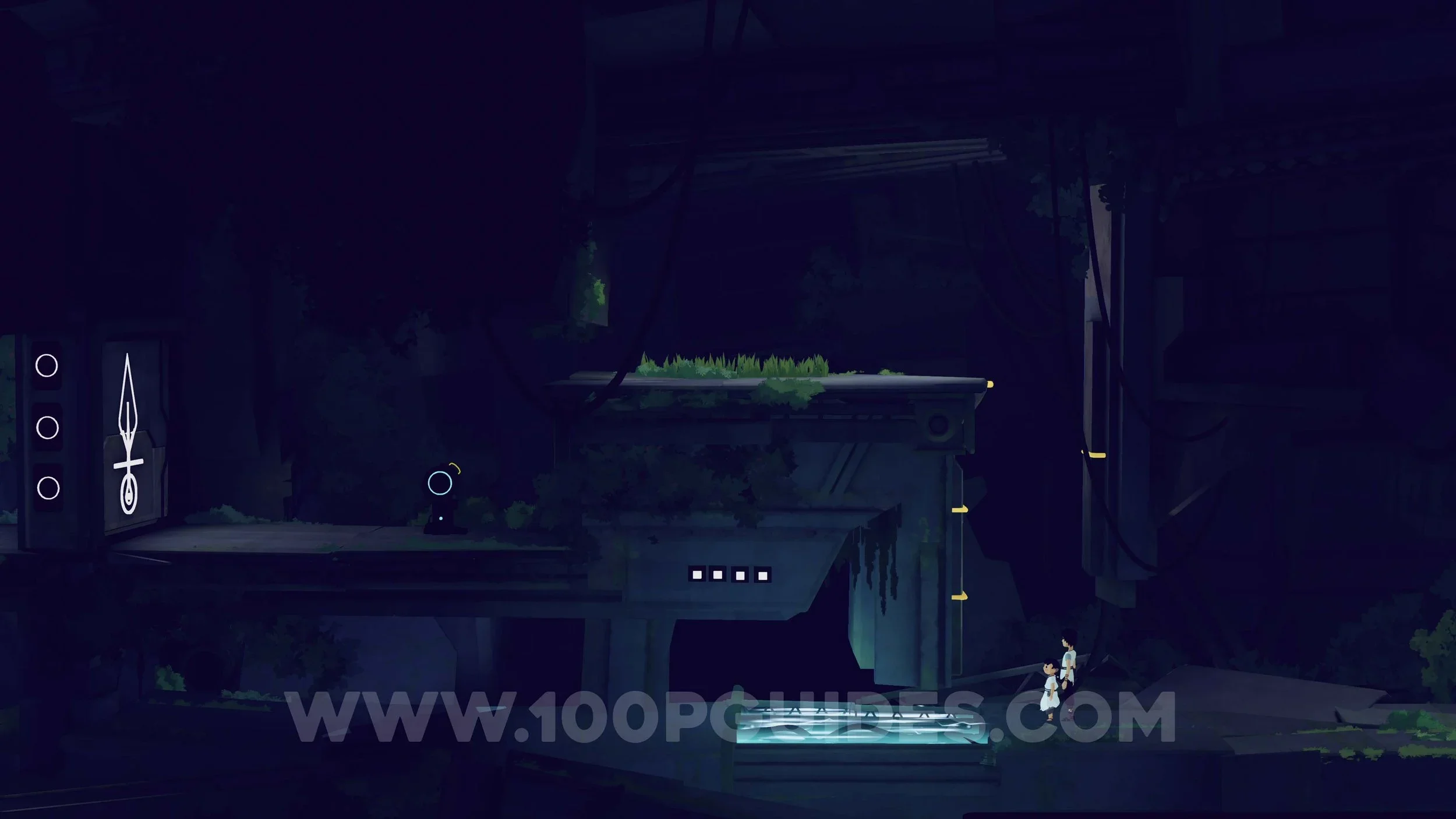 In the next area, run to the right while avoiding the bot’s light. Climb up to the platforms where the bot is patrolling and wait until it moves to the top platform before heading to the switch on the left. Command Mui to stand on the lift and raise it. When the bot gets close, have Mui jump onto it and hold Triangle to disable it, then use Lana to hack and take control of the bot.