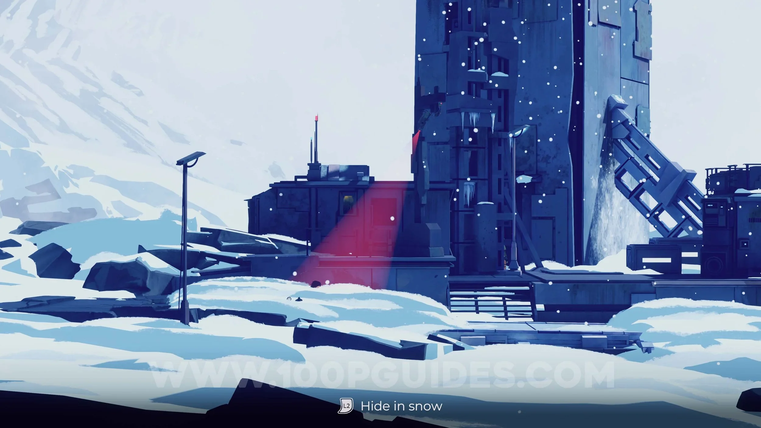 You will now come to an outside area with a small enemy base. To get past the security cameras, press L2 and hide in the snow.