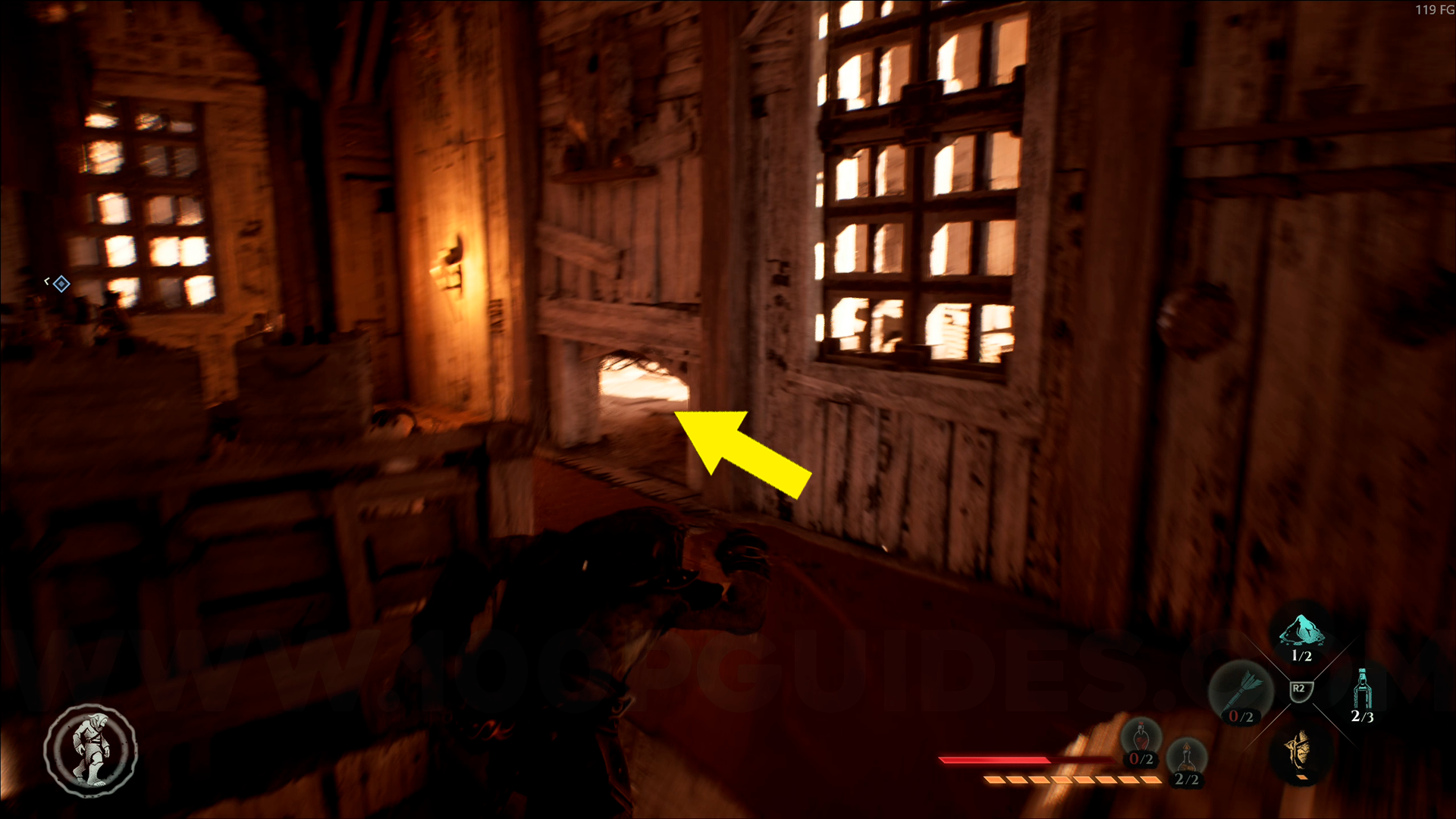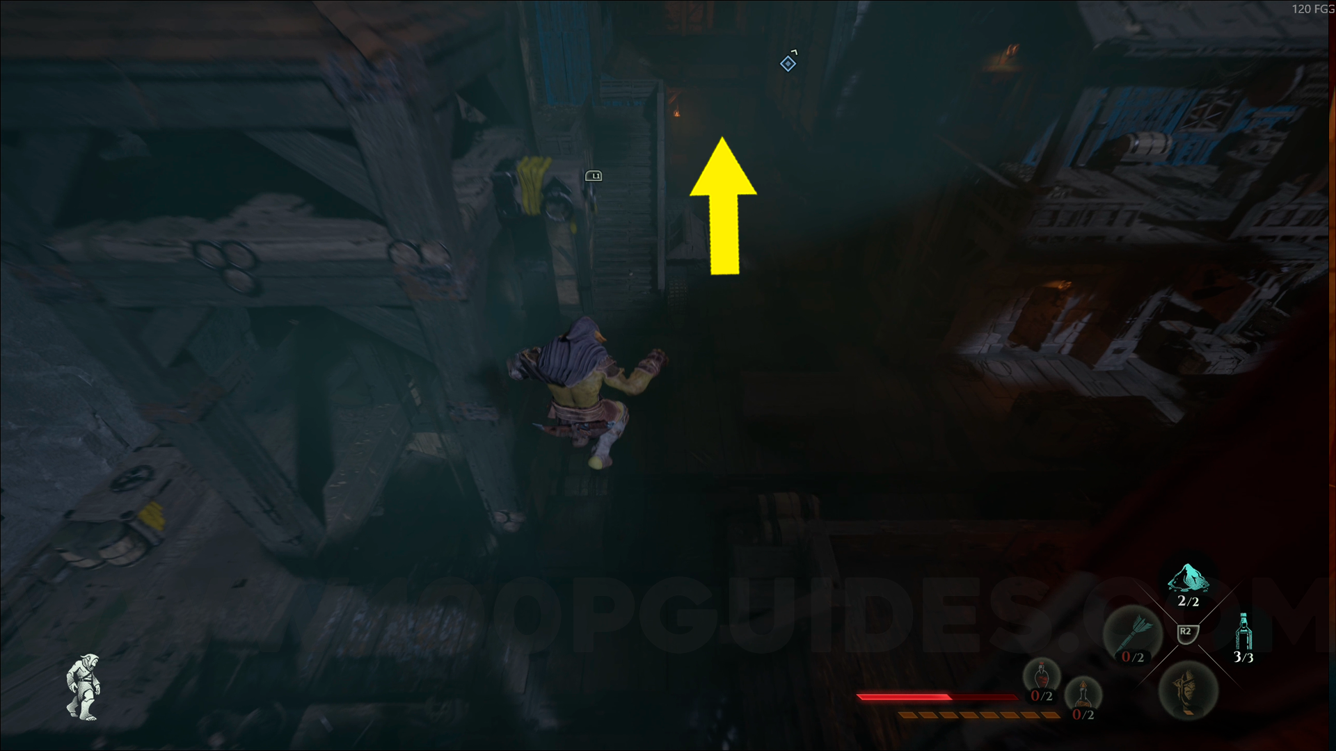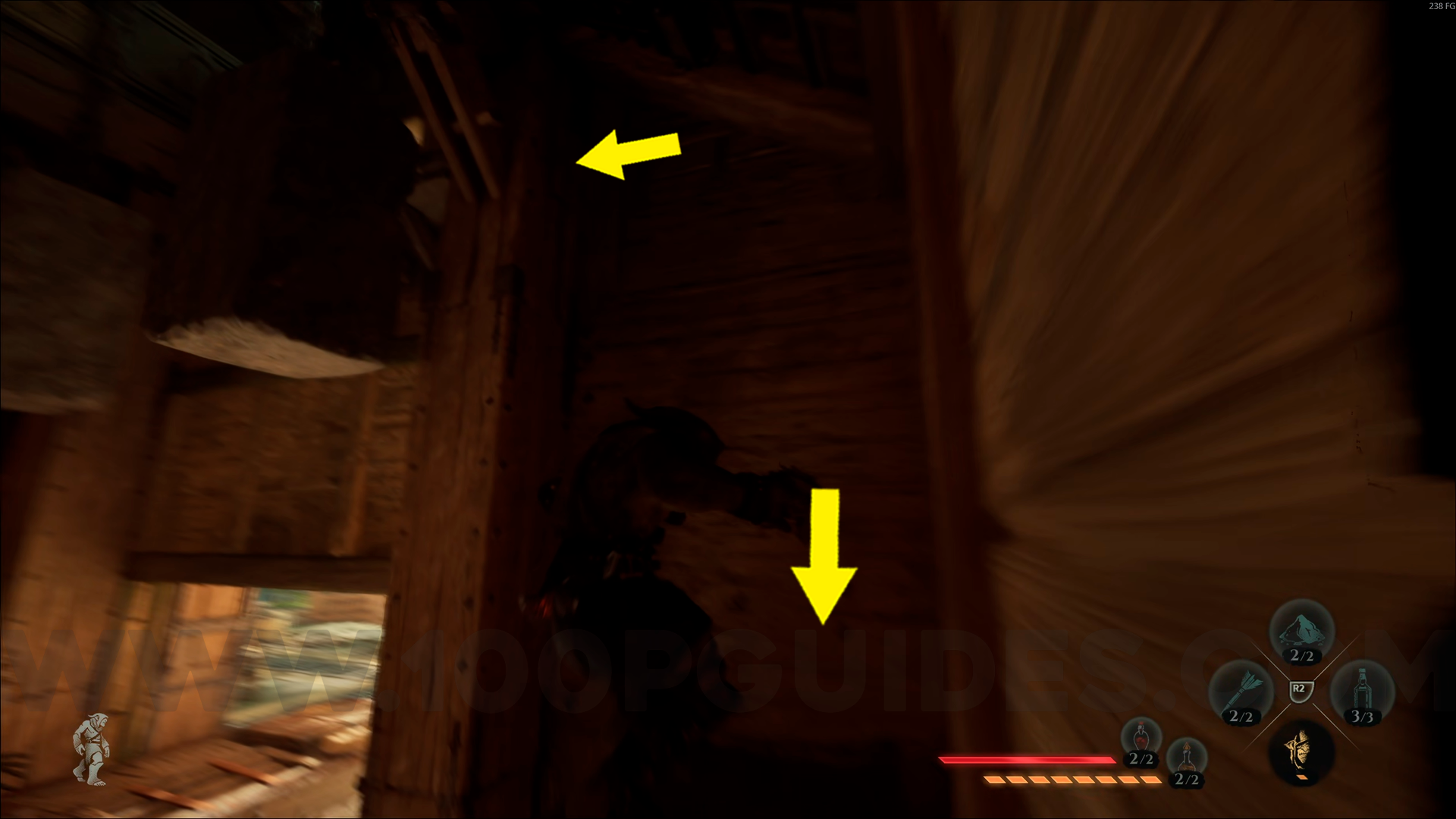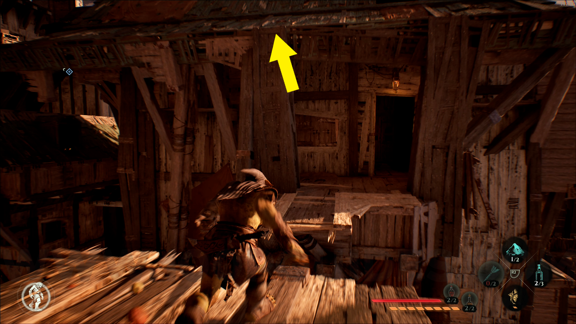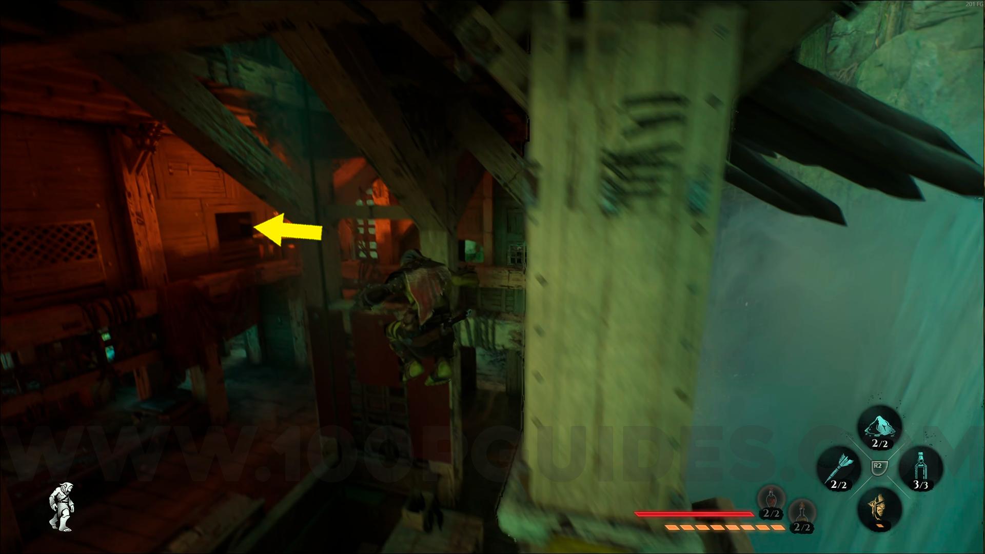 Wood Emblem #2. From the Helledryn's Hideout checkpoint, head right and go down the stairs. Then climb onto the roof of the house in front of you and enter the door next to the crane. Inside, you'll find the emblem. Use Amber Vision to help you spot it.