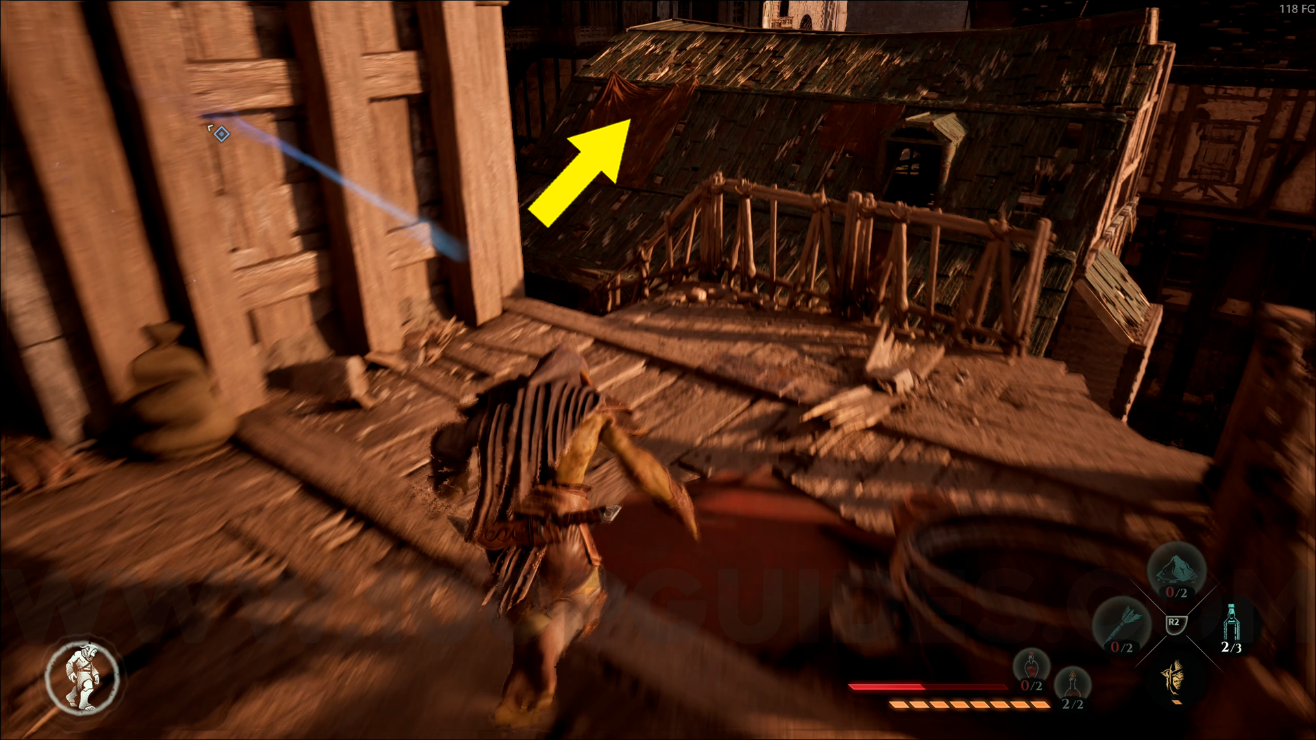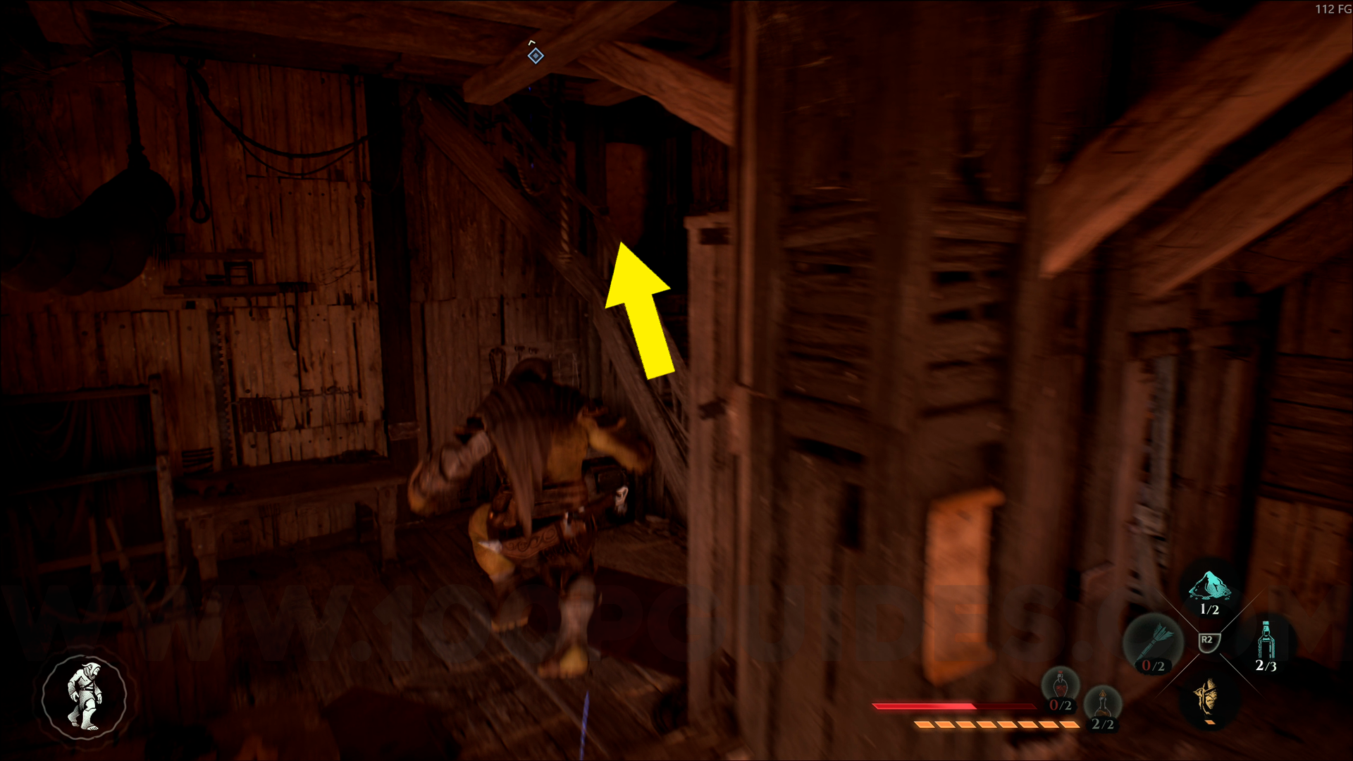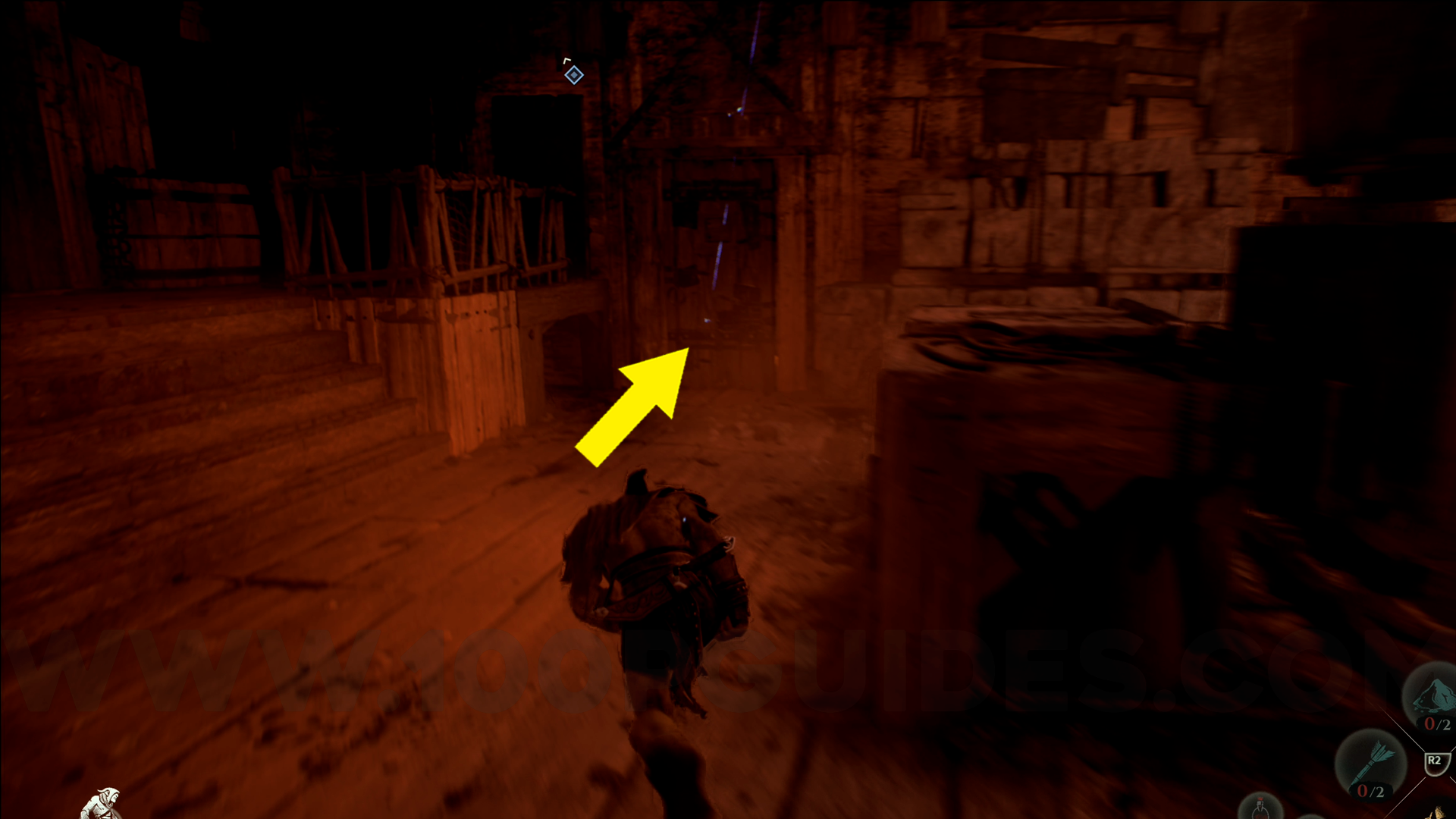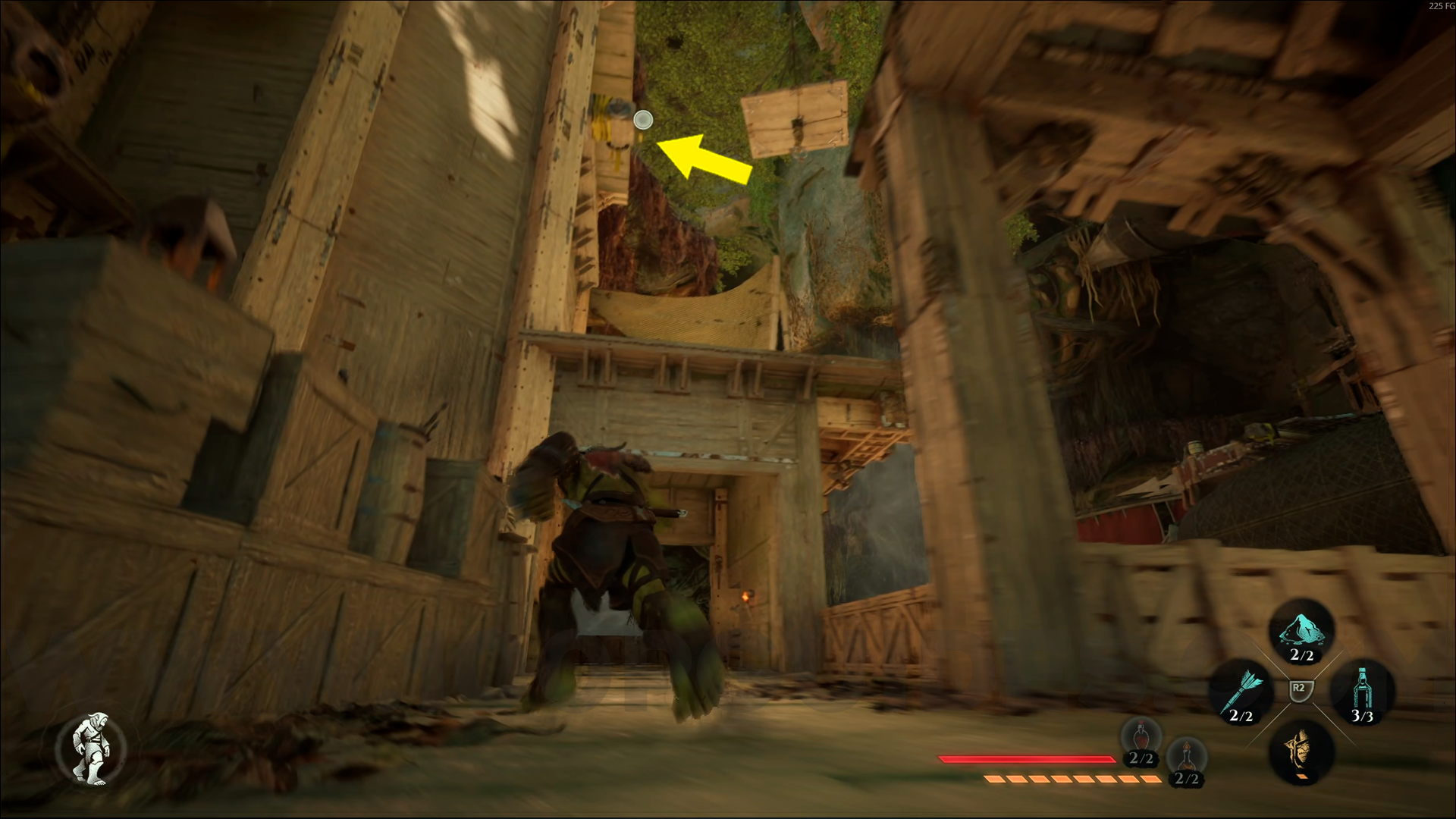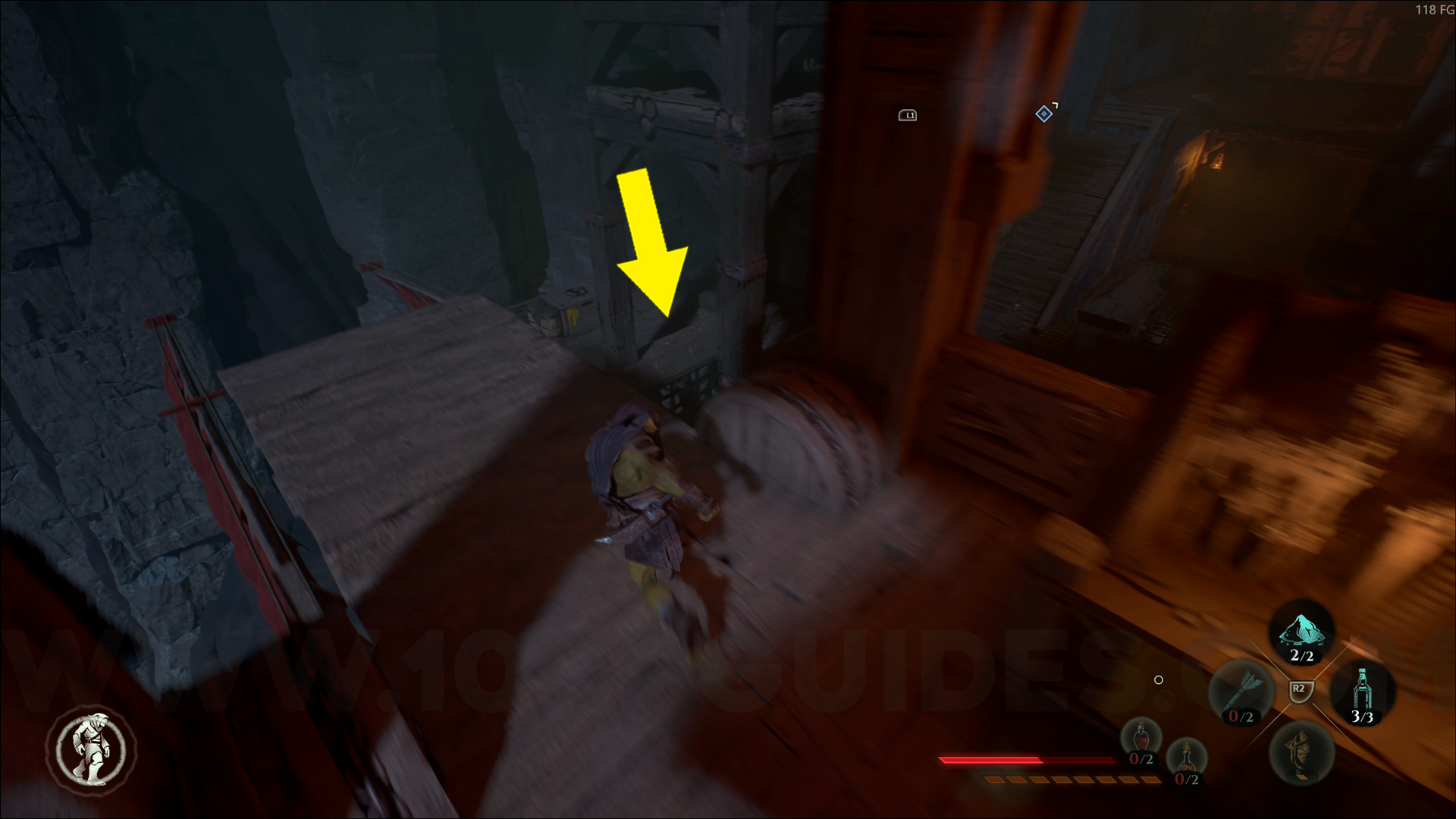 Wood Emblem #2. From the Helledryn's Hideout checkpoint, head right and go down the stairs. Then climb onto the roof of the house in front of you and enter the door next to the crane. Inside, you'll find the emblem. Use Amber Vision to help you spot it.