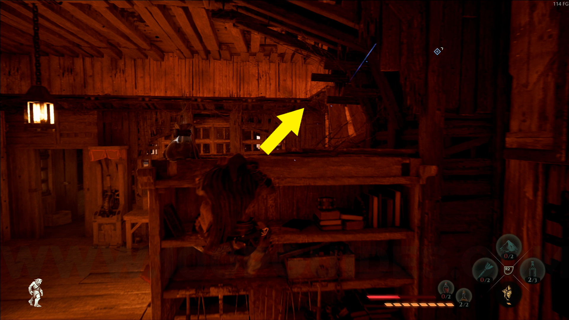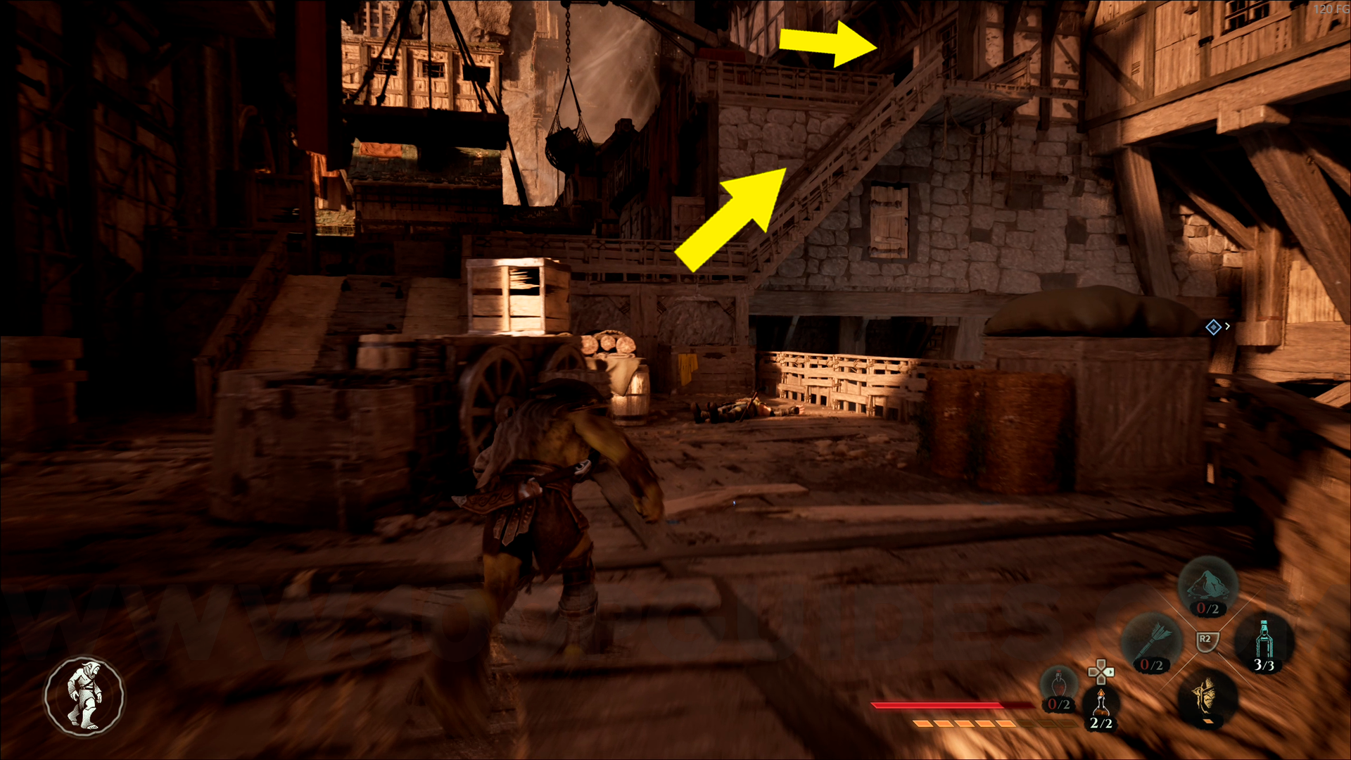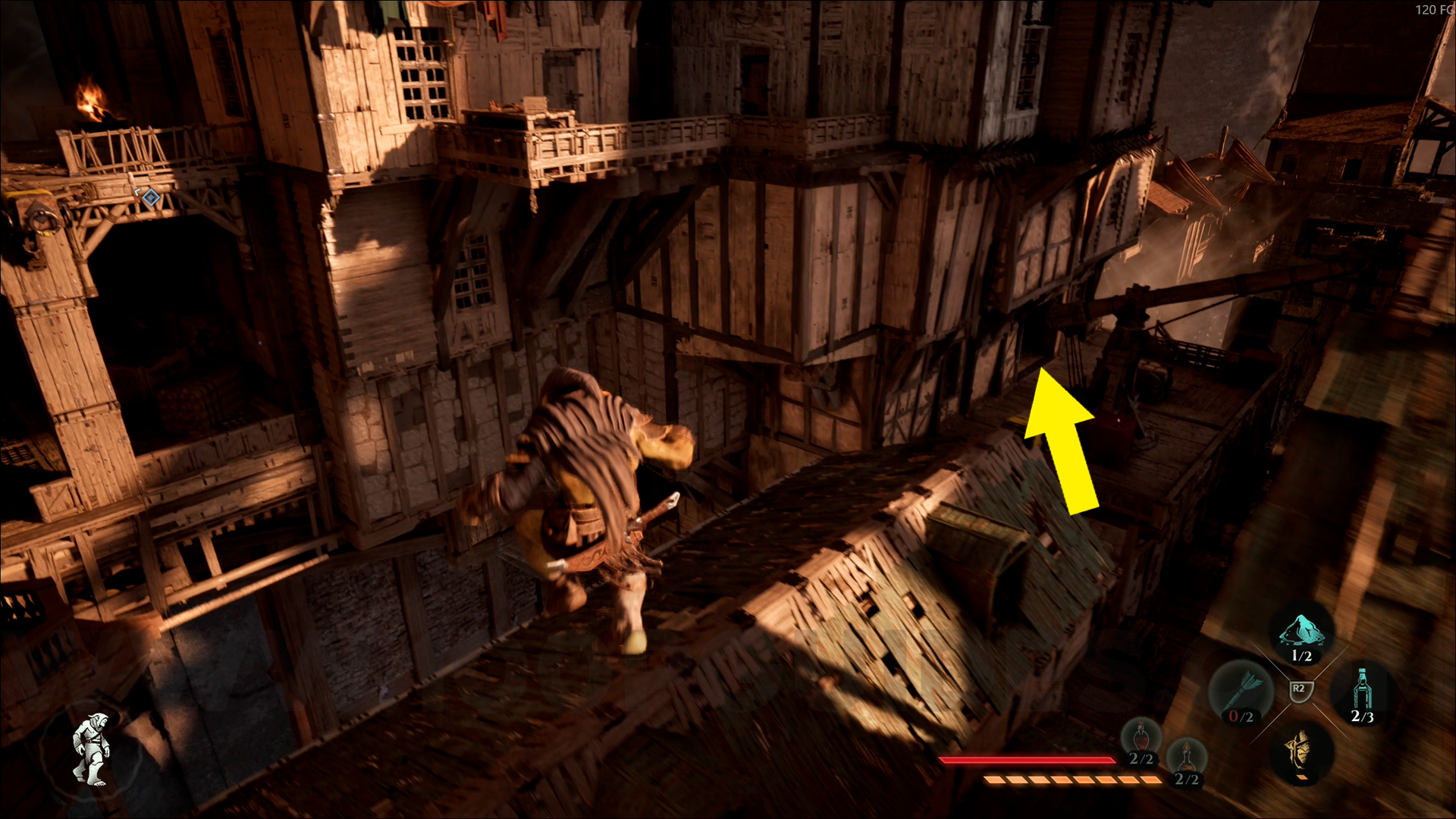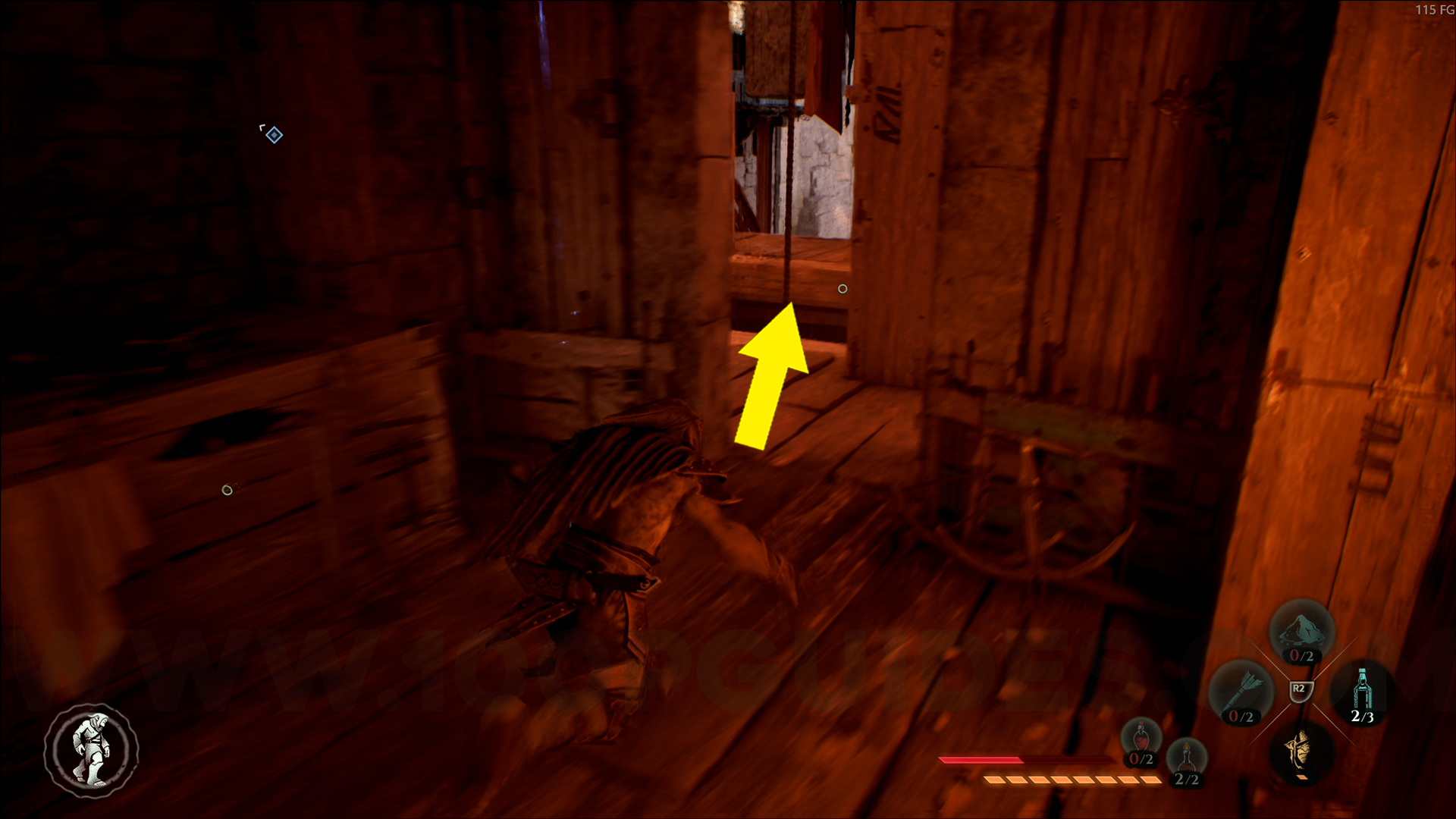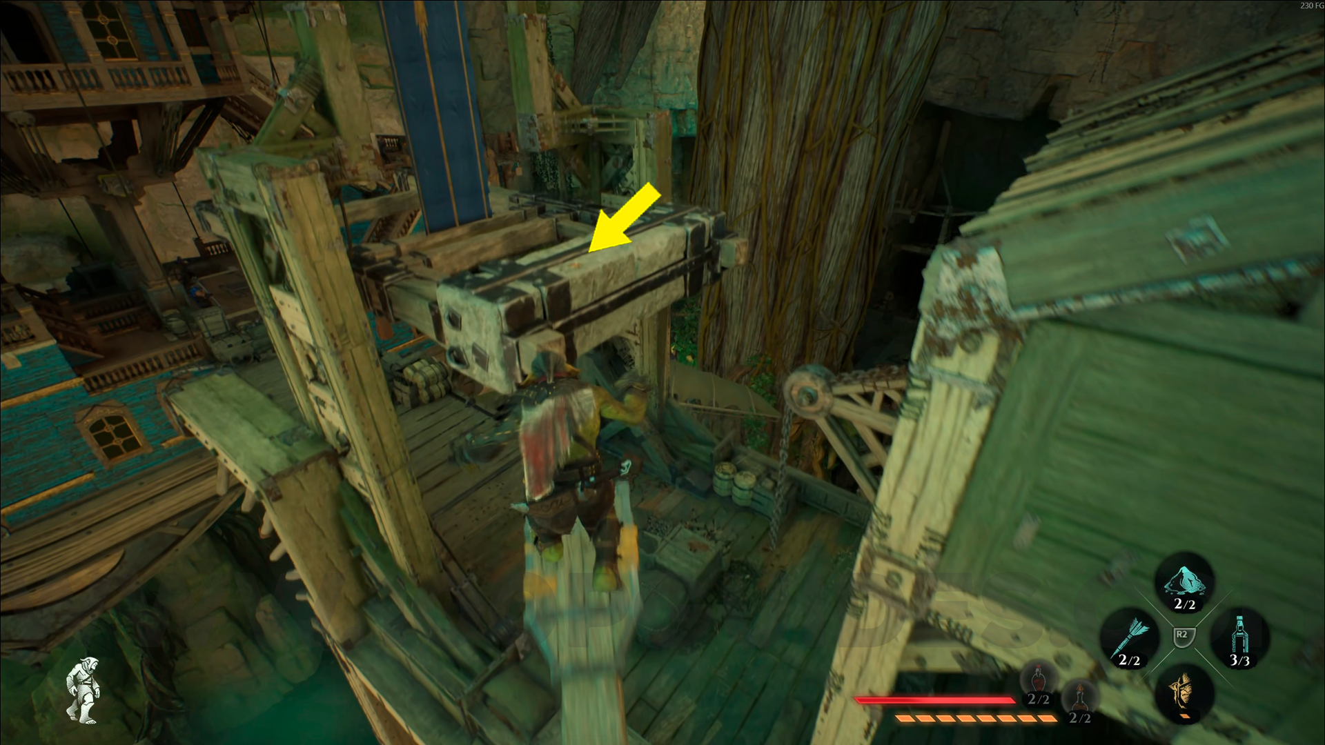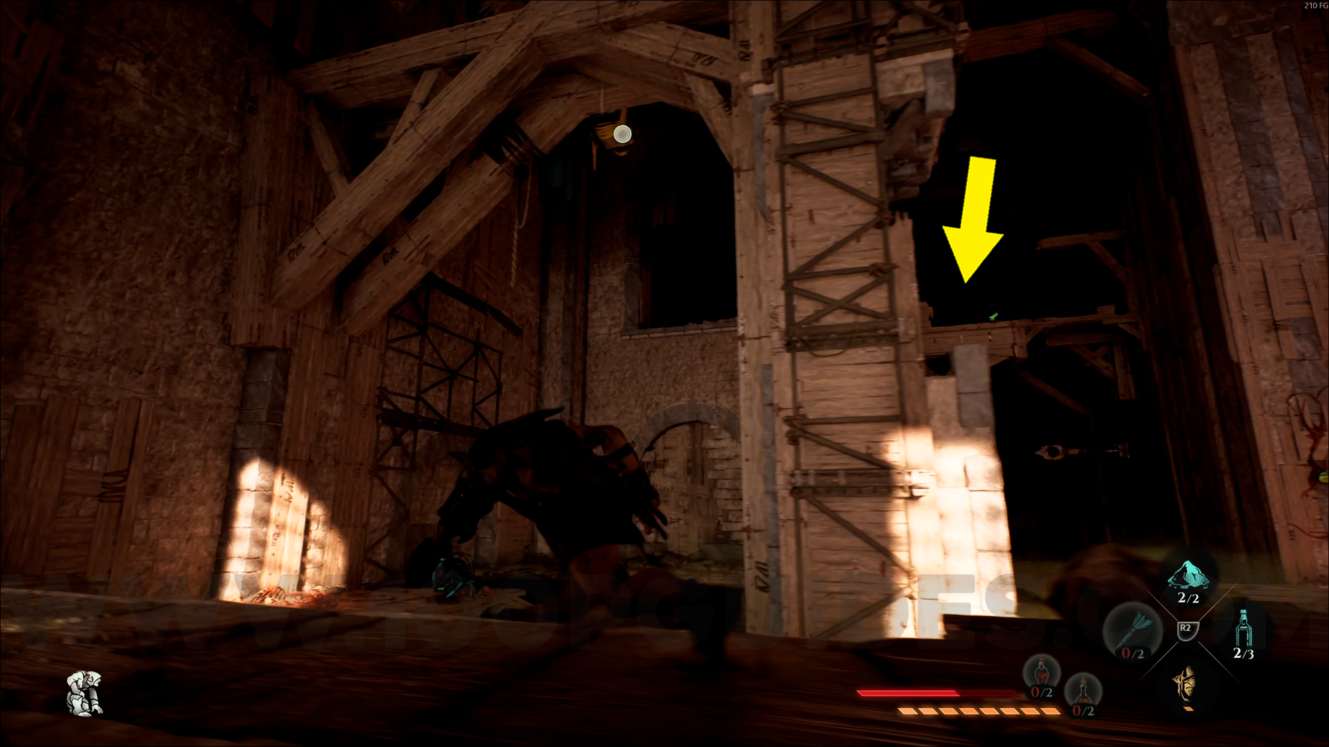 Wood Emblem #2. From the Helledryn's Hideout checkpoint, head right and go down the stairs. Then climb onto the roof of the house in front of you and enter the door next to the crane. Inside, you'll find the emblem. Use Amber Vision to help you spot it.