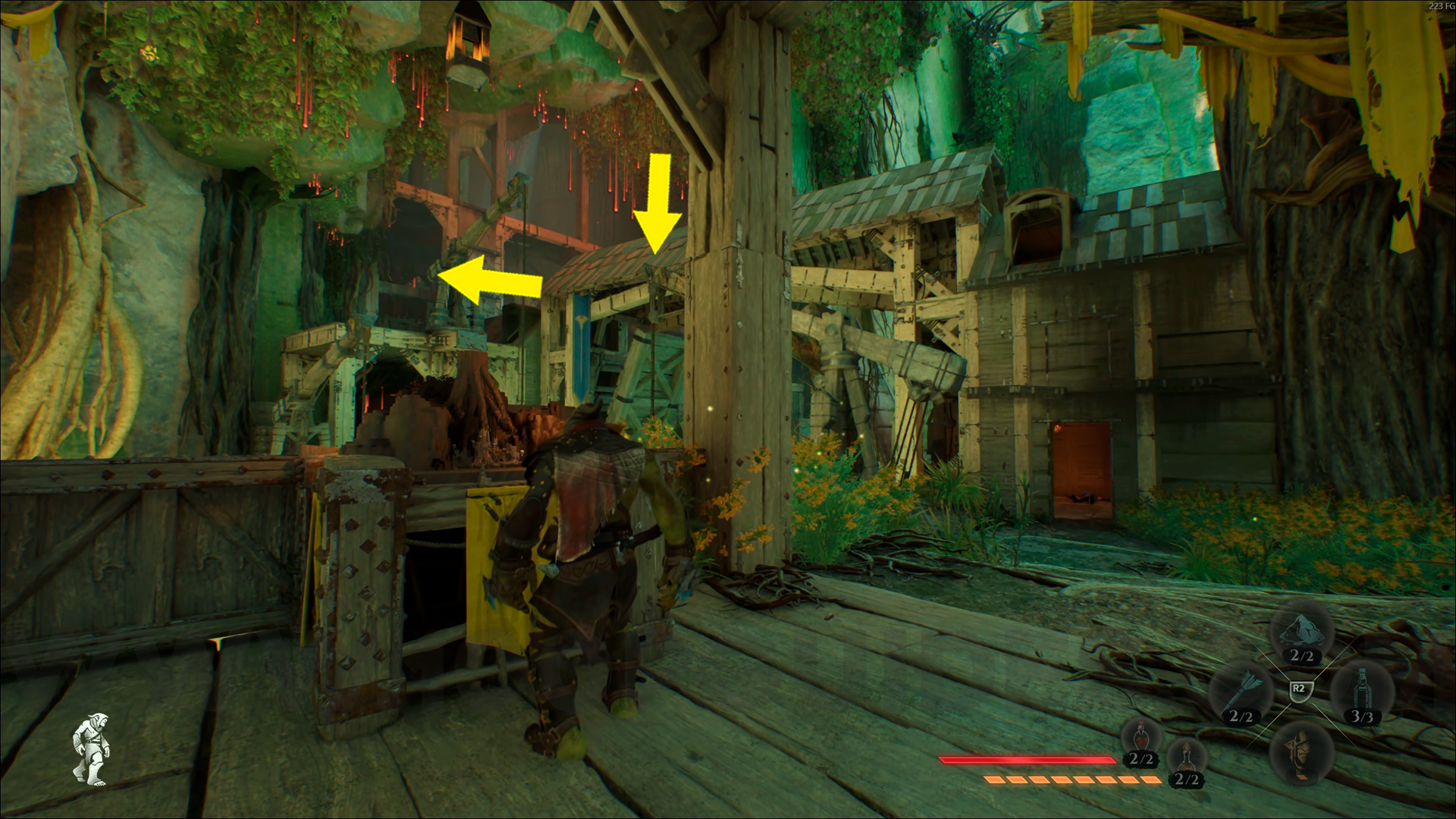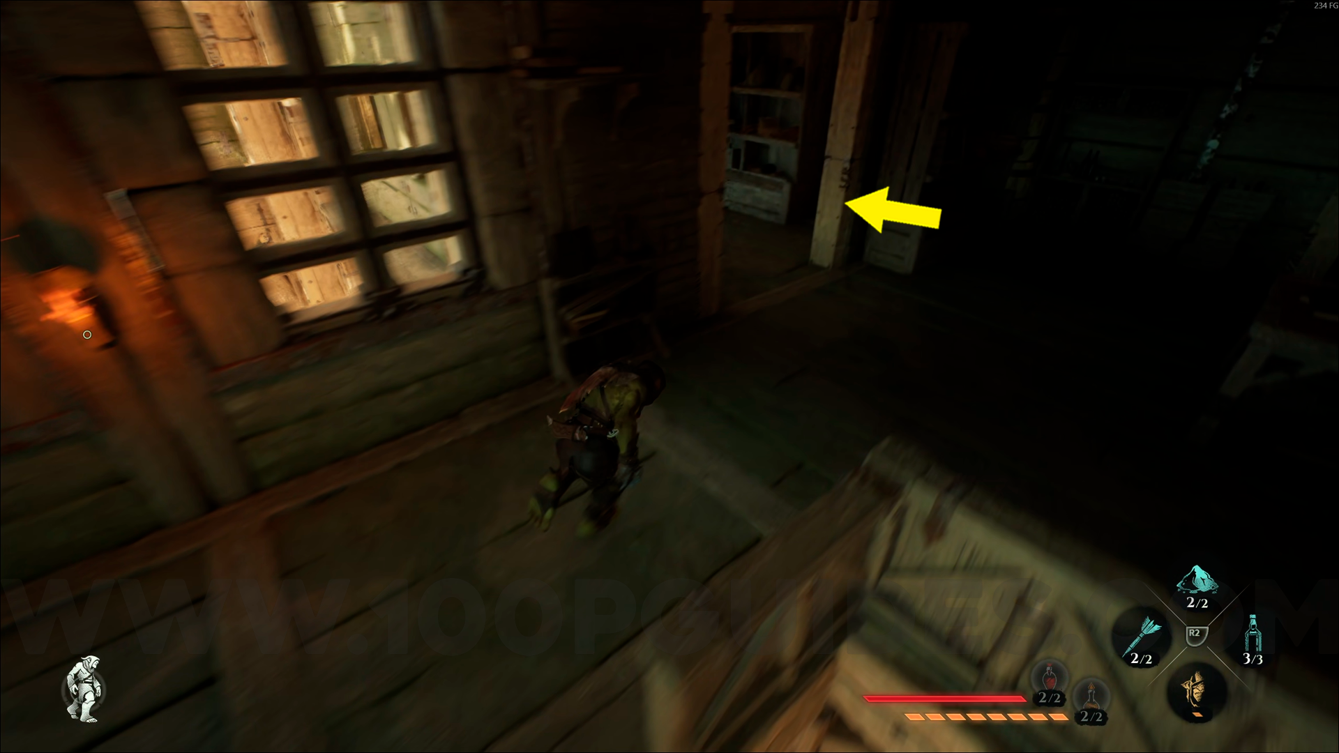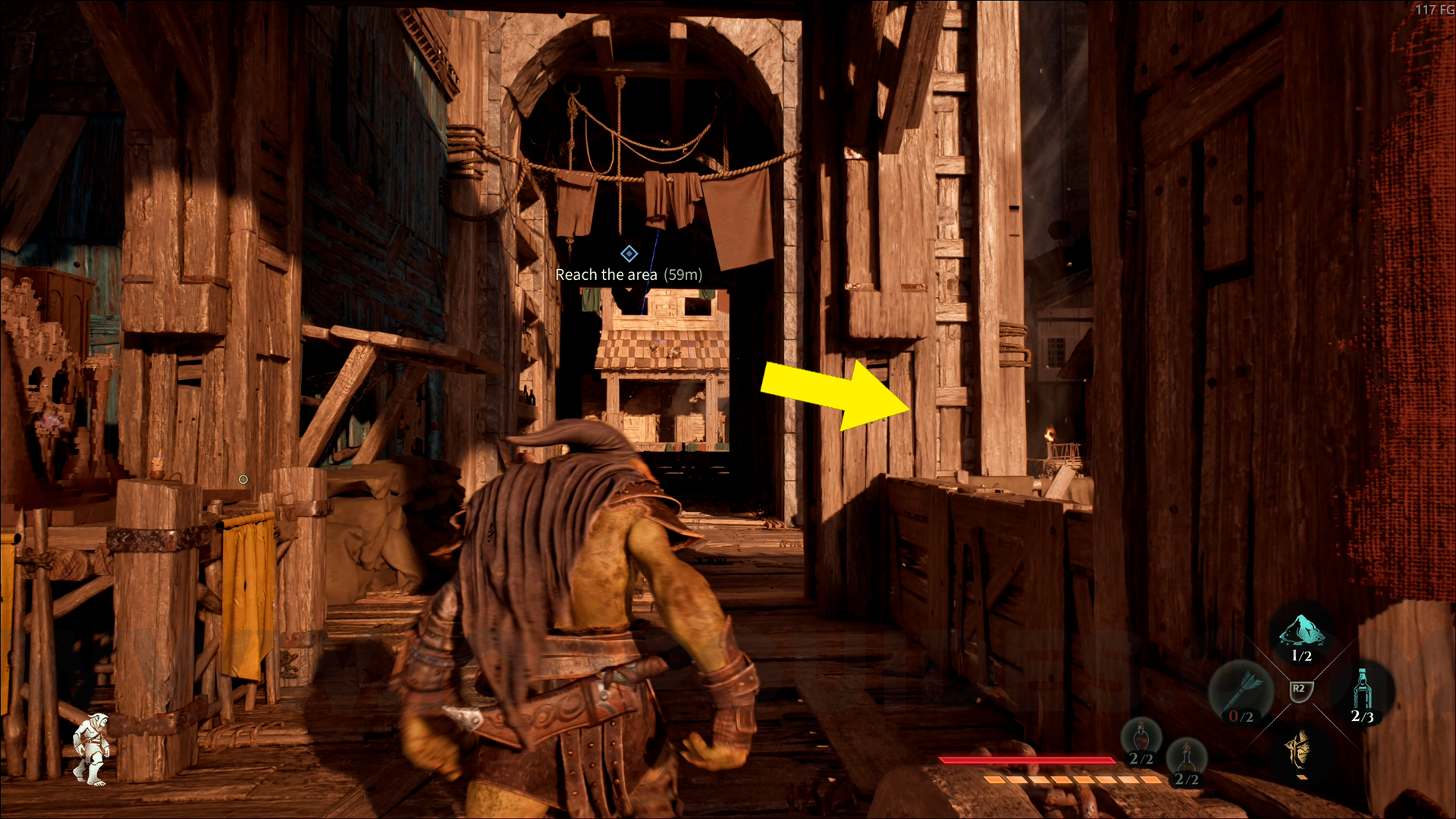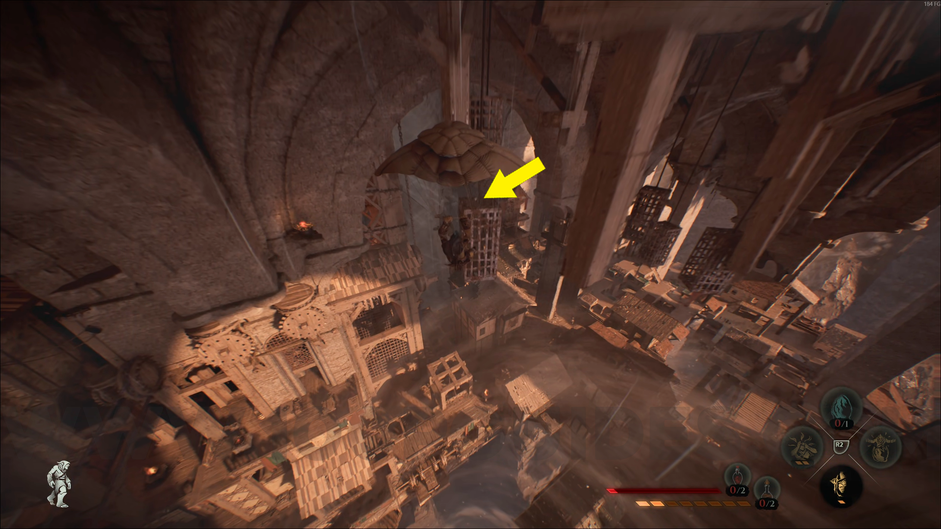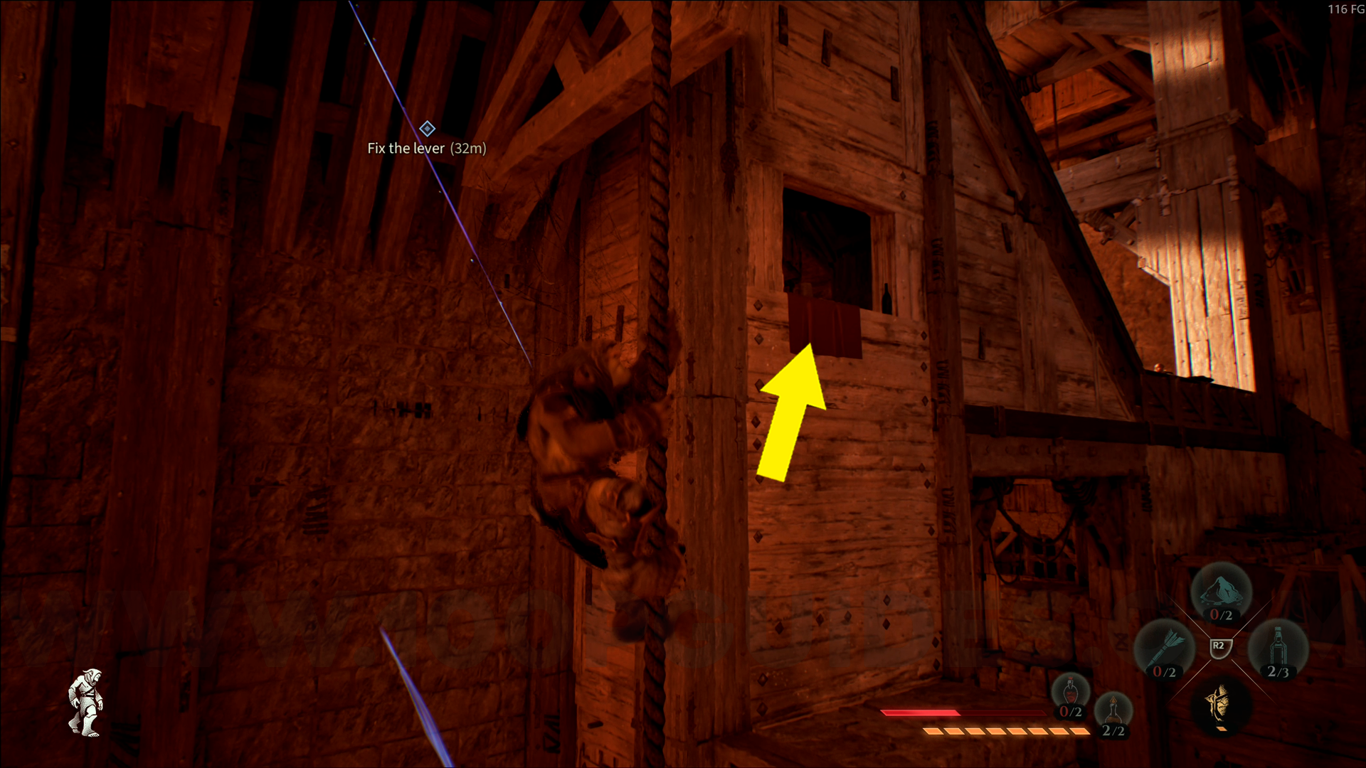 Wood Emblem #2. From the Helledryn's Hideout checkpoint, head right and go down the stairs. Then climb onto the roof of the house in front of you and enter the door next to the crane. Inside, you'll find the emblem. Use Amber Vision to help you spot it.