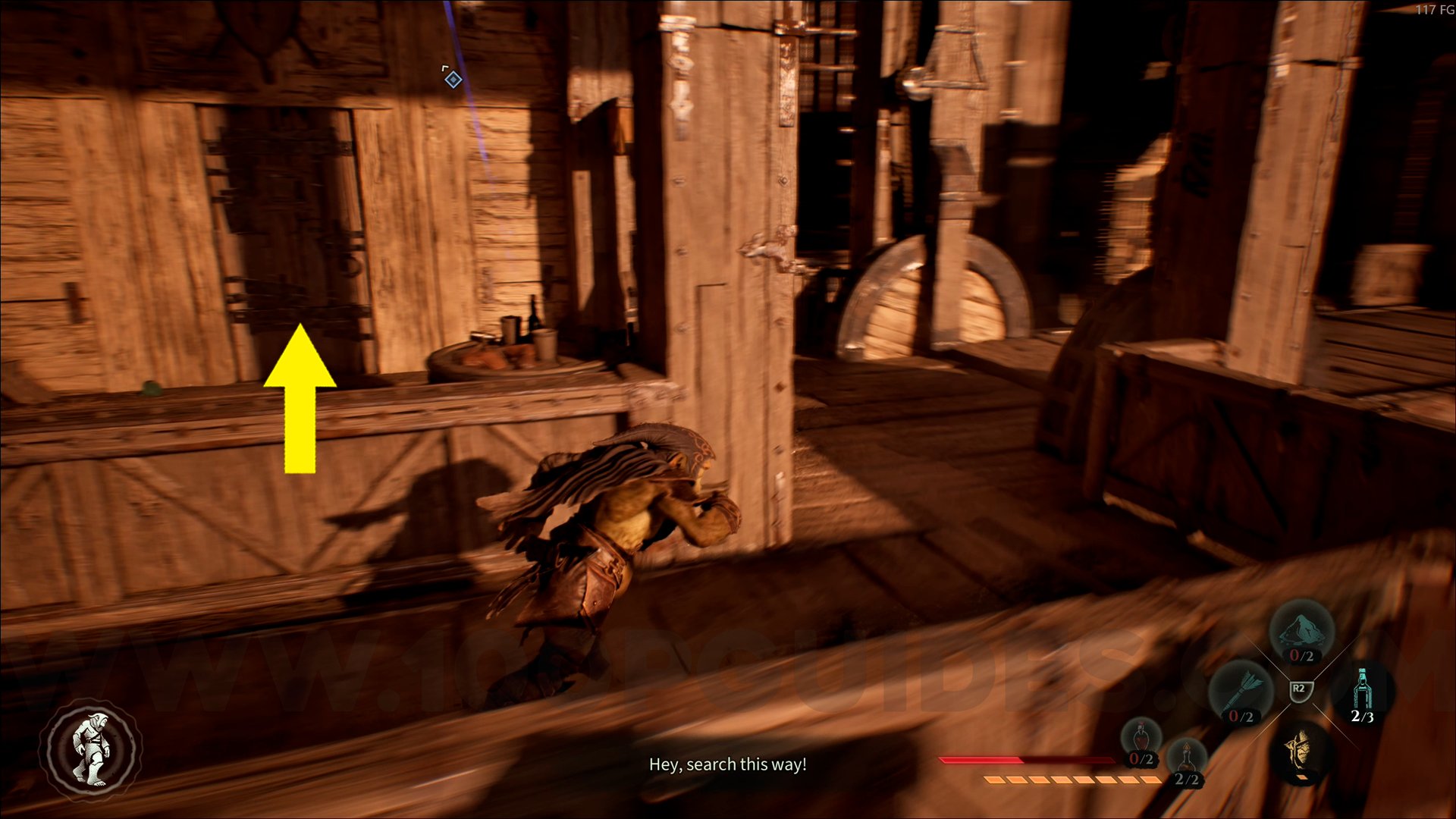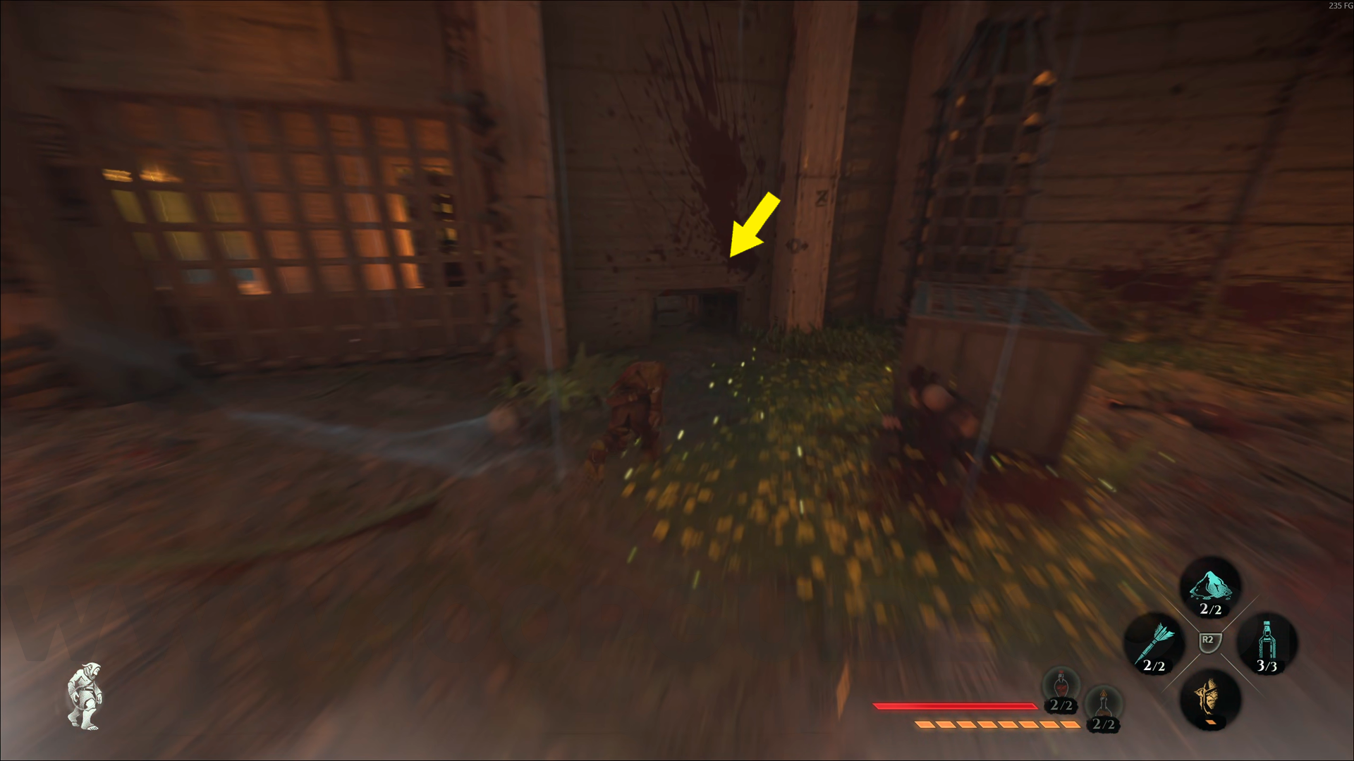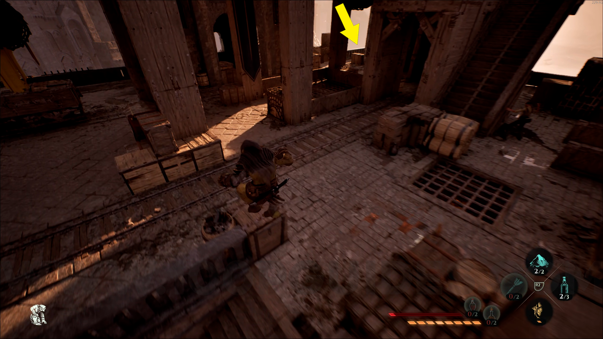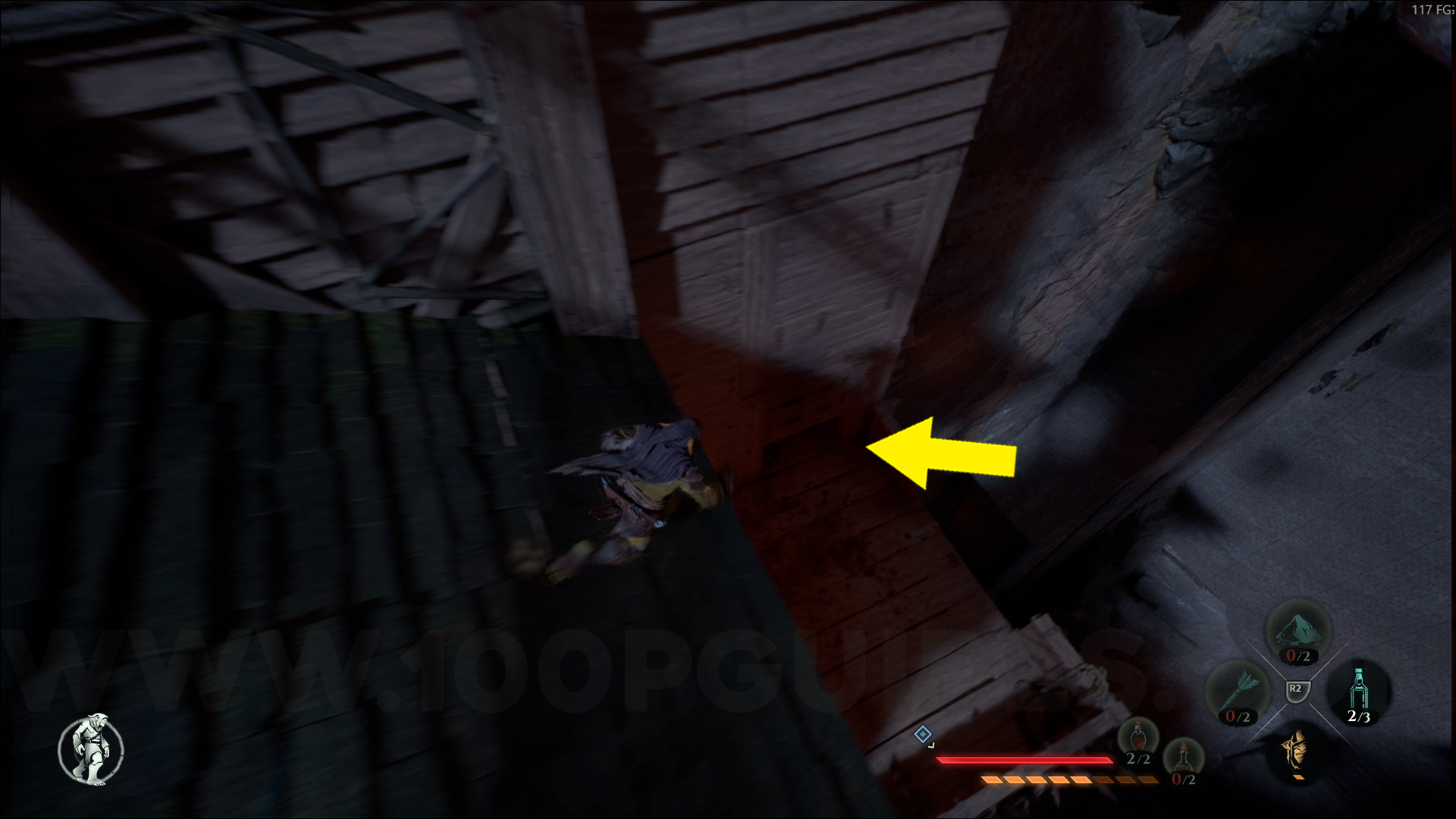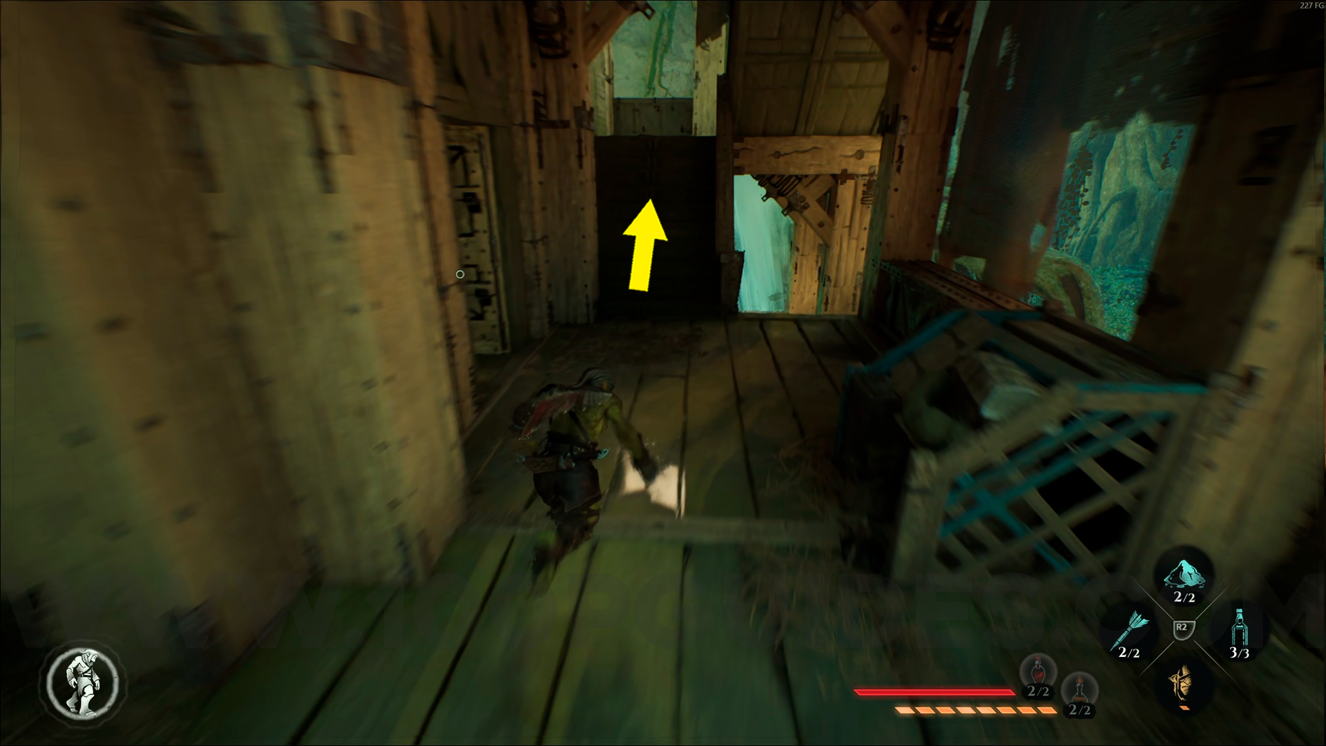 Wood Emblem #2. From the Helledryn's Hideout checkpoint, head right and go down the stairs. Then climb onto the roof of the house in front of you and enter the door next to the crane. Inside, you'll find the emblem. Use Amber Vision to help you spot it.