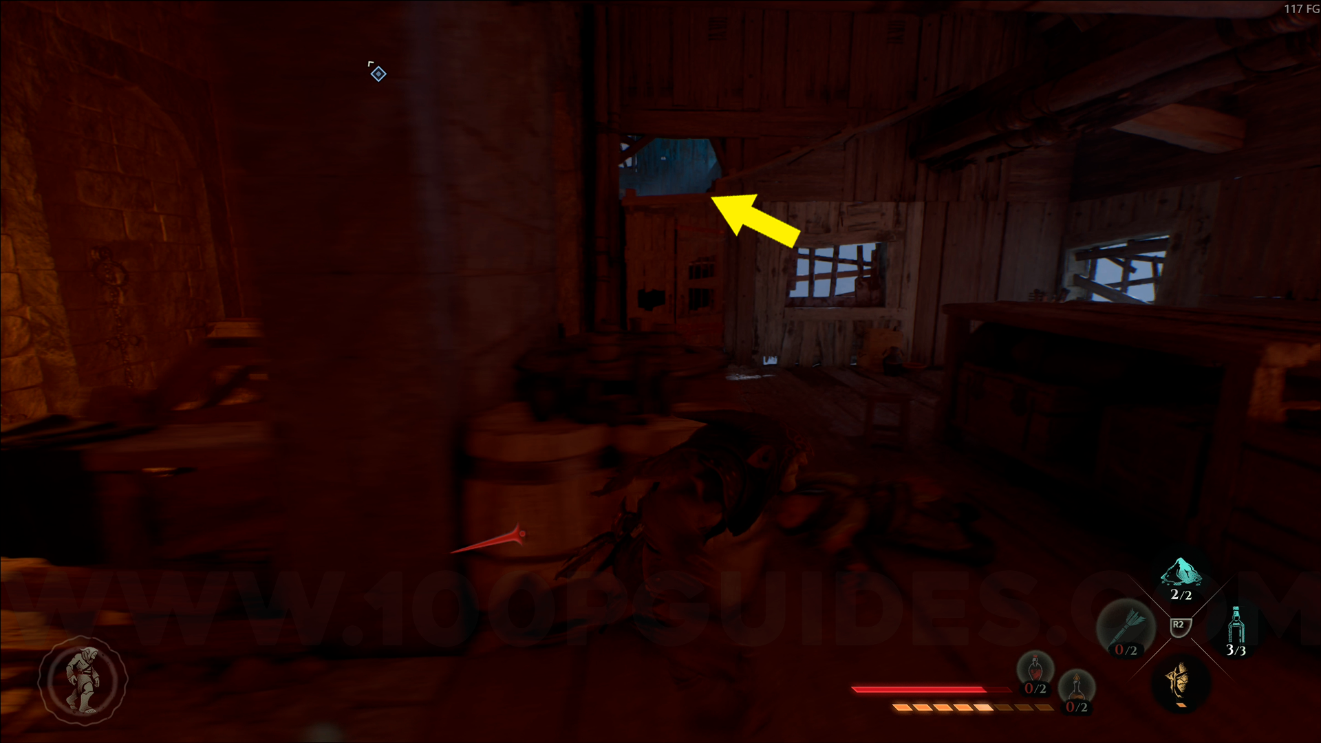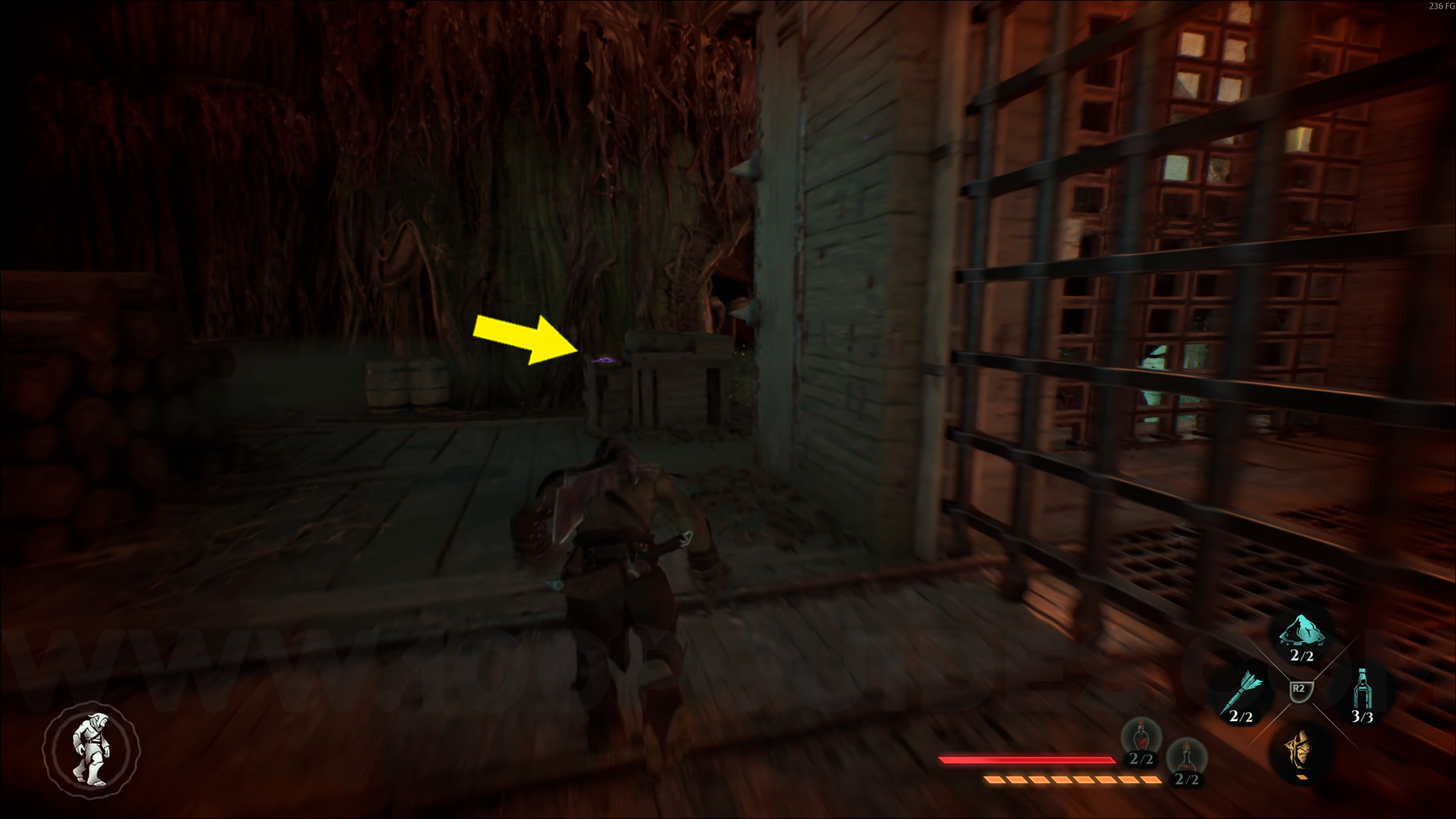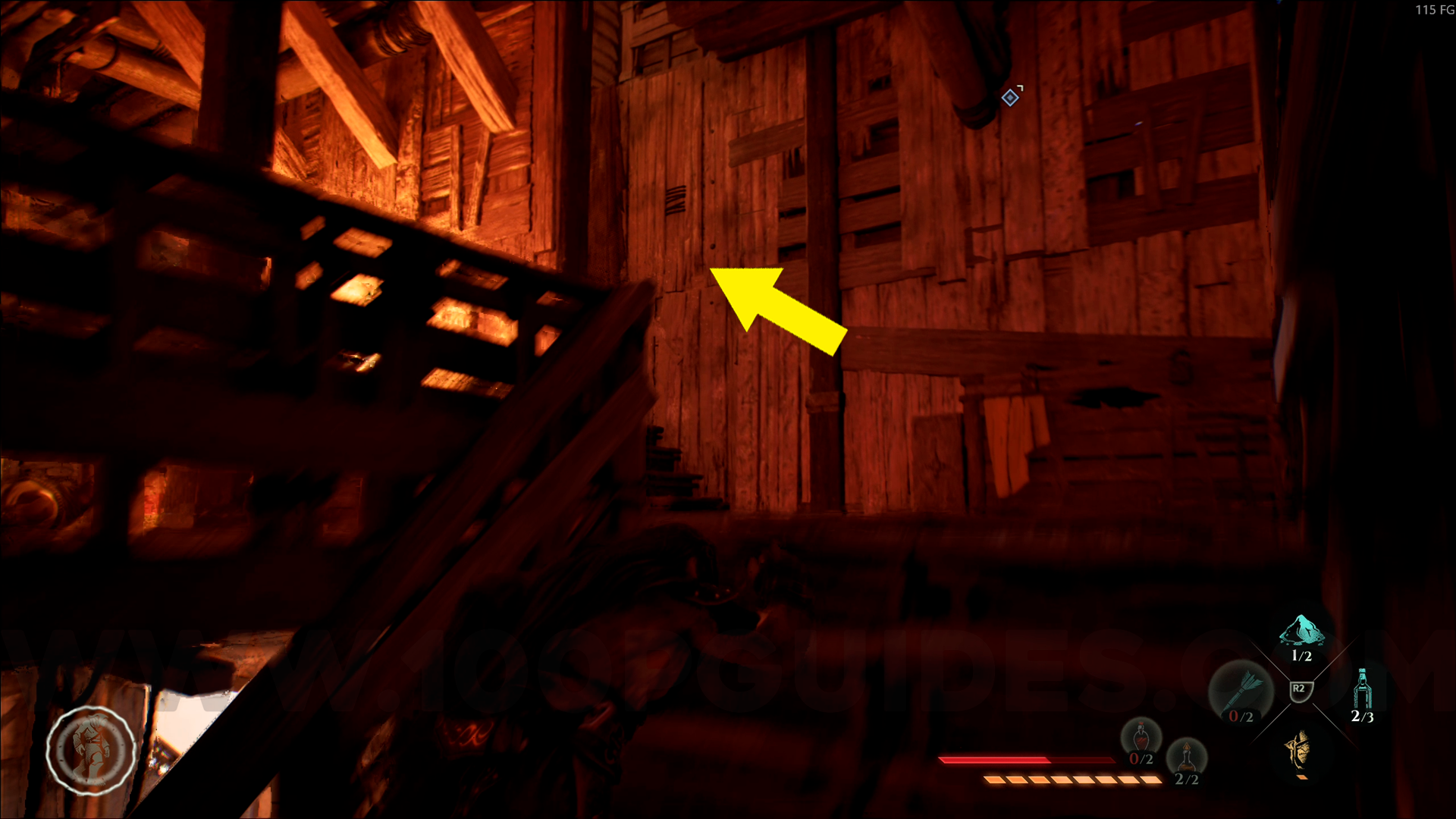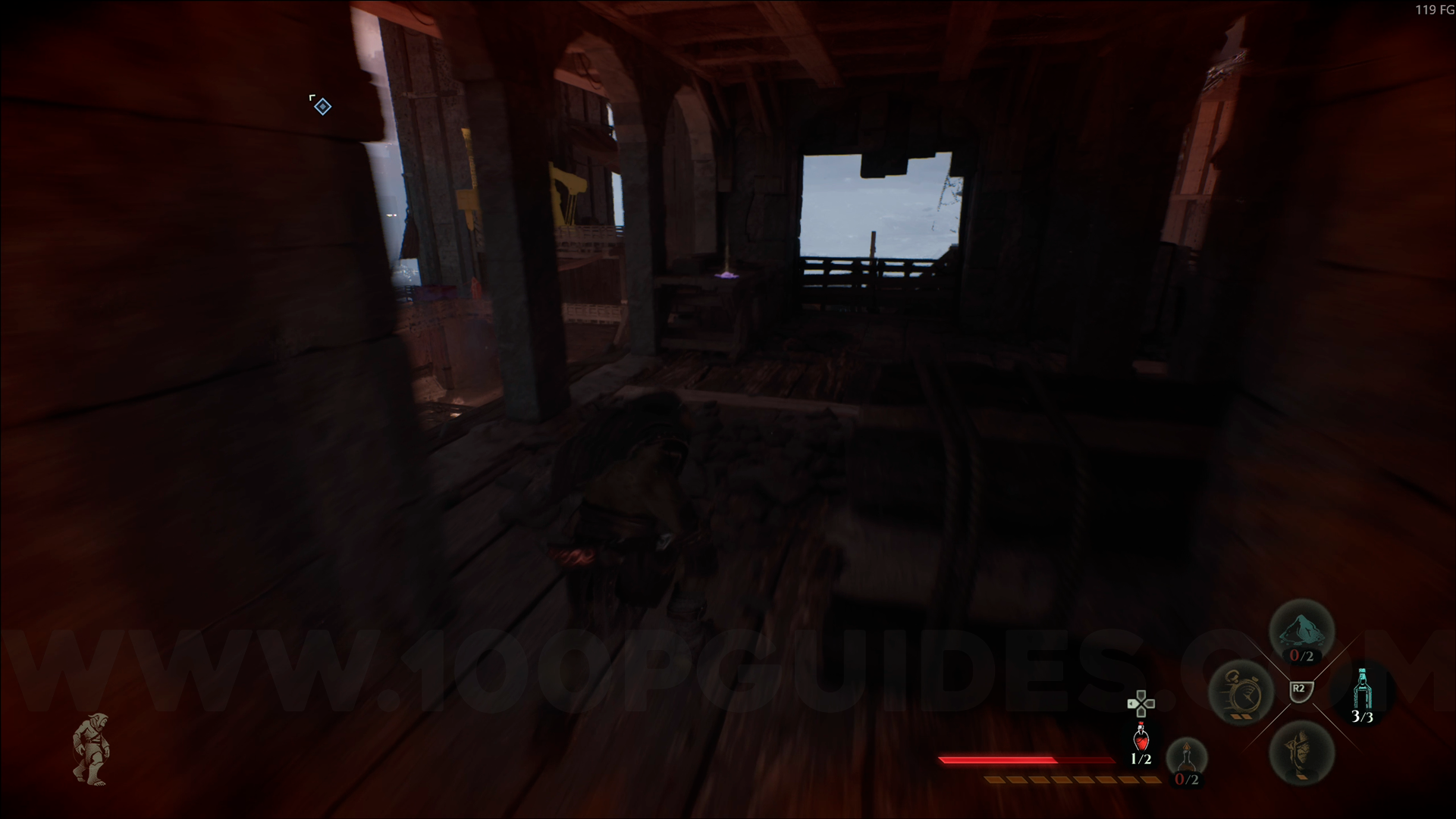 Wood Emblem #6. From the Wailing Widow Tavern checkpoint, head down the right side toward the bridge. Then go up the stairs on the left and pass through the door. Once inside, go up two flights of stairs, go through the hole in the wall, and continue forward to the door on the other side of the area. After going through that door, head down the stairs to the lower area. This emblem will be under a table. Use Amber Vision to help you spot it.