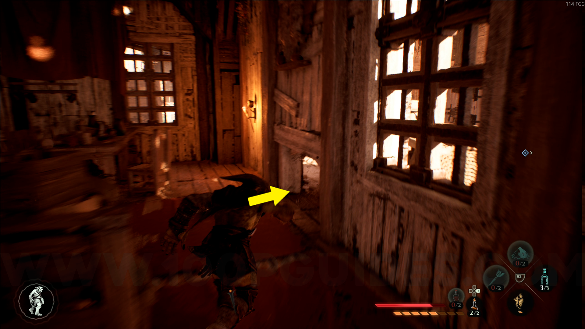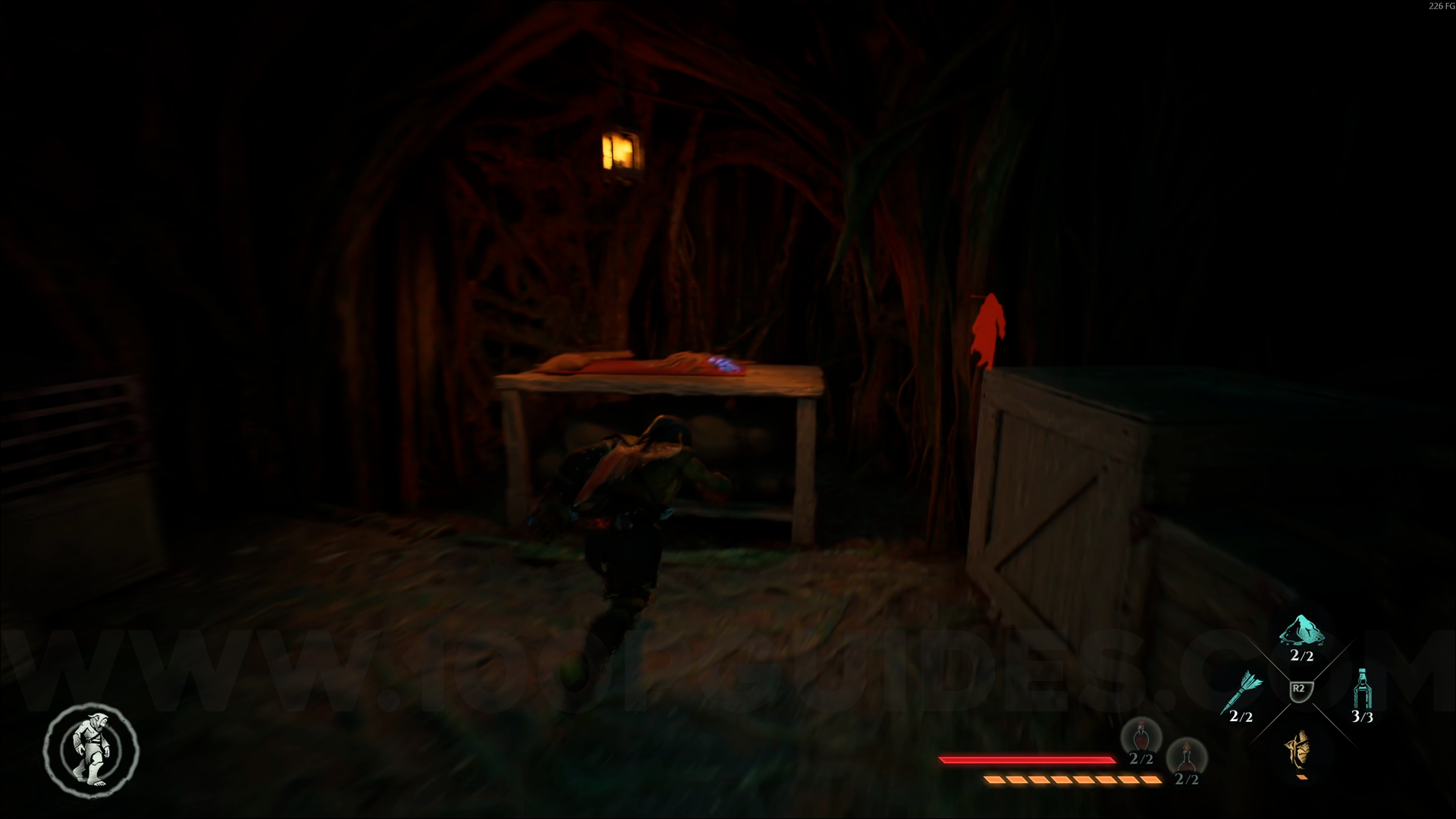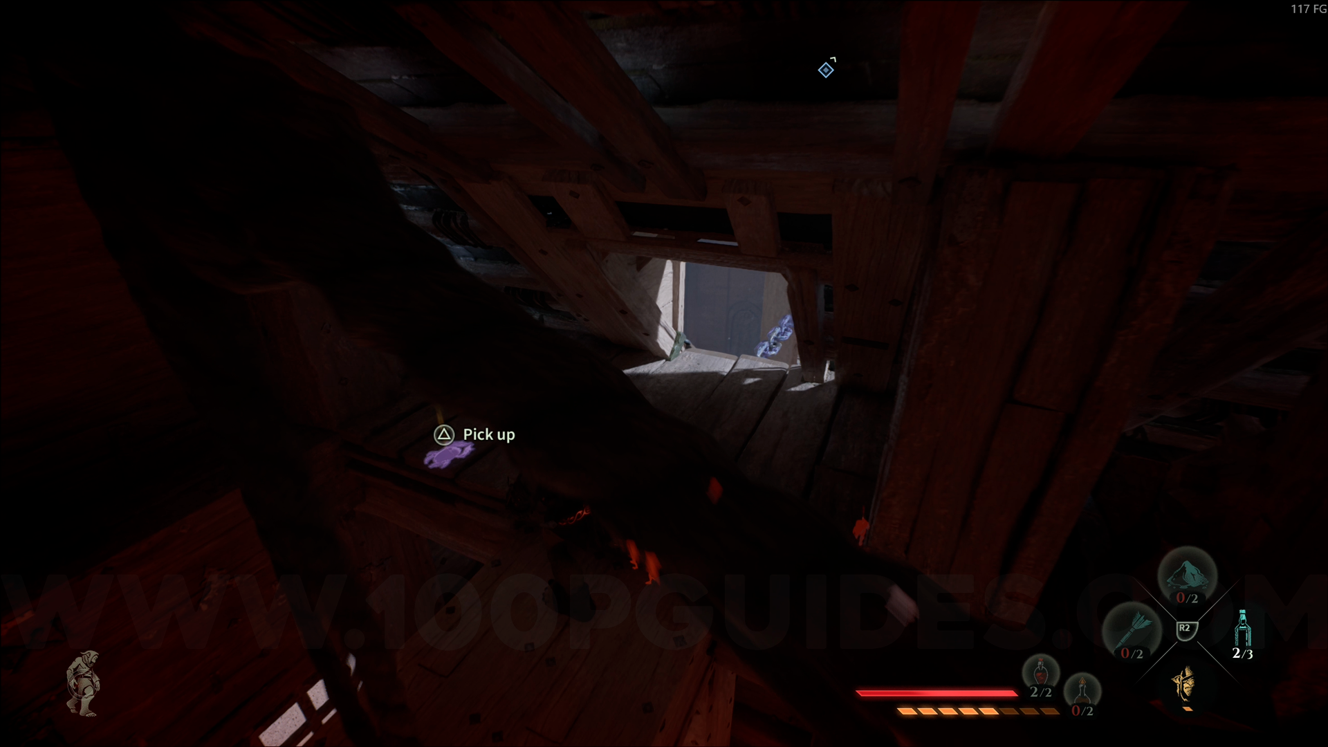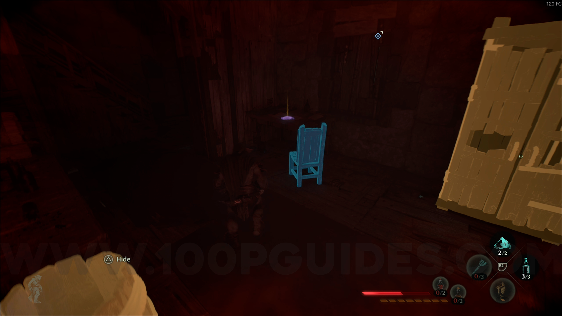 Wood Emblem #6. From the Wailing Widow Tavern checkpoint, head down the right side toward the bridge. Then go up the stairs on the left and pass through the door. Once inside, go up two flights of stairs, go through the hole in the wall, and continue forward to the door on the other side of the area. After going through that door, head down the stairs to the lower area. This emblem will be under a table. Use Amber Vision to help you spot it.