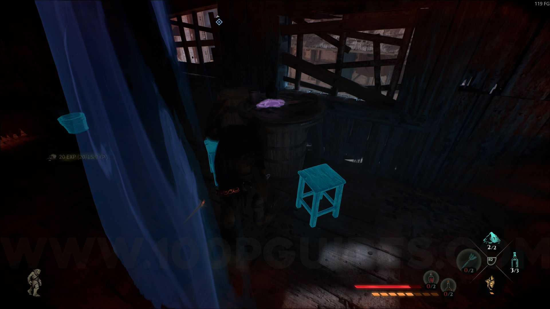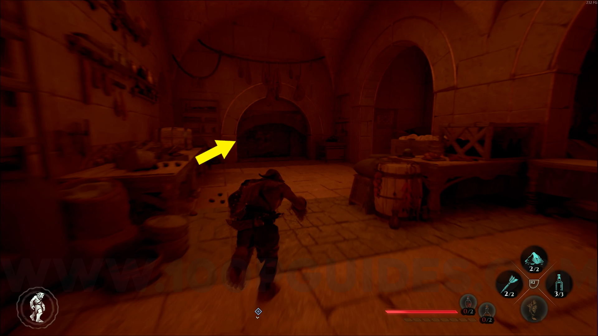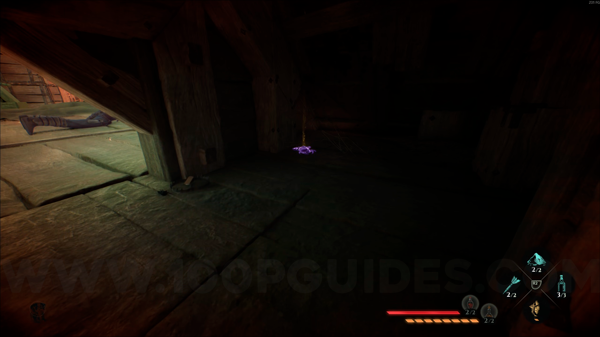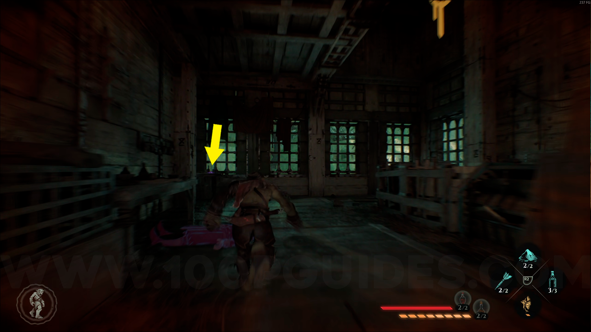 Wood Emblem #6. From the Wailing Widow Tavern checkpoint, head down the right side toward the bridge. Then go up the stairs on the left and pass through the door. Once inside, go up two flights of stairs, go through the hole in the wall, and continue forward to the door on the other side of the area. After going through that door, head down the stairs to the lower area. This emblem will be under a table. Use Amber Vision to help you spot it.