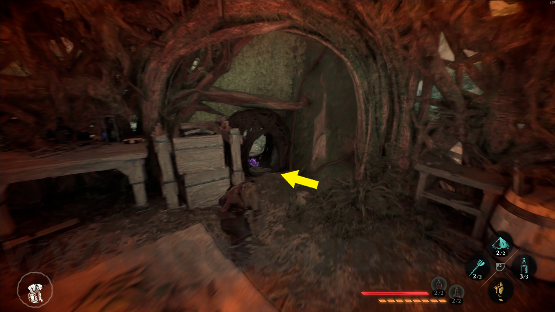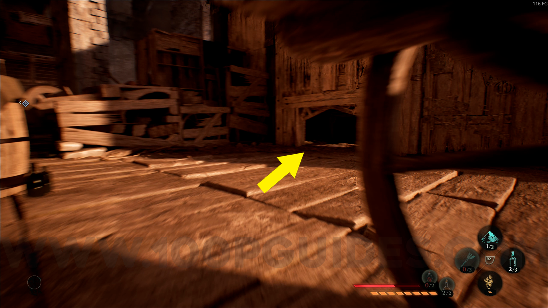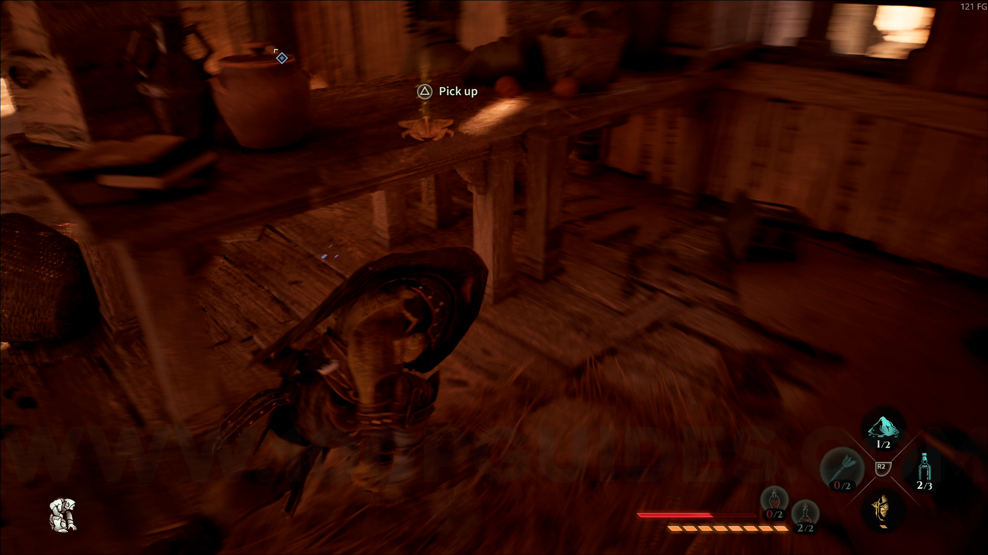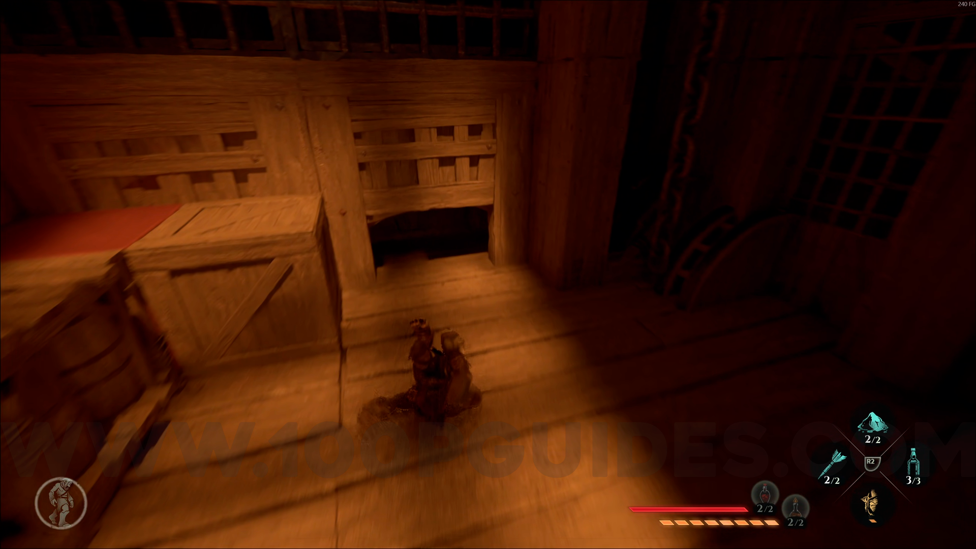 Wood Emblem #6. From the Wailing Widow Tavern checkpoint, head down the right side toward the bridge. Then go up the stairs on the left and pass through the door. Once inside, go up two flights of stairs, go through the hole in the wall, and continue forward to the door on the other side of the area. After going through that door, head down the stairs to the lower area. This emblem will be under a table. Use Amber Vision to help you spot it.