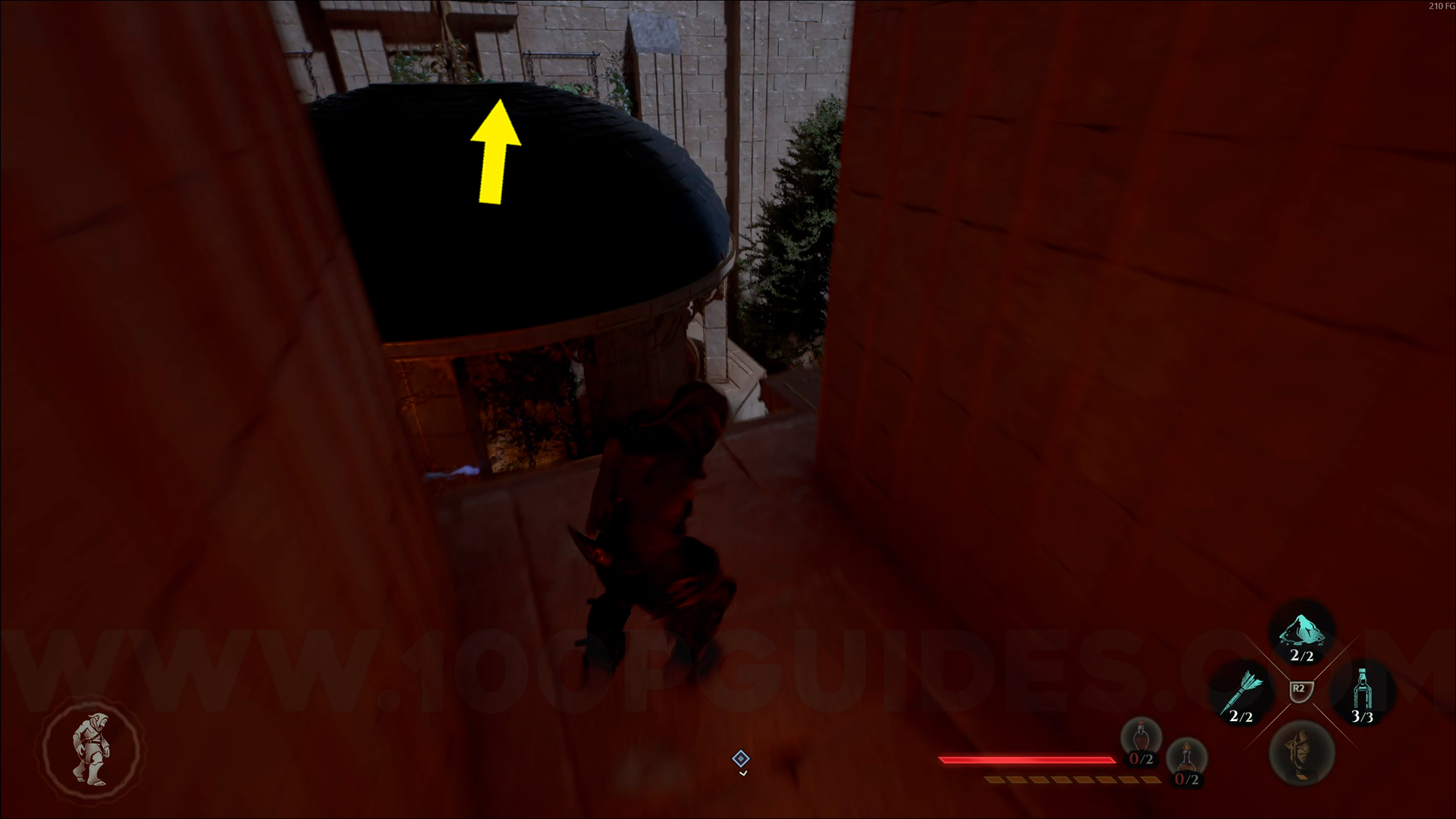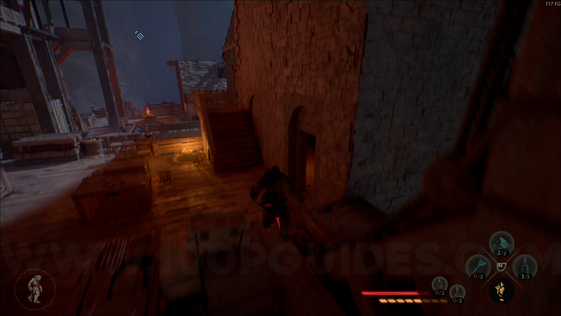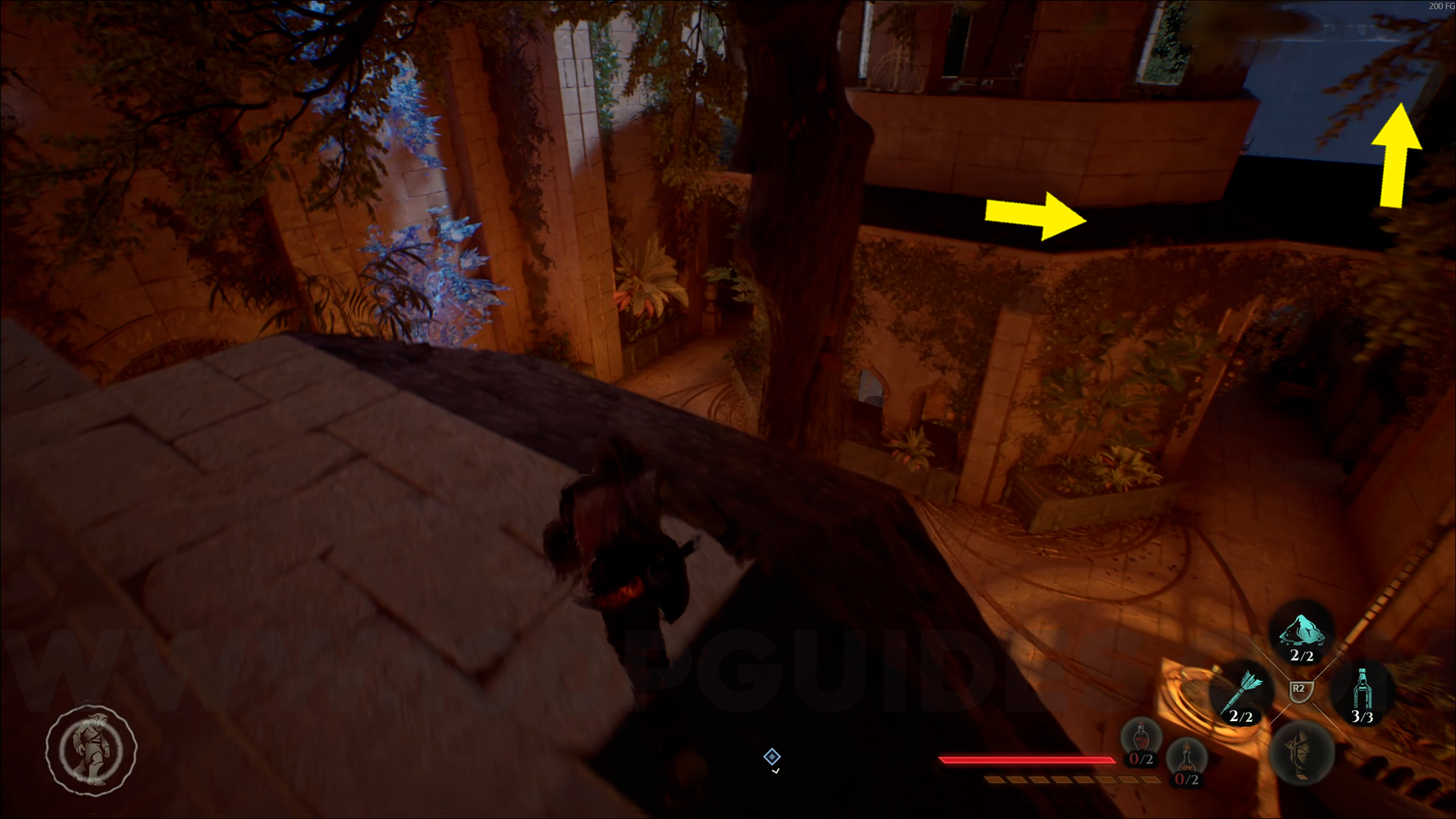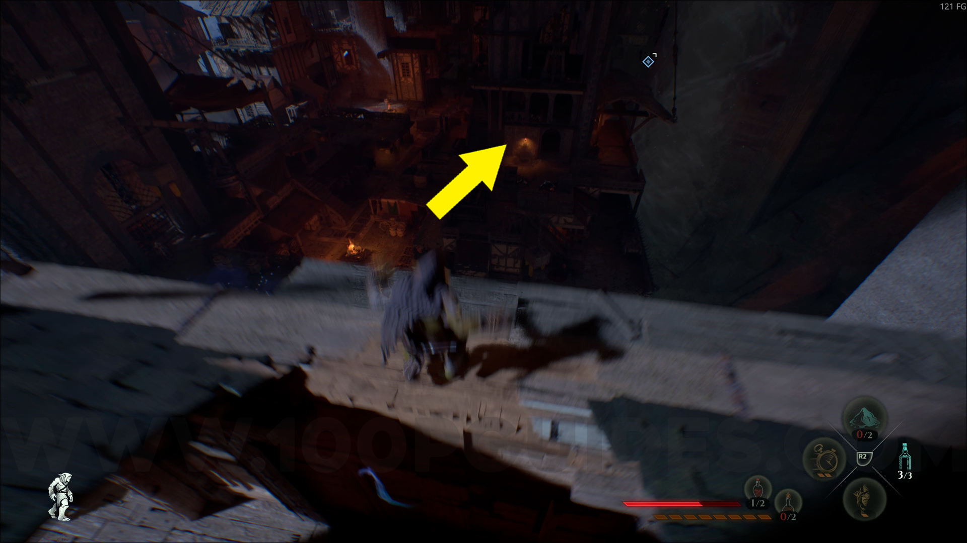 Gold Emblem #2. Right after the previous collectible, go back out through the door you entered and head to the building on your right. This emblem will be on the balcony of that building. Use Amber Vision to help you spot it.