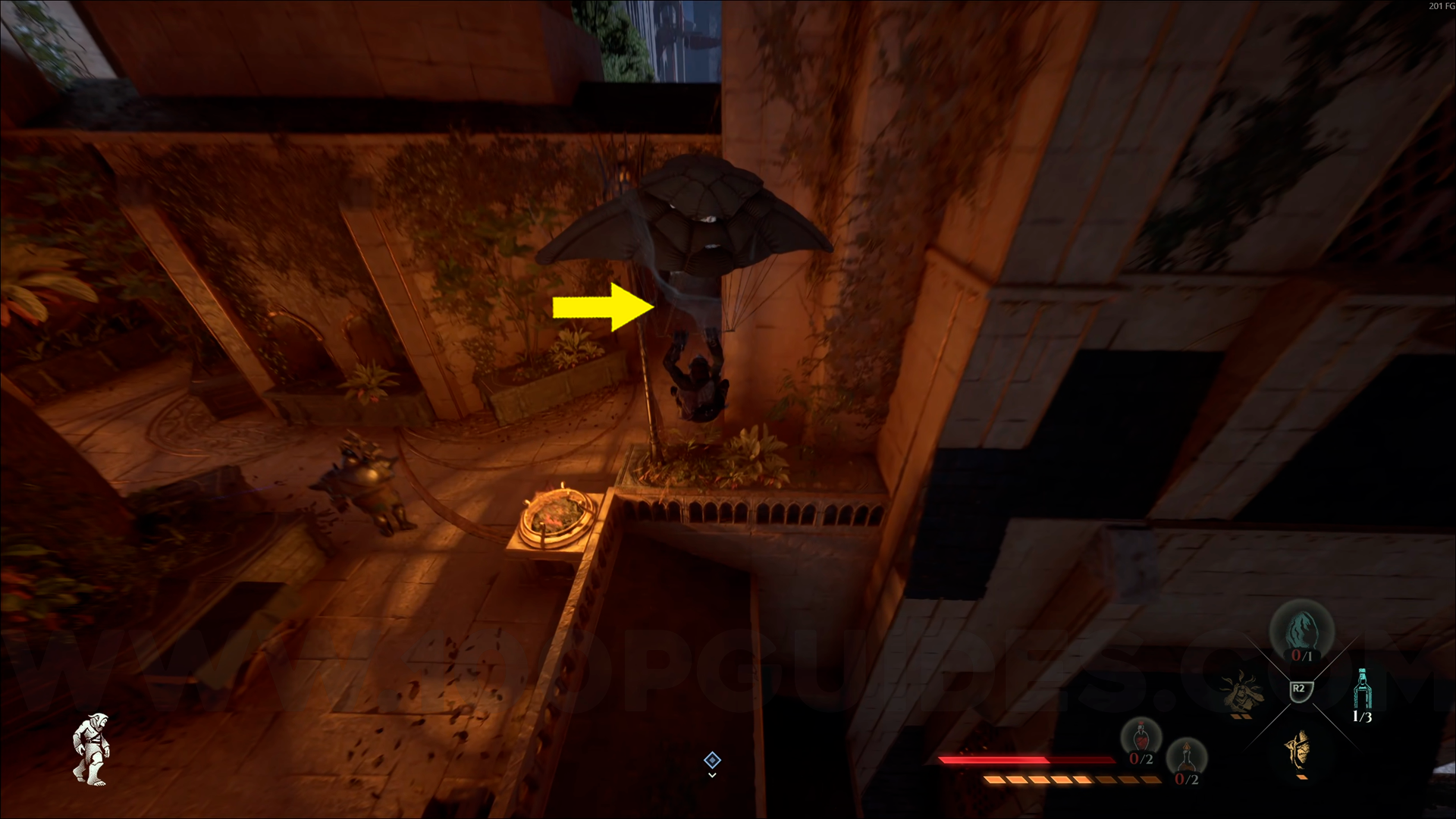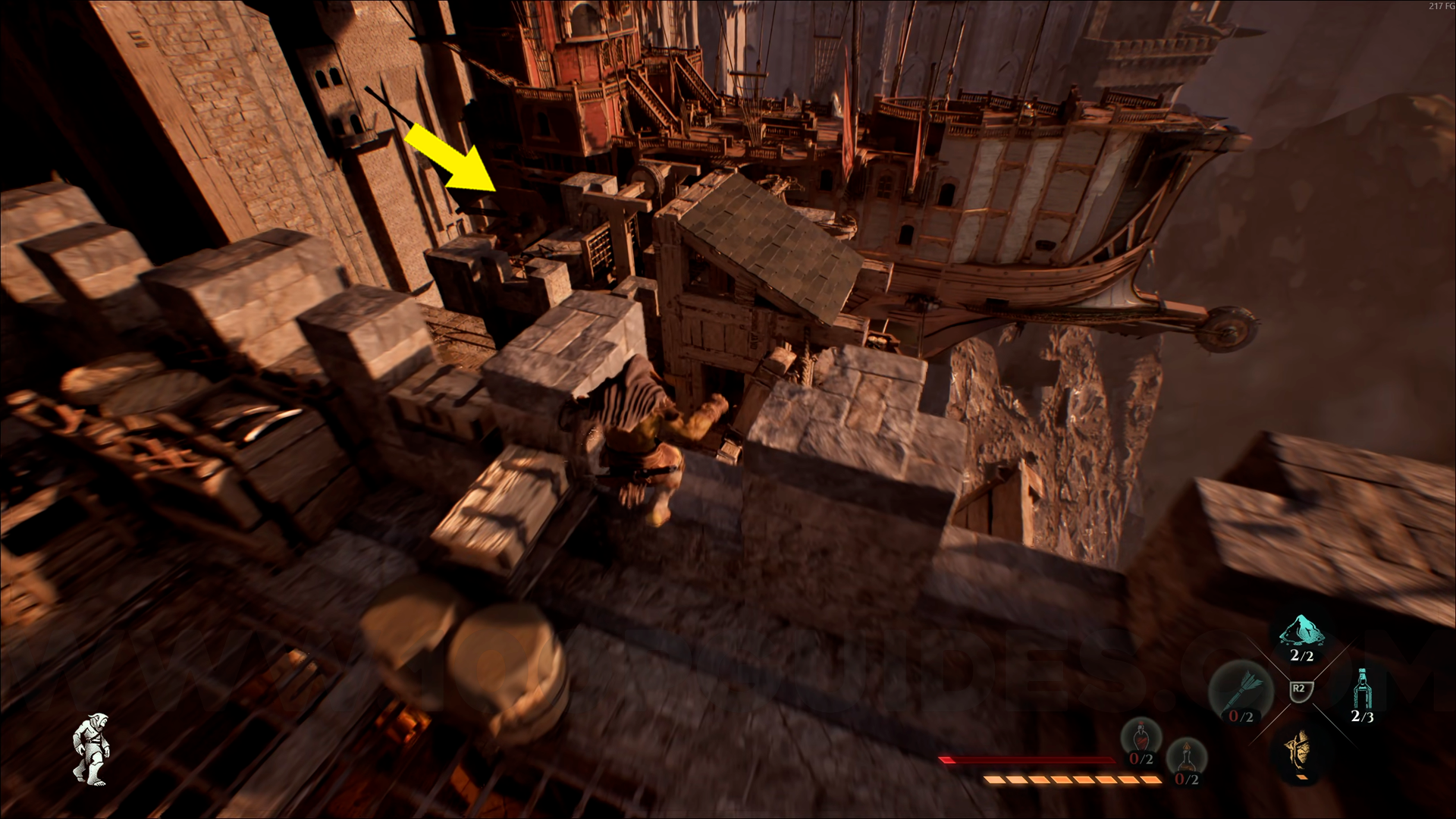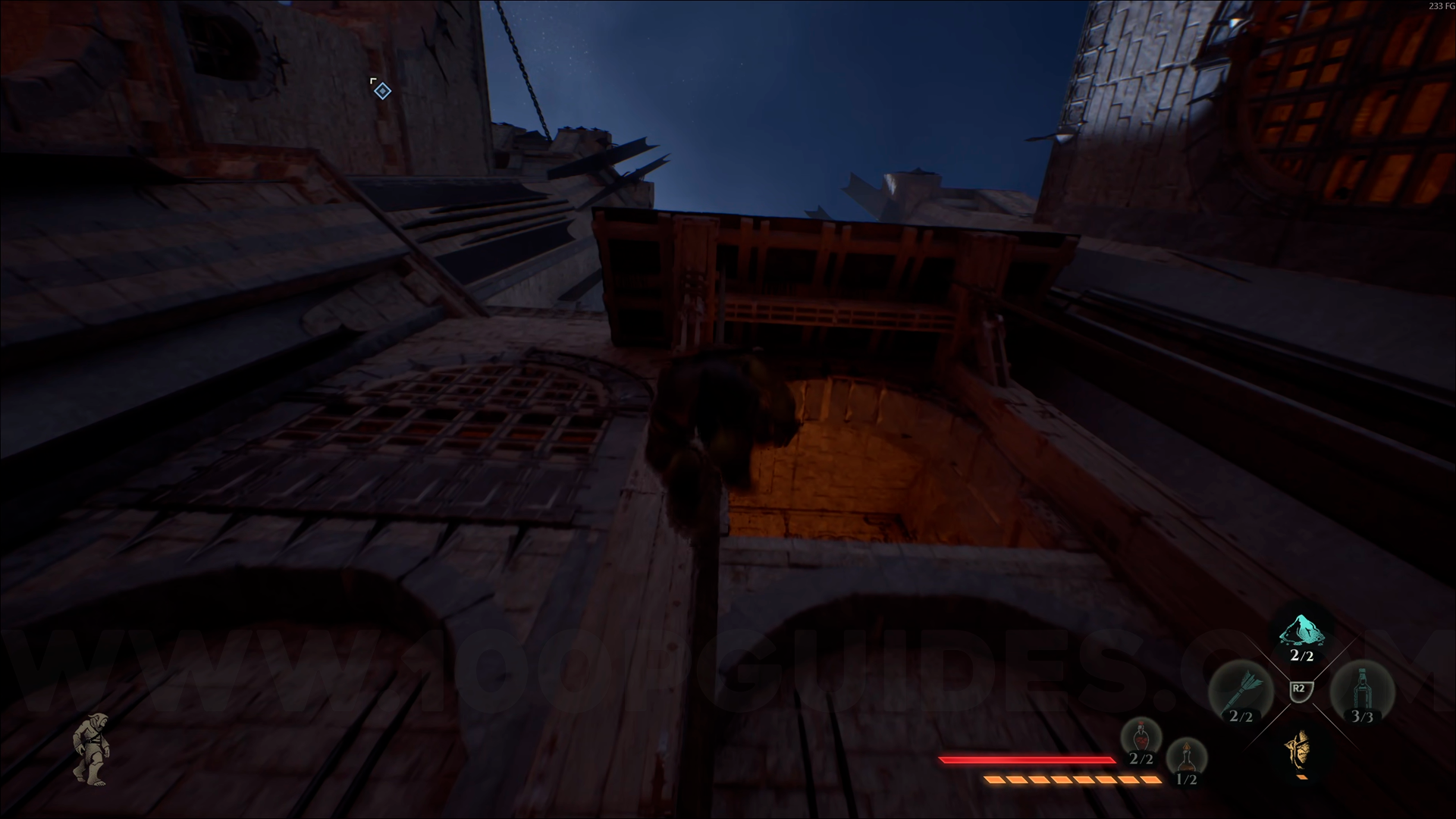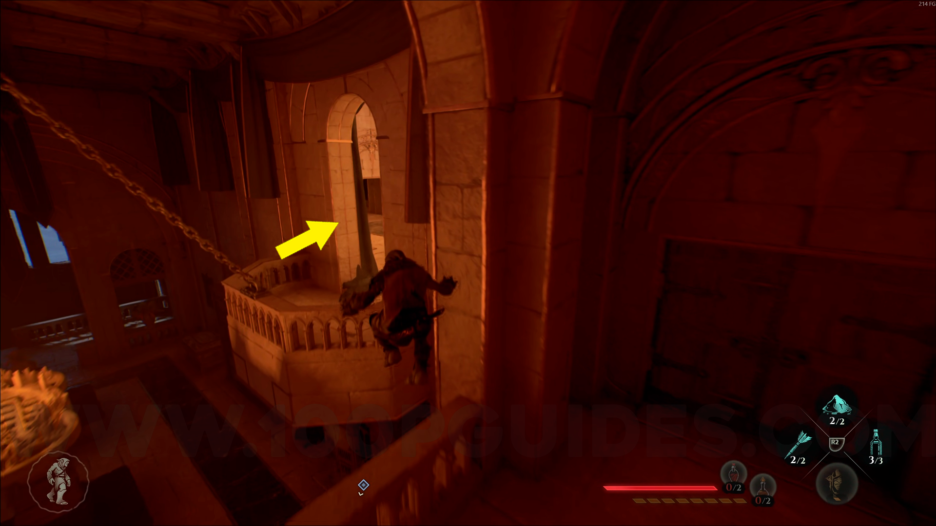Gold Emblem #2. Right after the previous collectible, go back out through the door you entered and head to the building on your right. This emblem will be on the balcony of that building. Use Amber Vision to help you spot it.