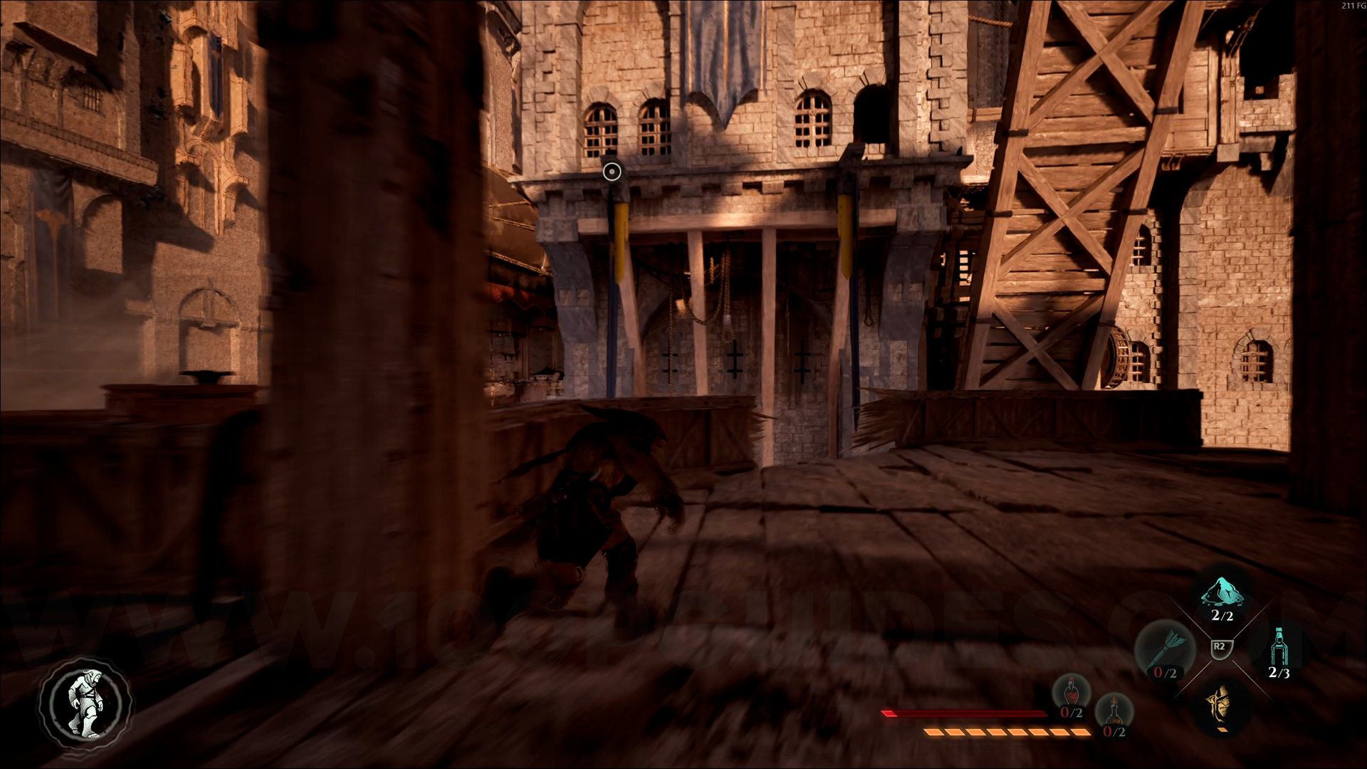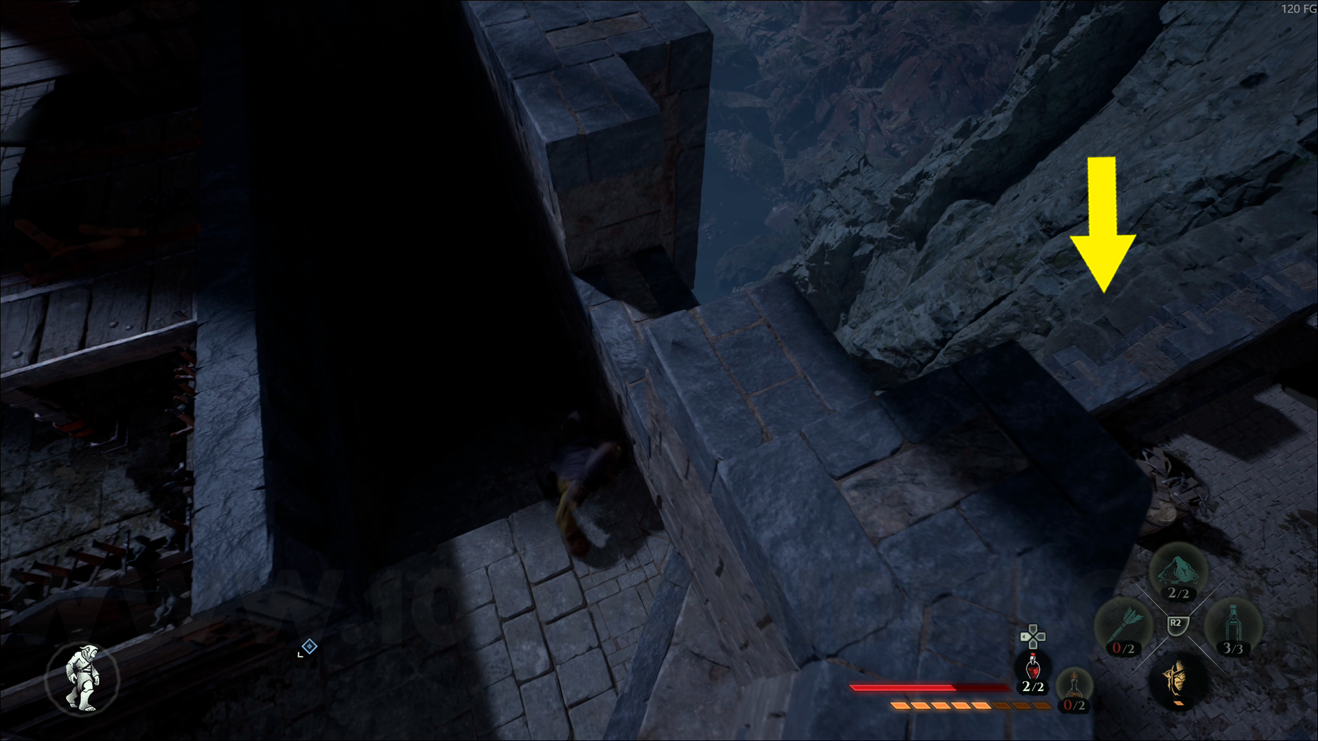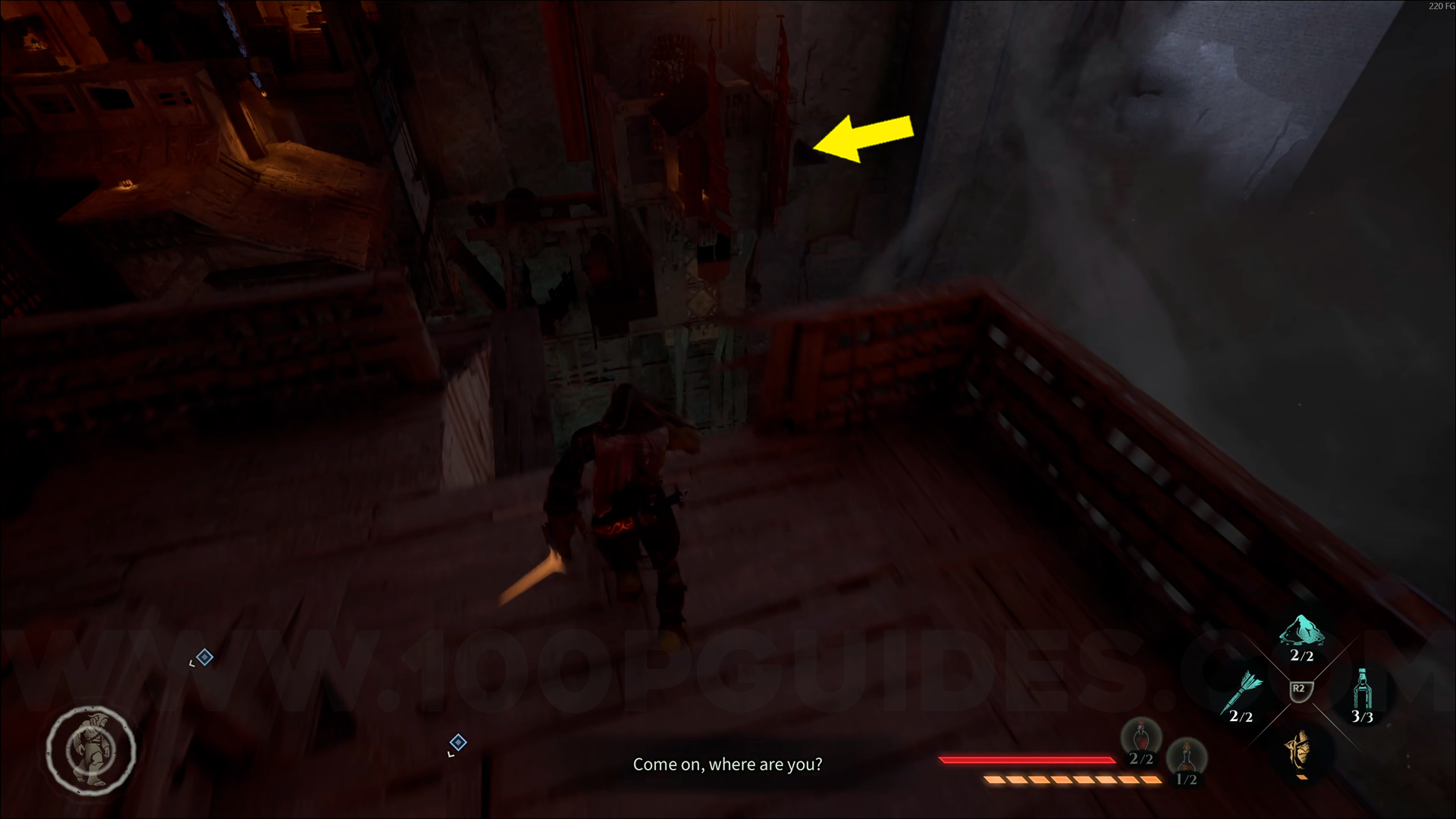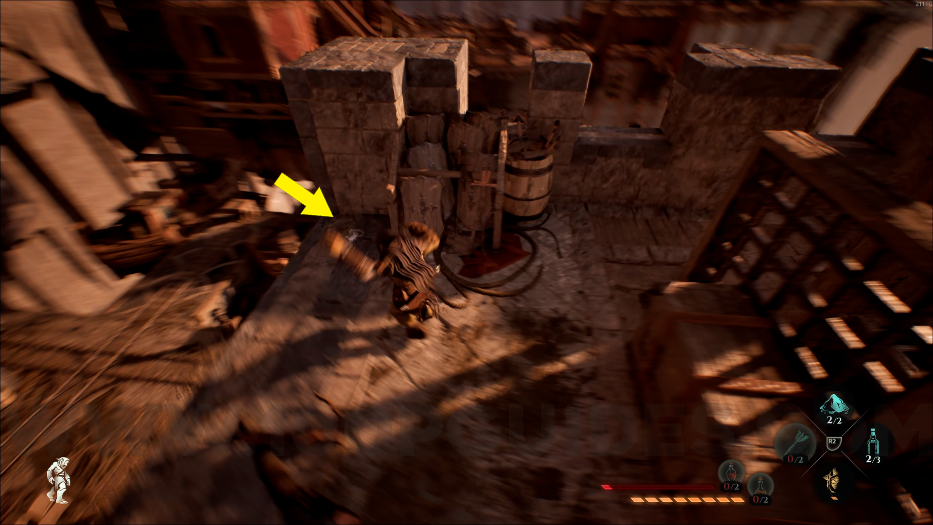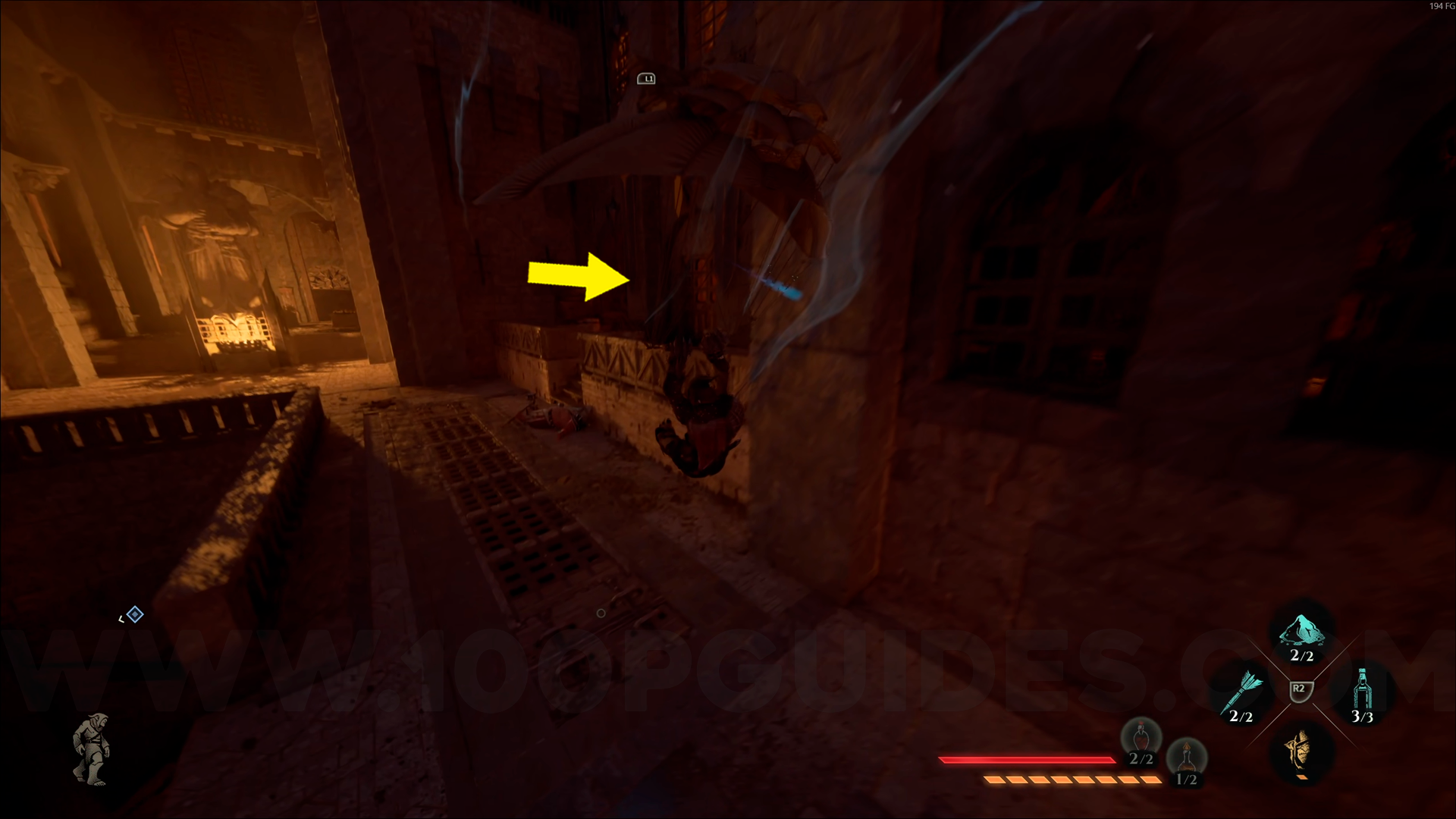 Gold Emblem #2. Right after the previous collectible, go back out through the door you entered and head to the building on your right. This emblem will be on the balcony of that building. Use Amber Vision to help you spot it.