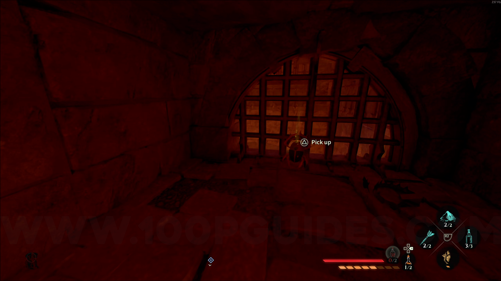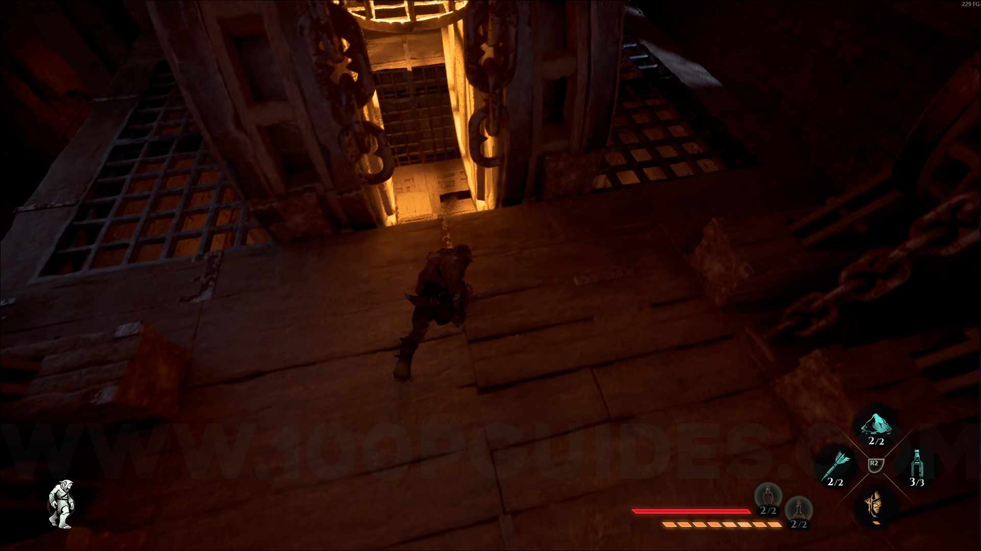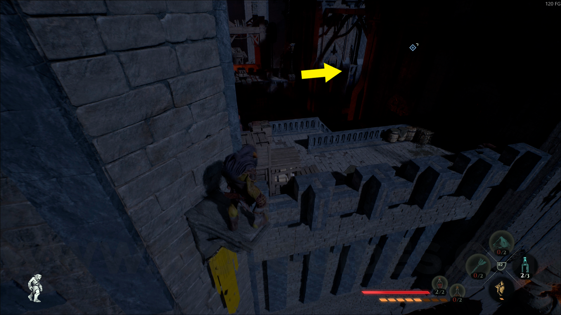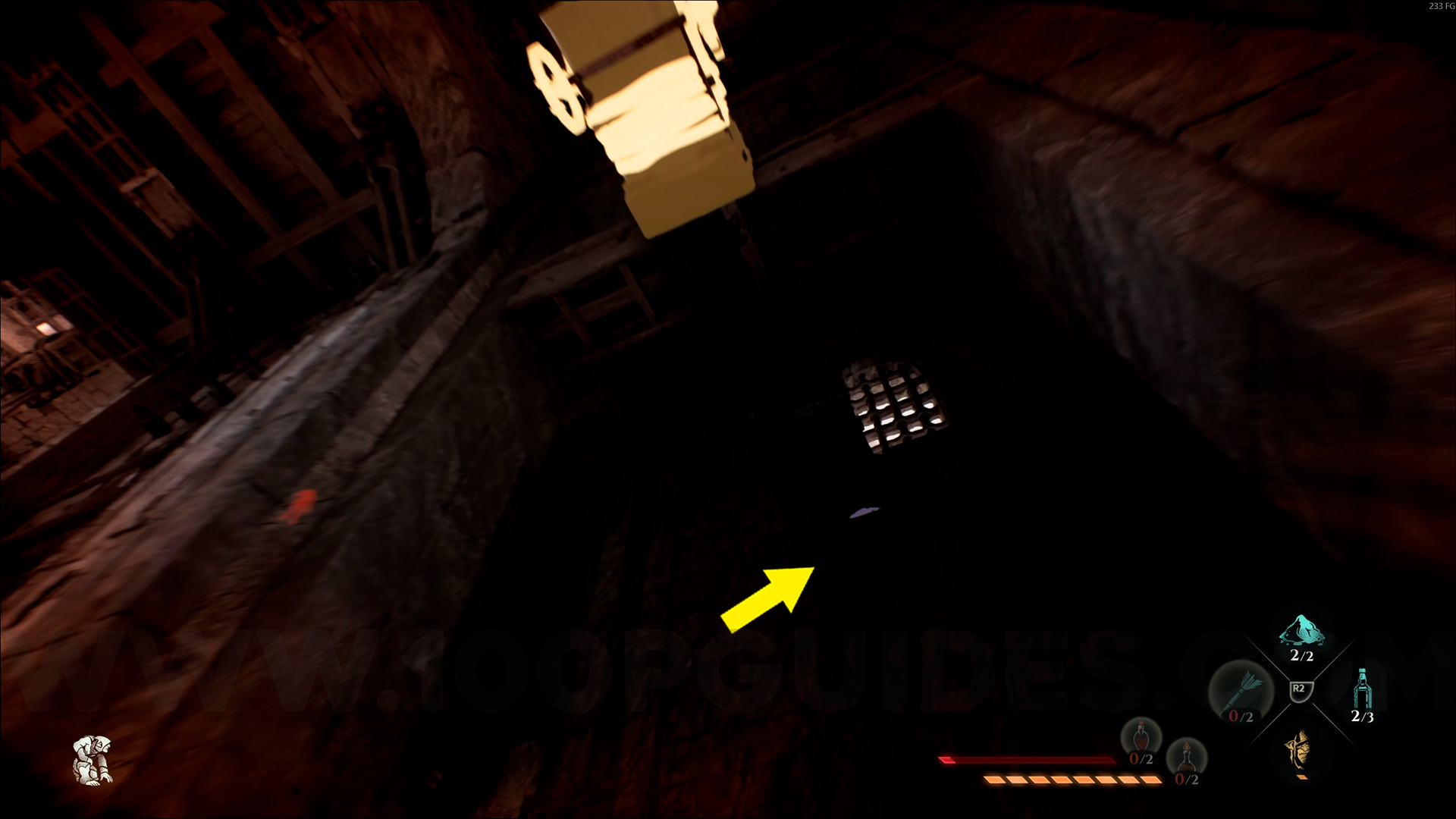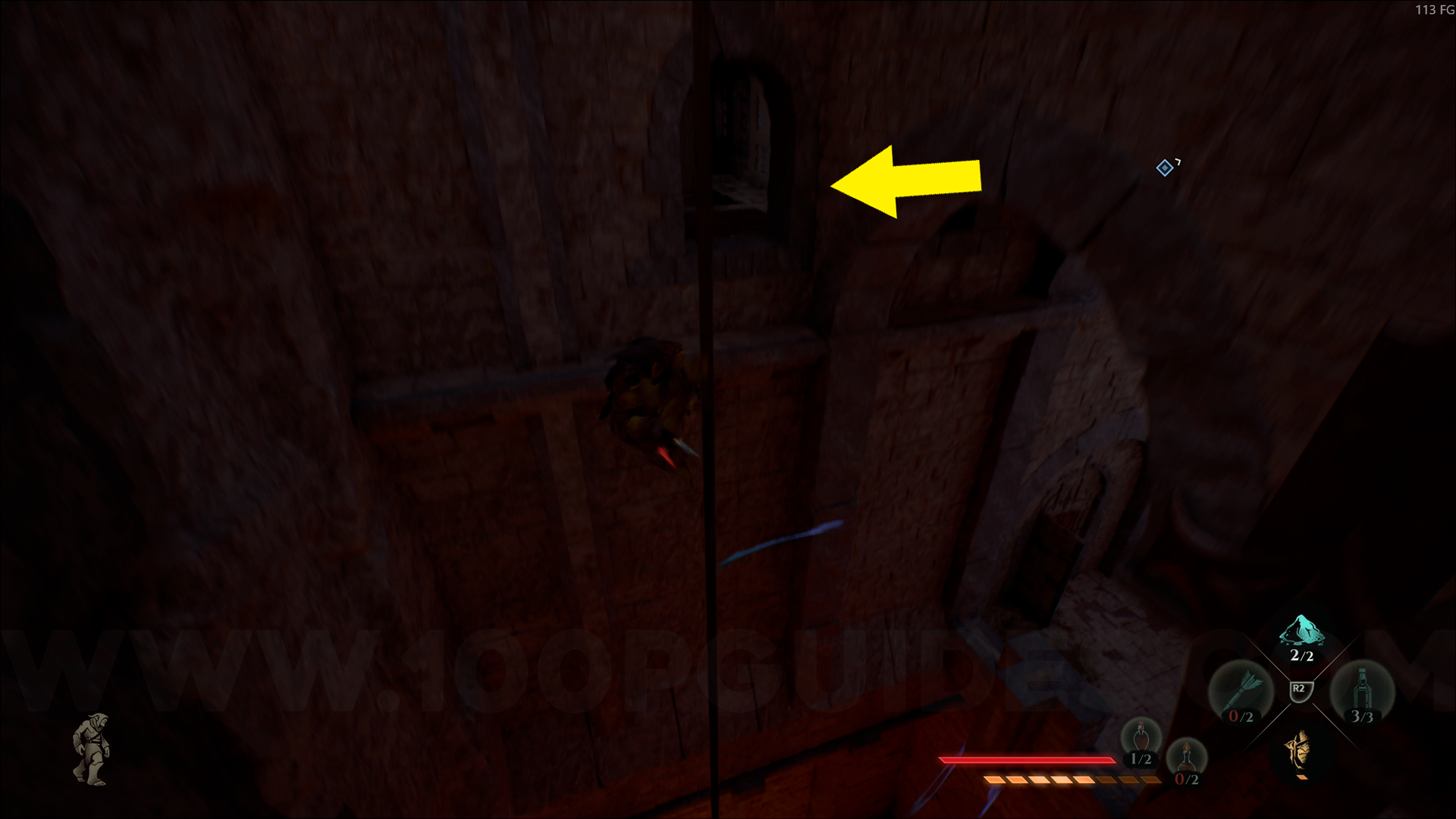 Bronze Emblem #2. From the Empire's Dungeons checkpoint, go down to the right and head to the end of the area. Then turn left, climb up the rope, and go through the window in front of you. Look down and you'll see the emblem. Use Amber Vision to help you spot it.