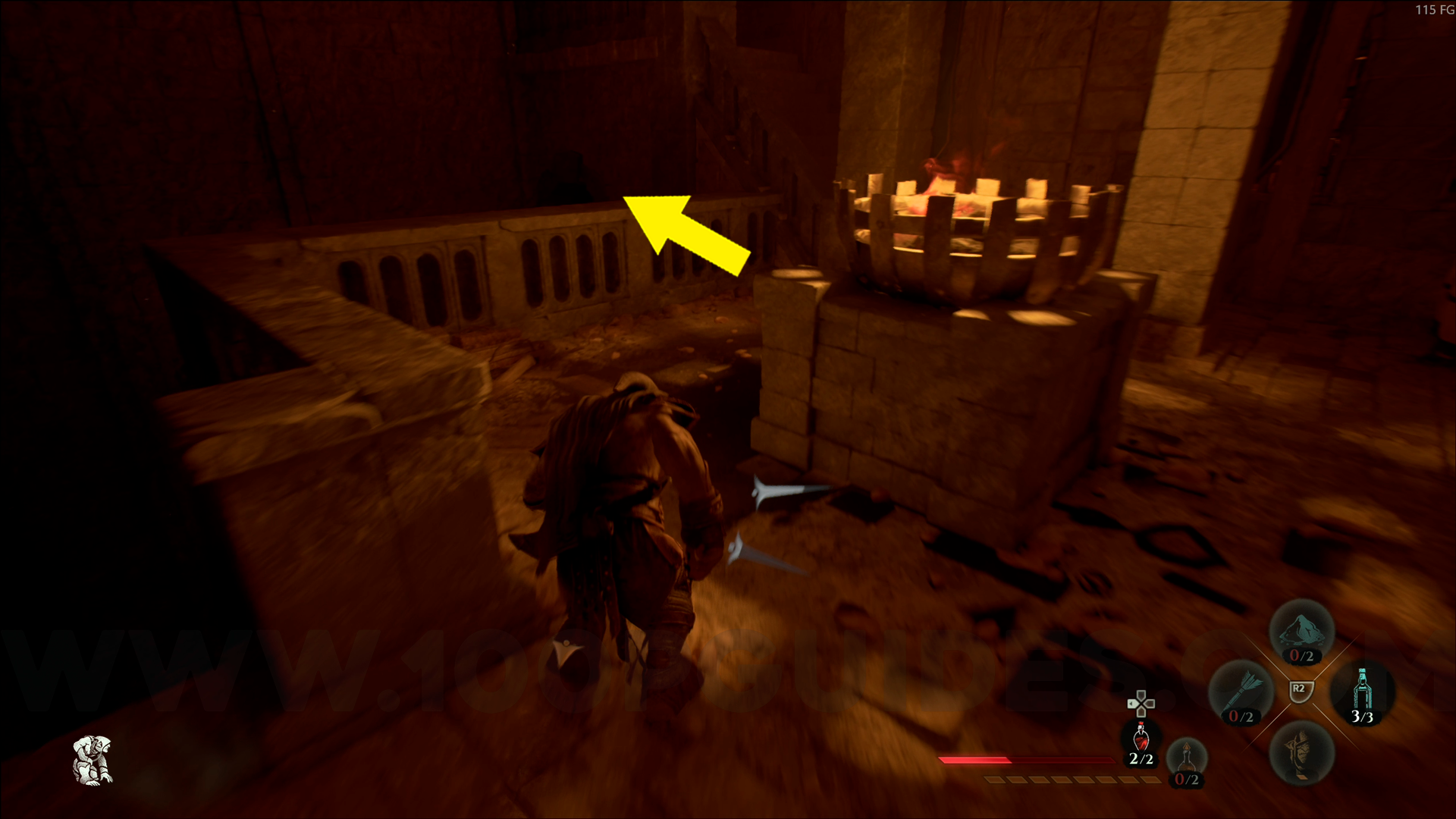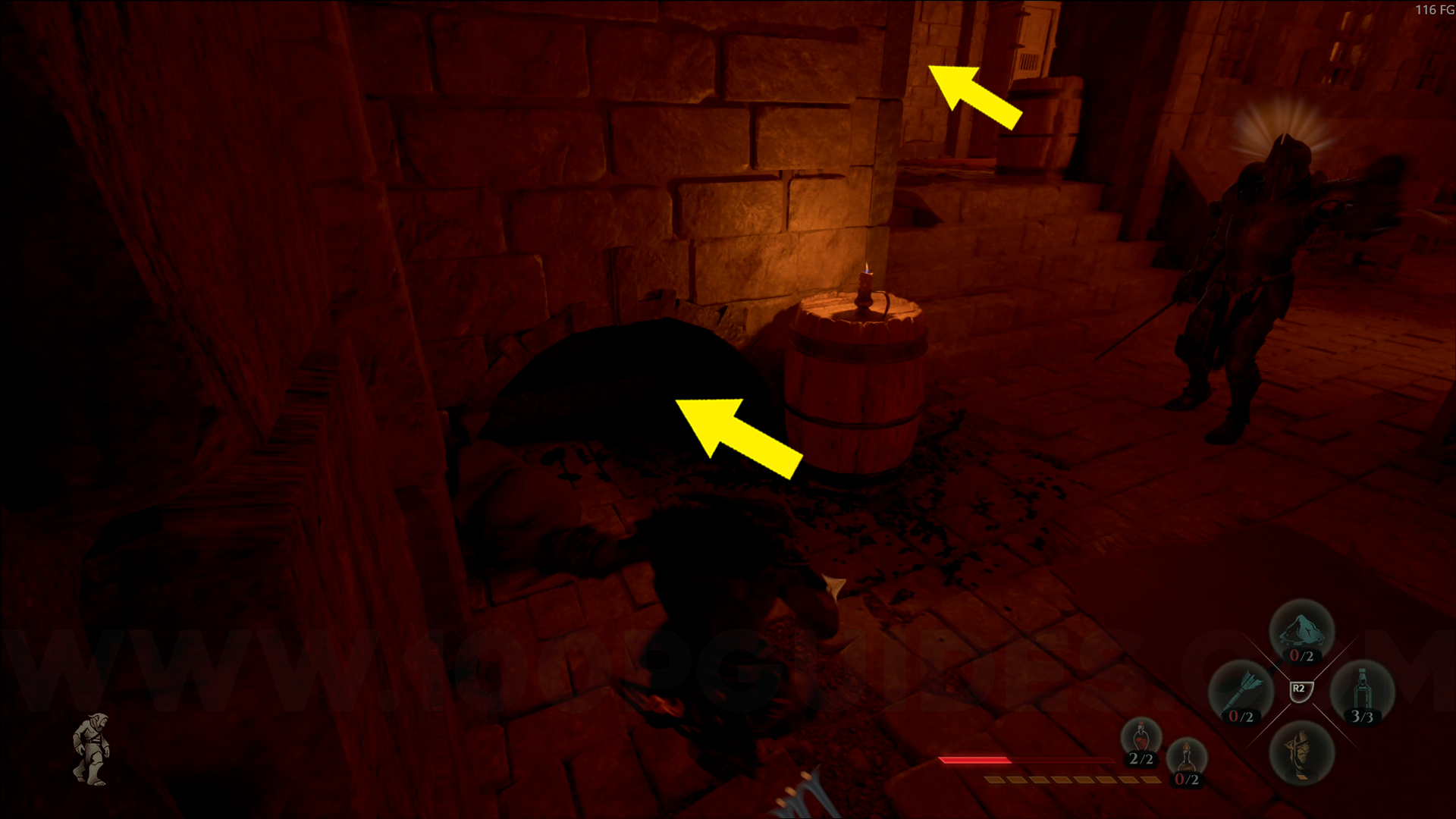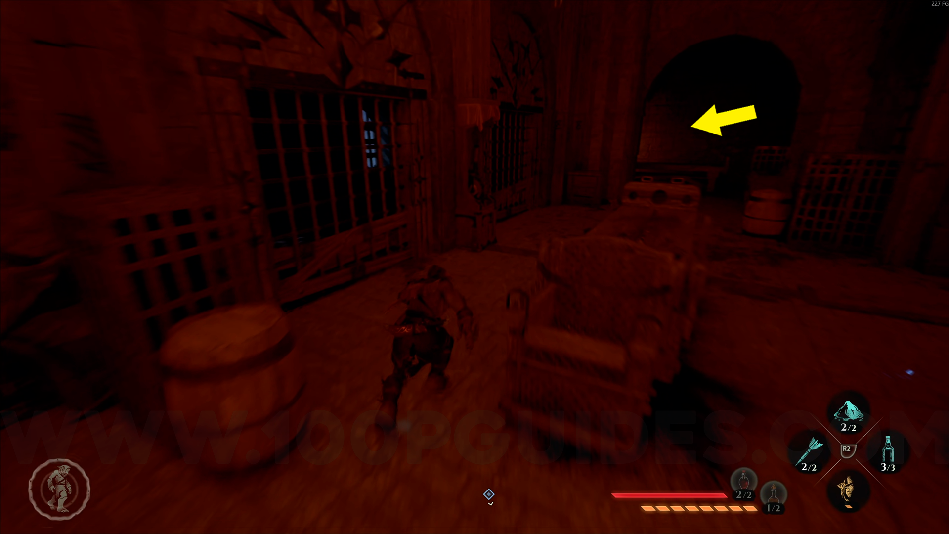 Bronze Emblem #4. From the Empire's Dungeons checkpoint, go down the right side of the checkpoint and continue forward. Take the first right where there are a few enemies. Use Amber Vision, and you’ll see this emblem on the right side of the area, on top of a barrel.