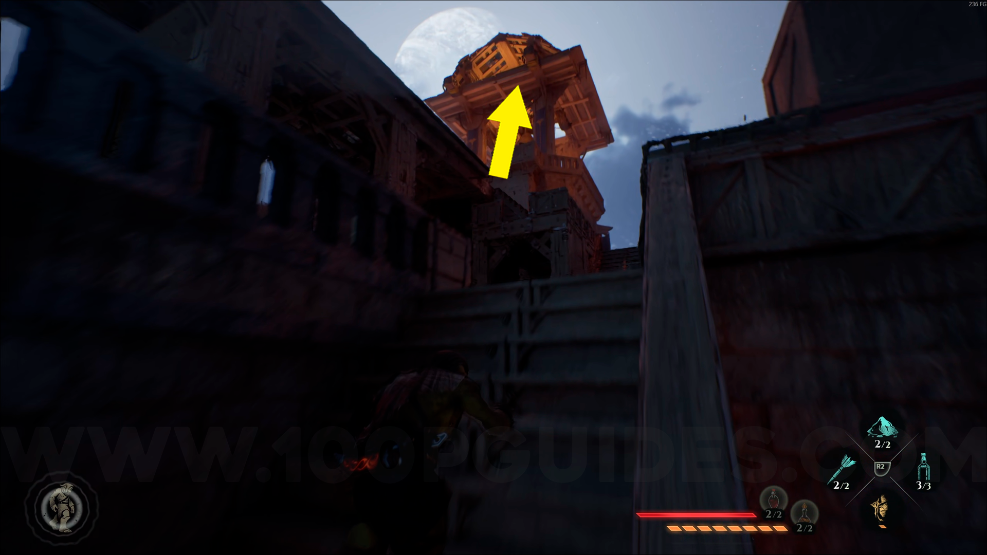 Wood Emblem #9. From the previous collectible, go up the stairs again, turn right, and pass through the gate using your ability. Continue to the end, crossing the bridge, to find this emblem.