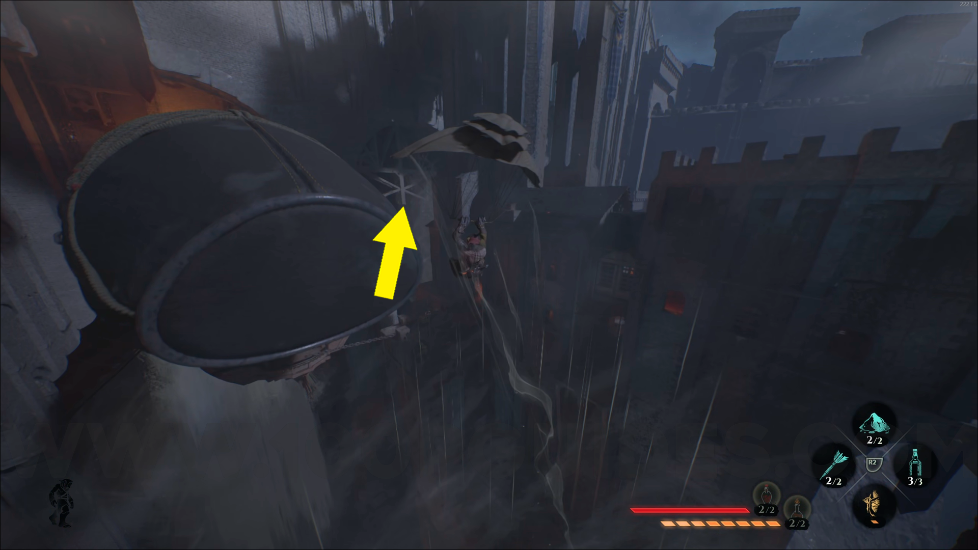 Silver Emblem #2. From the Zeppelins' Docks checkpoint, climb the wall beside you and head to the end of the area. Enter through the large door, and this emblem will be on the first pillar on the right side. Use Amber Vision to help you spot it.