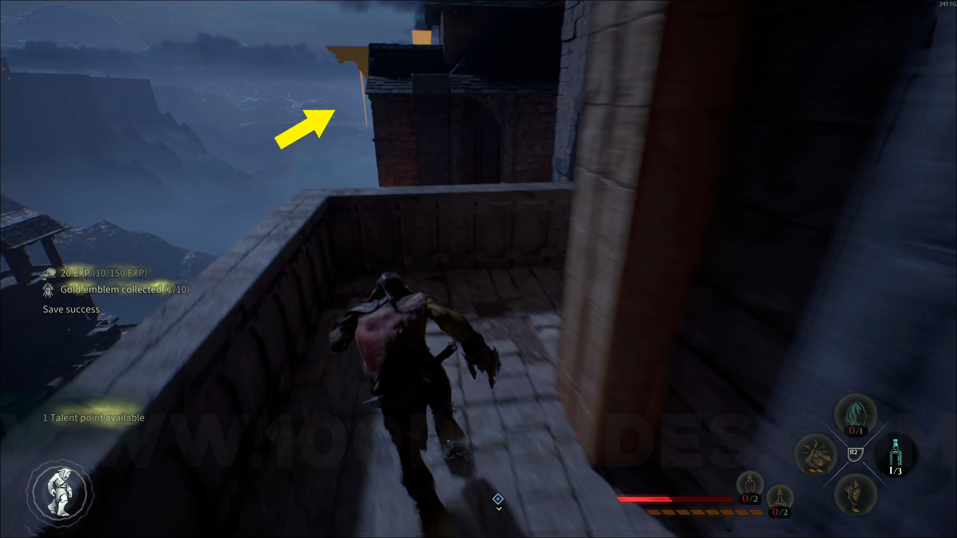 Gold Emblem #6. Inquisition’s Cathedral, go through the gate in front of you using your ability to reach an open area. Head to the far end and climb the rope on the left. At the top, enter the door on your right, go through the window, and continue onto the rooftop to find the emblem. Use Amber Vision to help spot it.