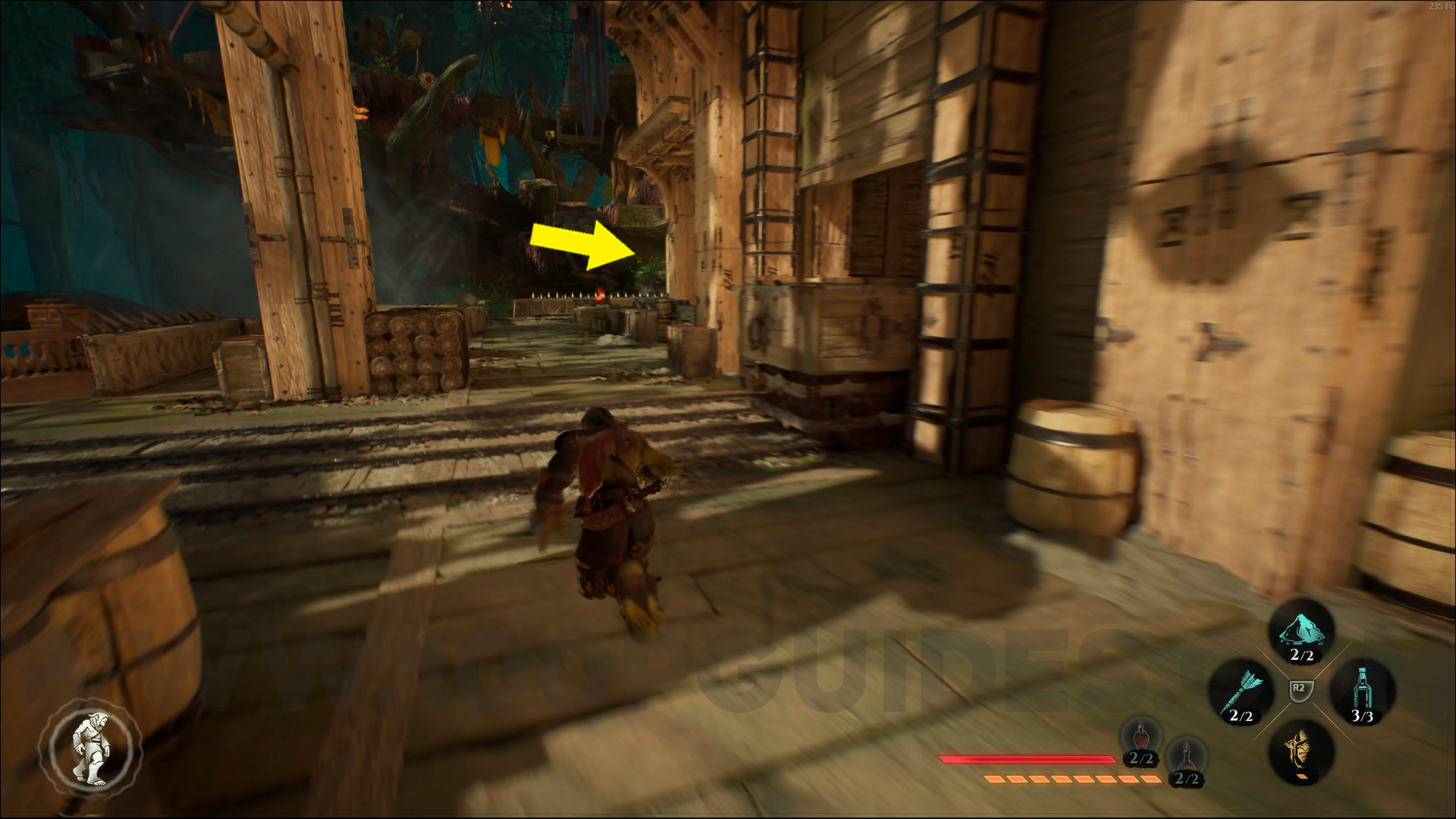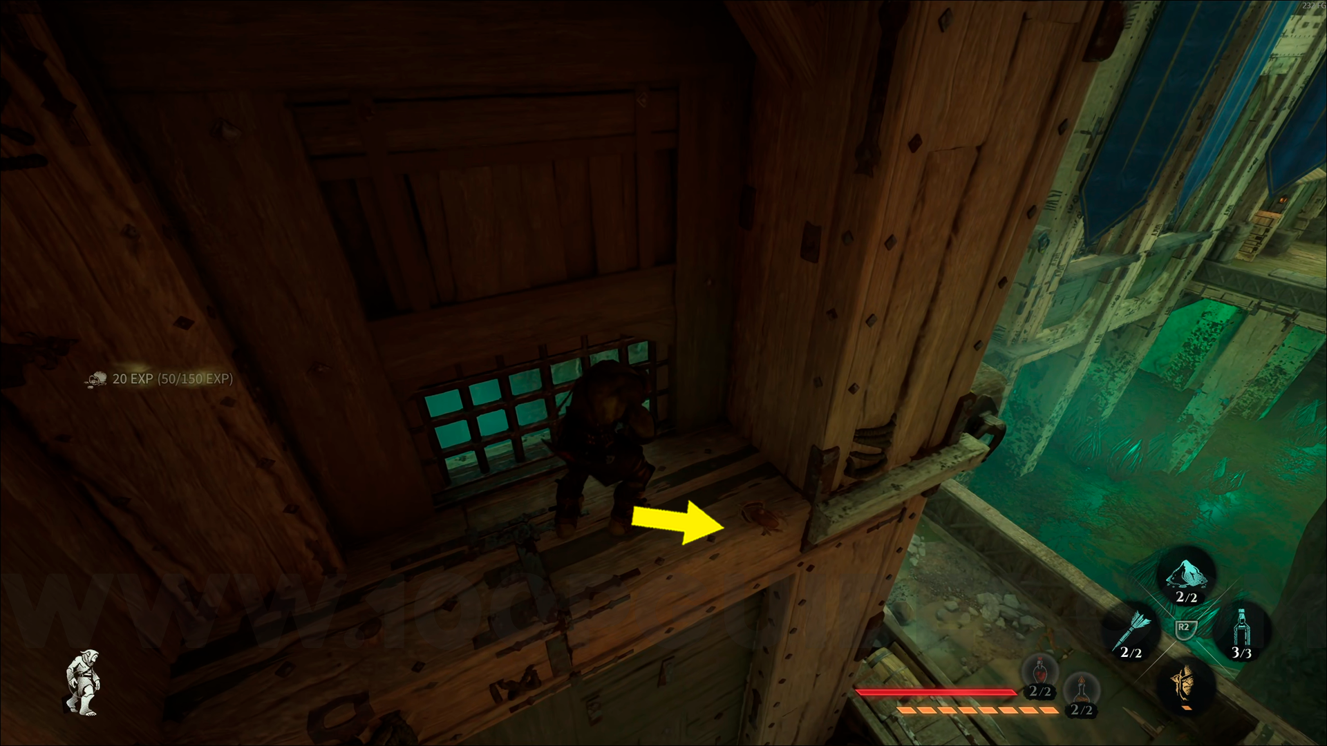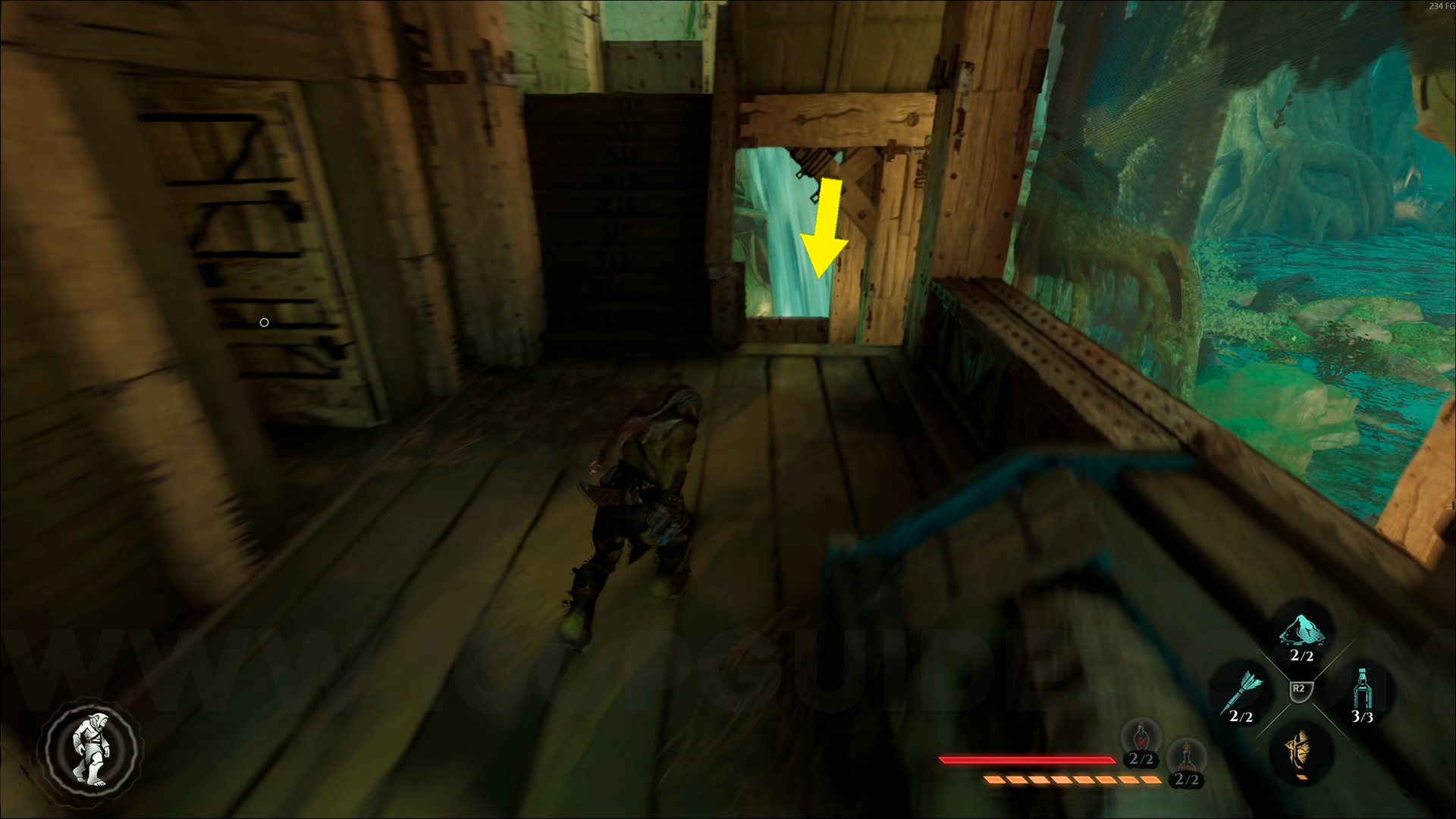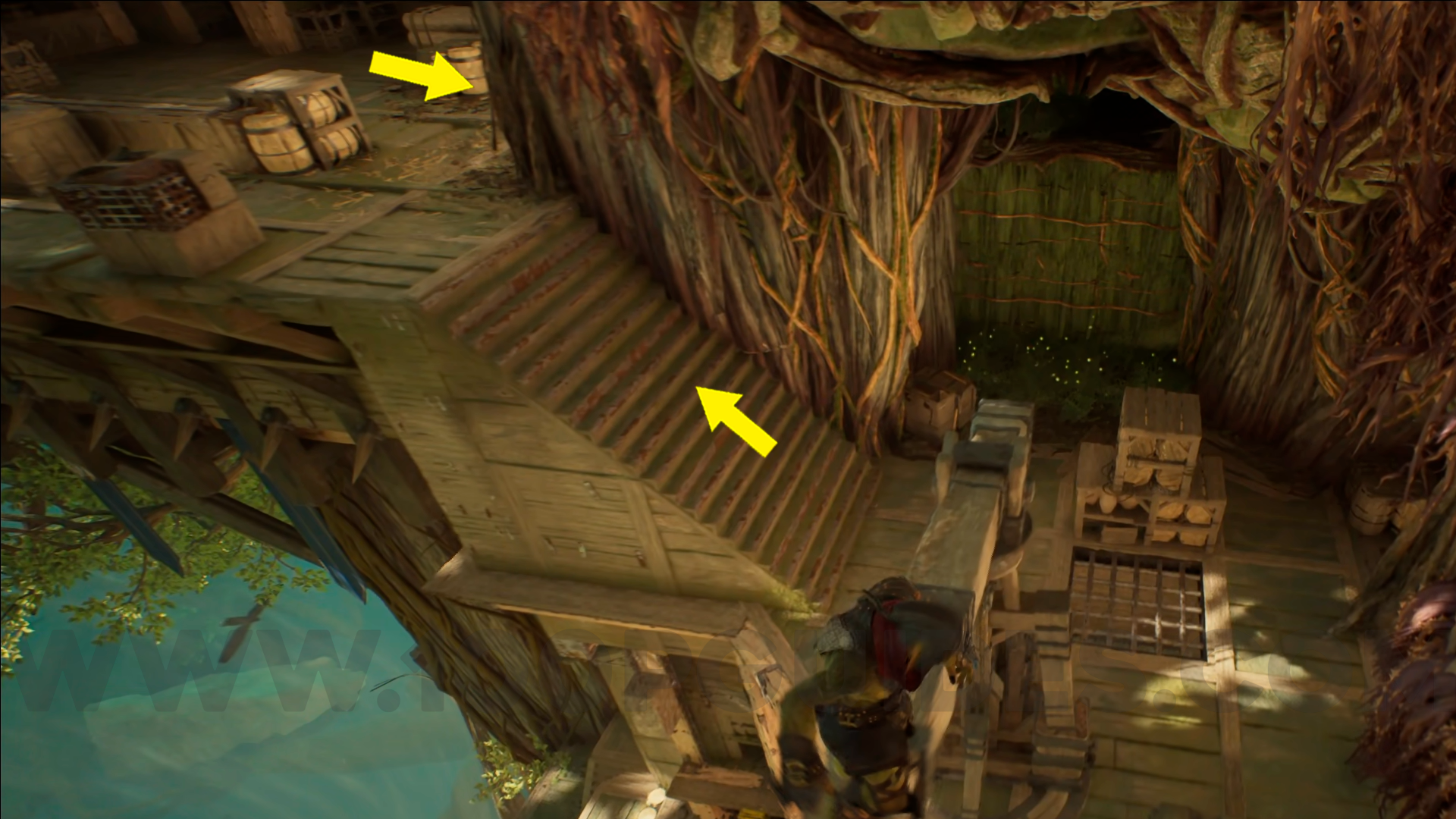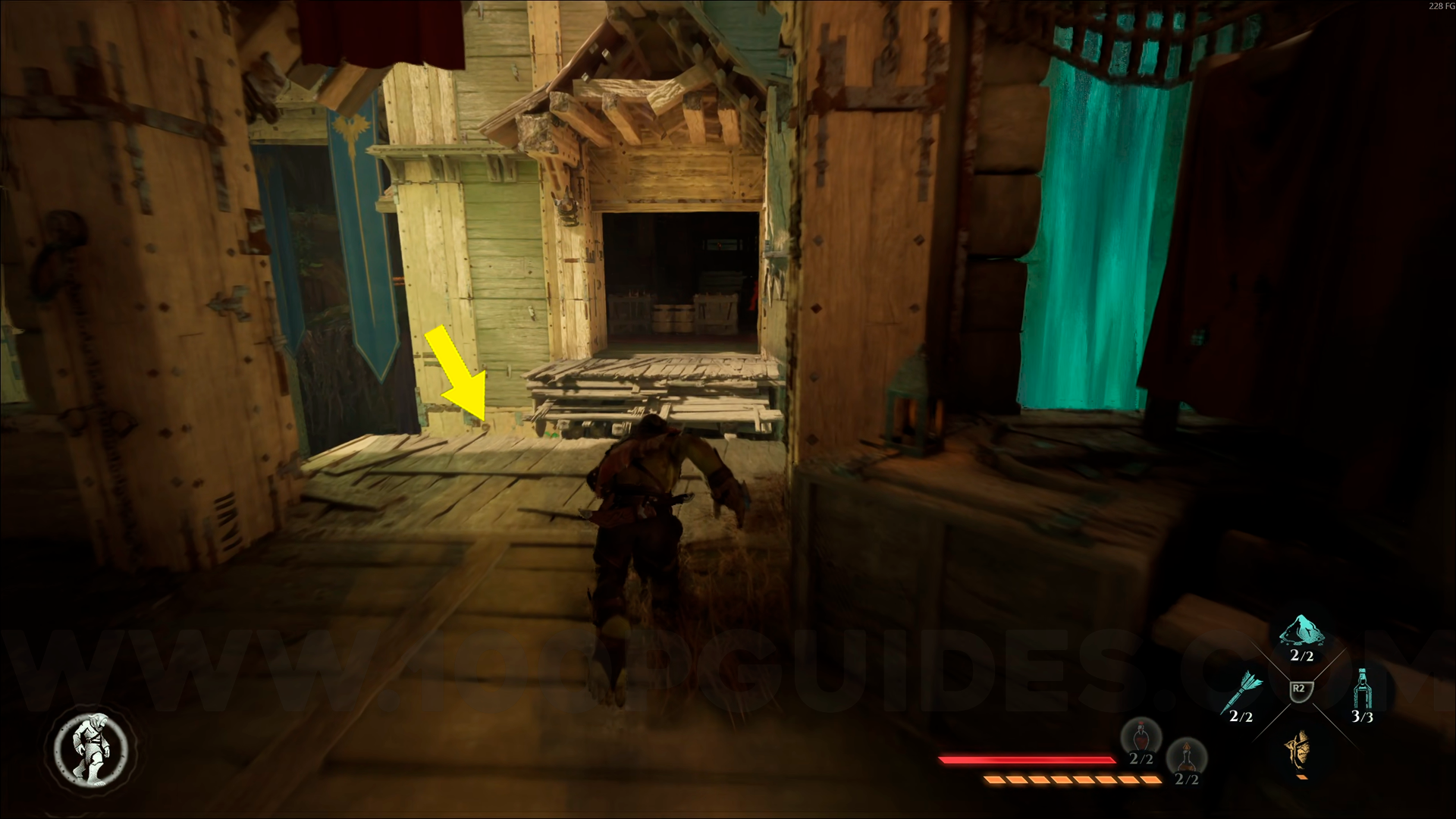Wood Emblem #4. From the Helledryn's Hideout checkpoint, head right and climb onto the house in front of you. Then turn left, pass by the boat, and go up the stairs on the left. Enter the first door in front of you, then go through the next one. You'll see a hole with a rope. Jump into the hole, and once you're down below, go through the door ahead.