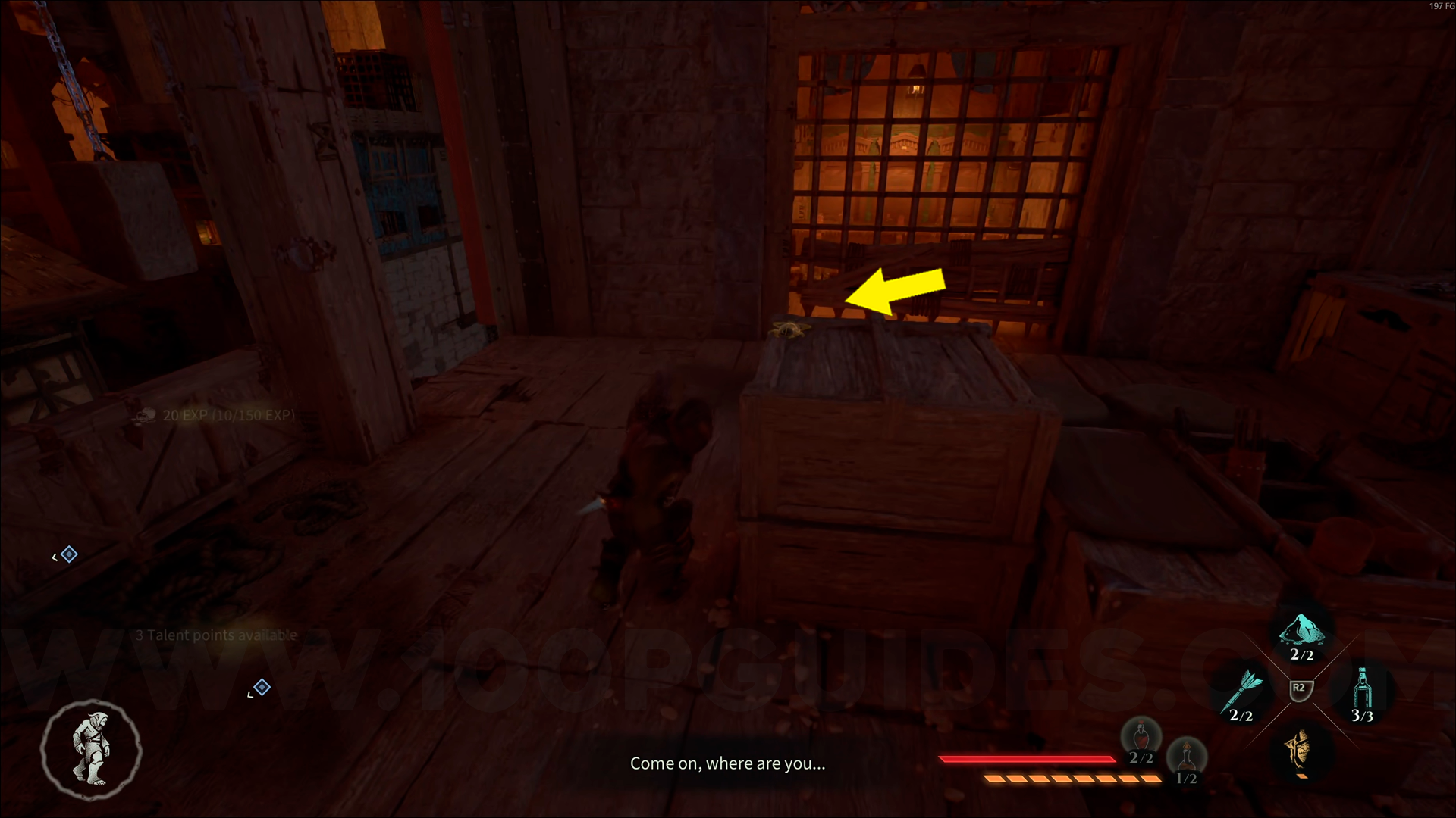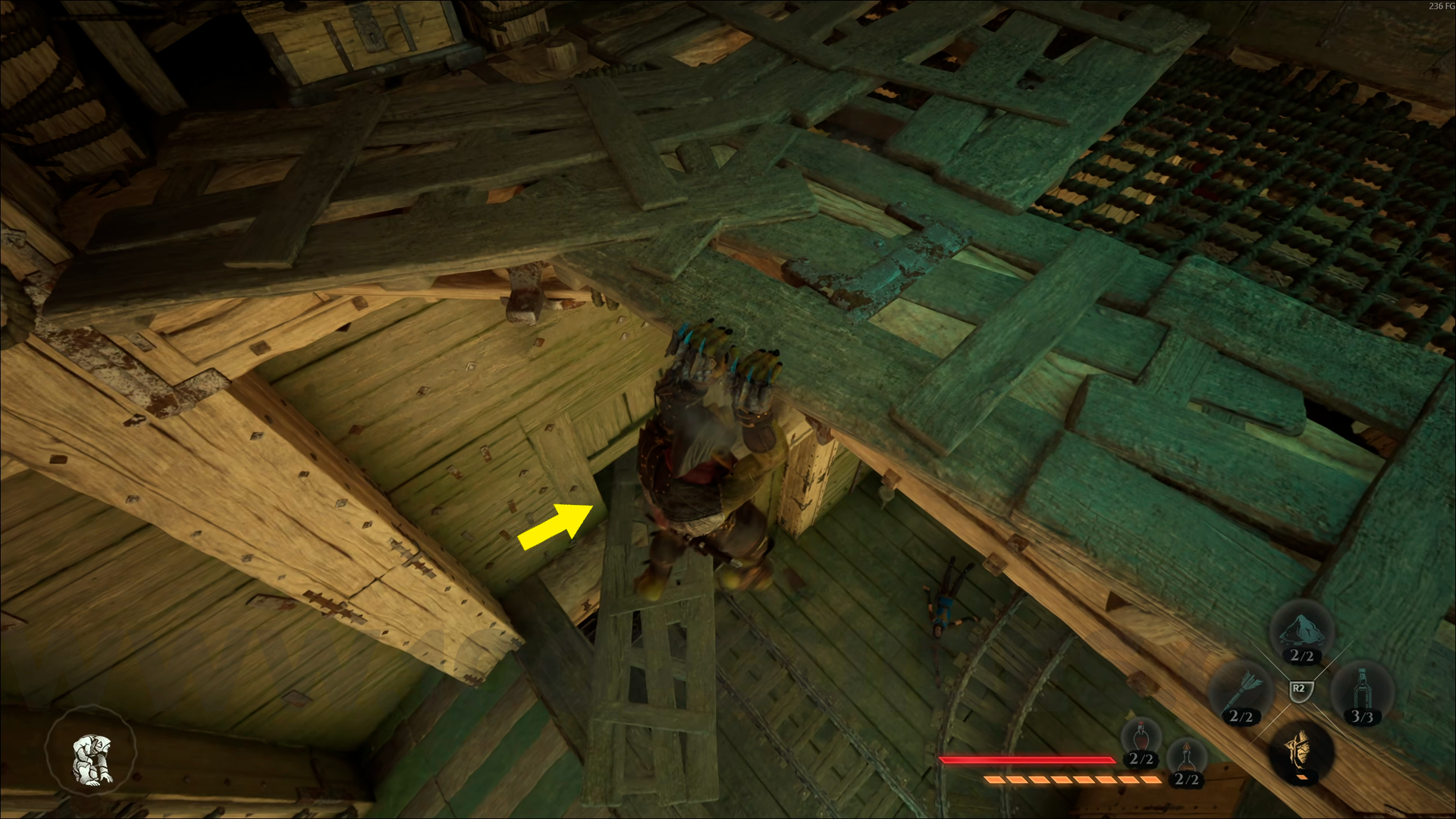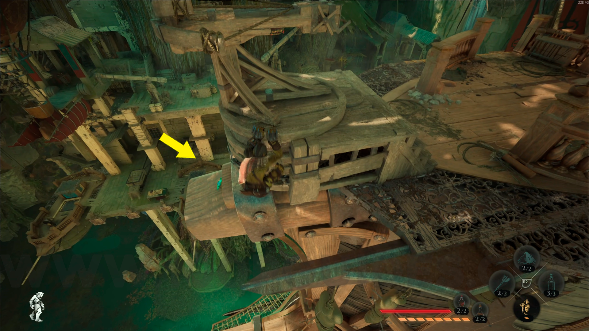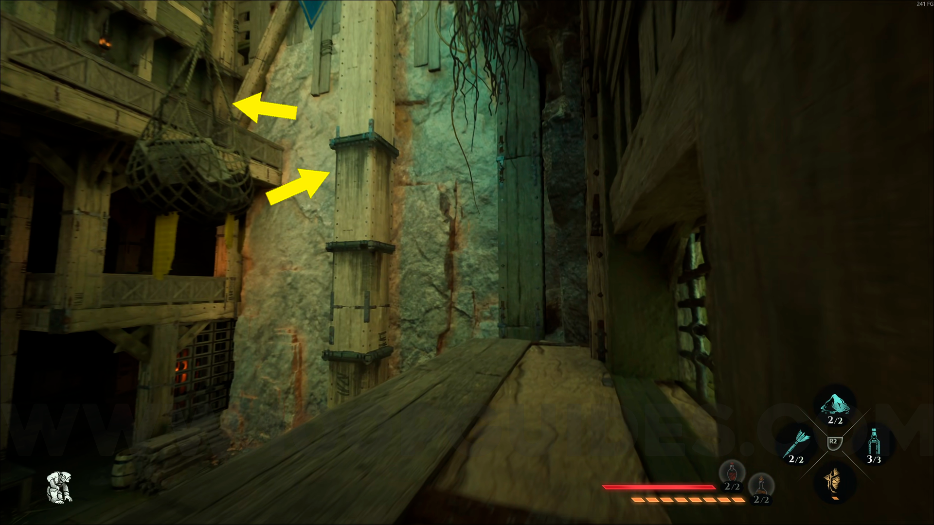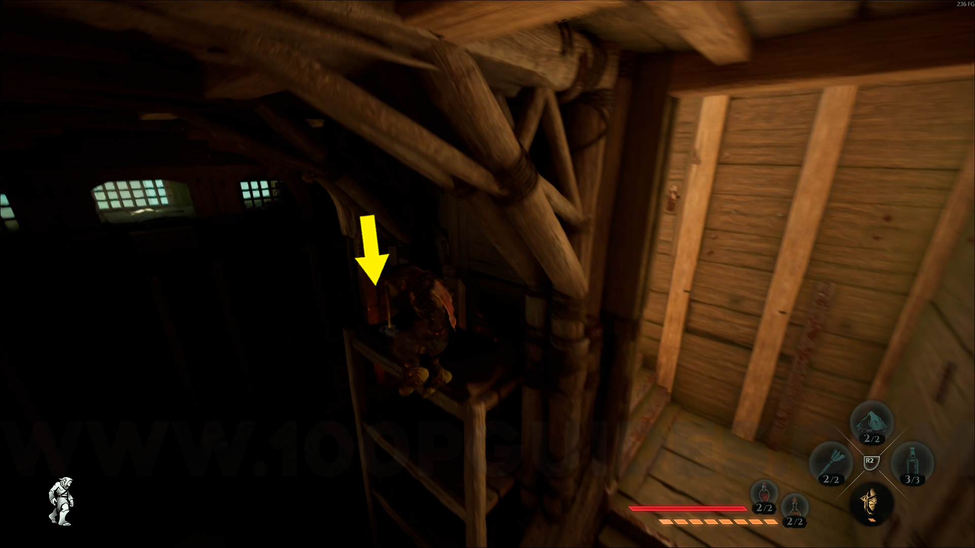 Wood Emblem #4. From the Helledryn's Hideout checkpoint, head right and climb onto the house in front of you. Then turn left, pass by the boat, and go up the stairs on the left. Enter the first door in front of you, then go through the next one. You'll see a hole with a rope. Jump into the hole, and once you're down below, go through the door ahead.