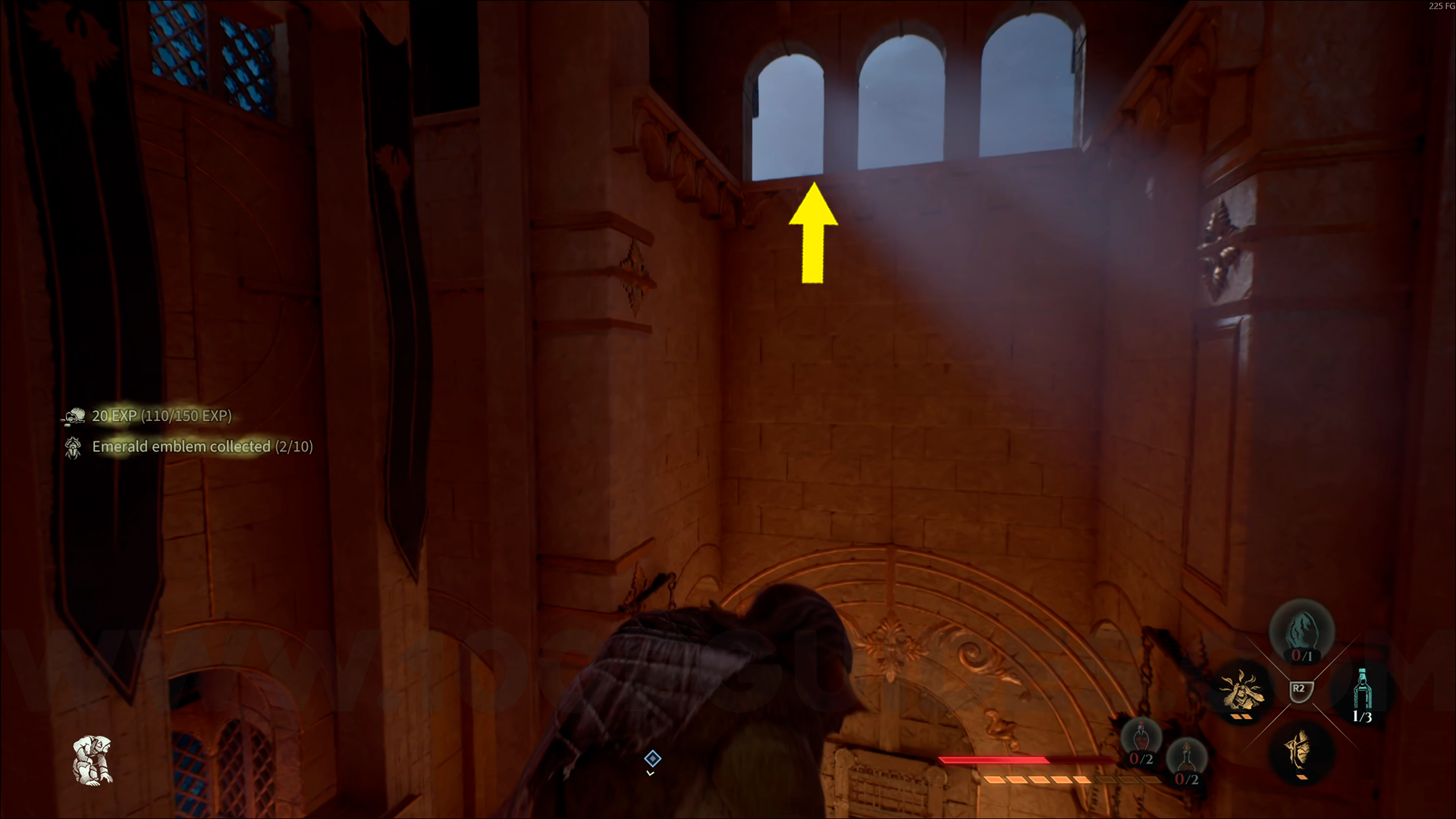Emerald Emblem #9. From Nobles' Quarters, climb up the crystals on the wall and go through the first window. Then go up the stairs and enter the first door on the left. Climb up the chimney, then go through the window next to you. Go through the first door on the left, then enter the room on your left to find this emblem inside.