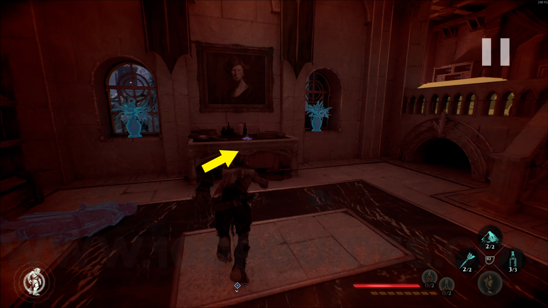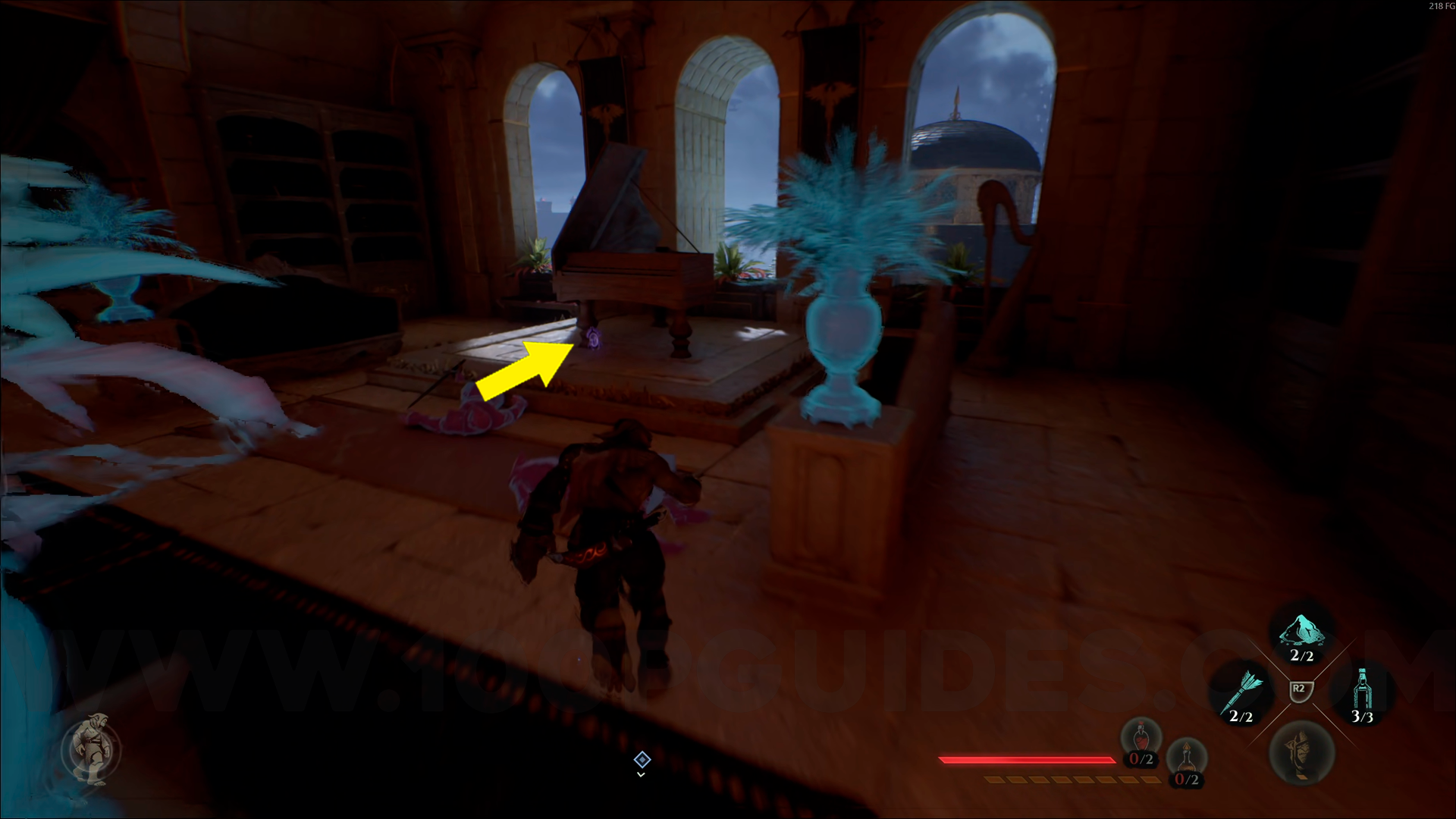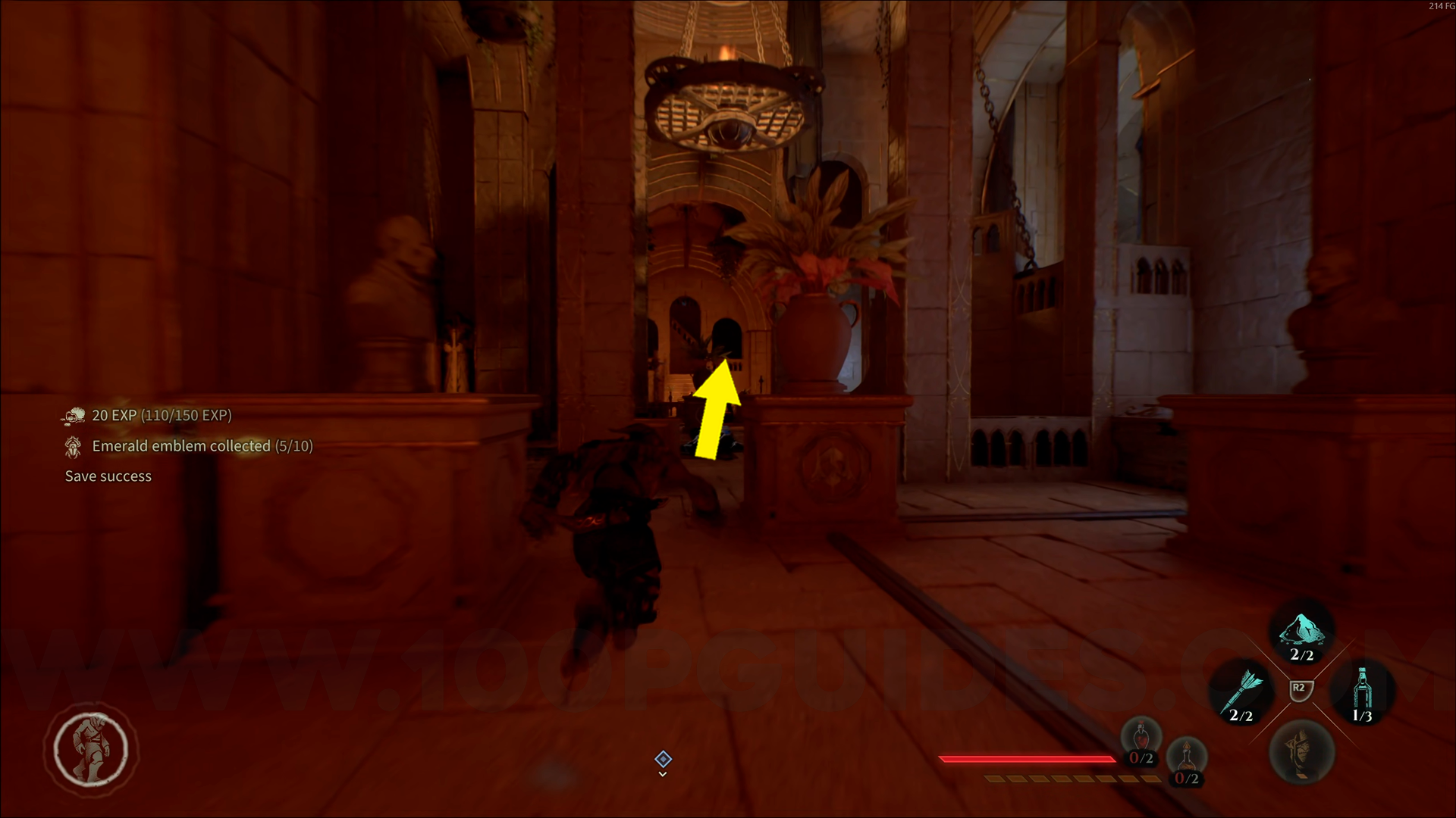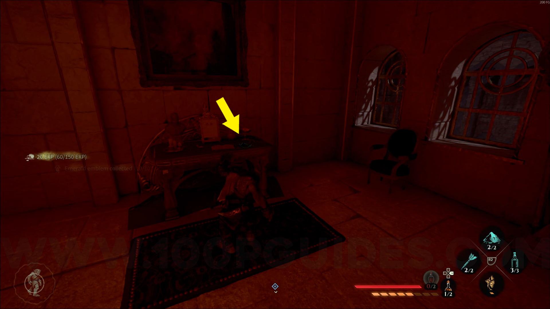Emerald Emblem #8. Right after the previous collectible, go through the window, climb up both sets of stairs, and then jump to the other side of the area. Go through the door to find the emblem next to a piano. Use Amber Vision to help you spot it.