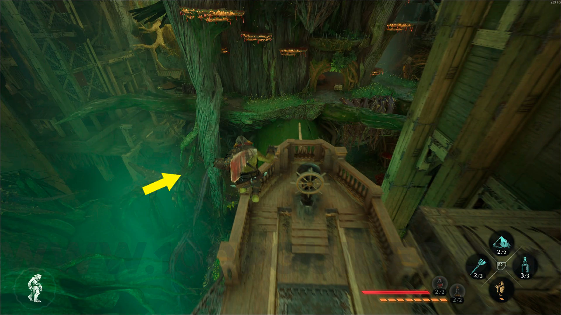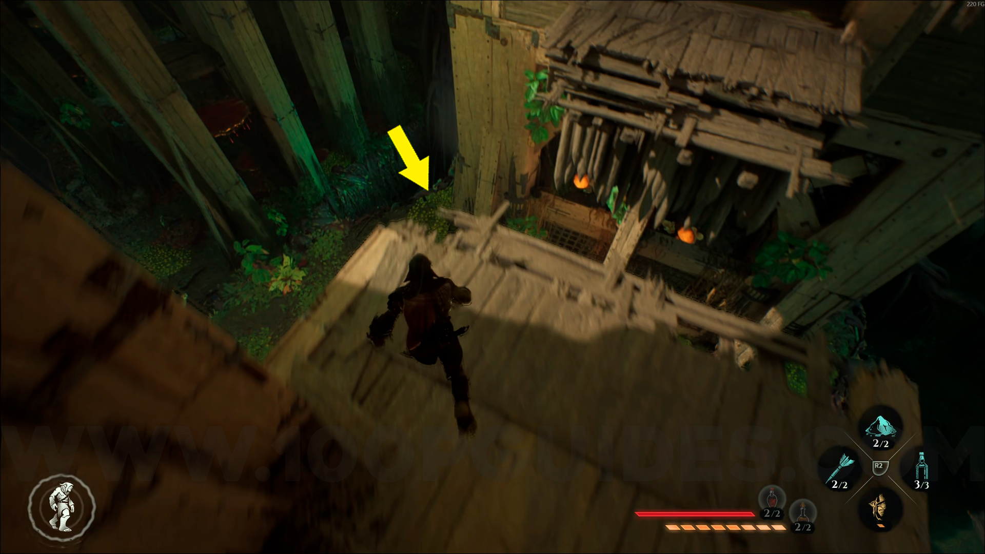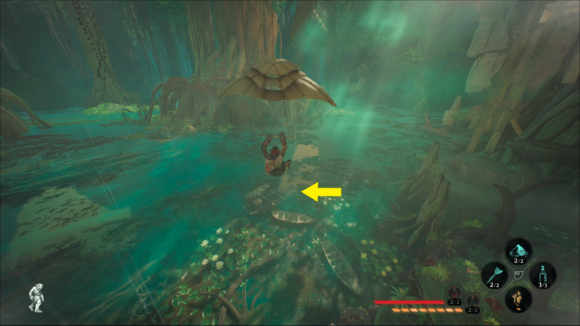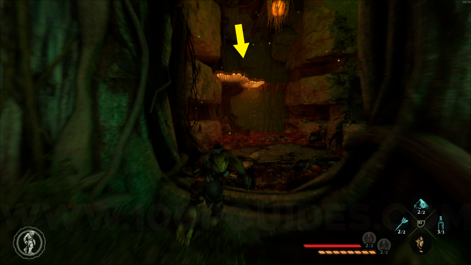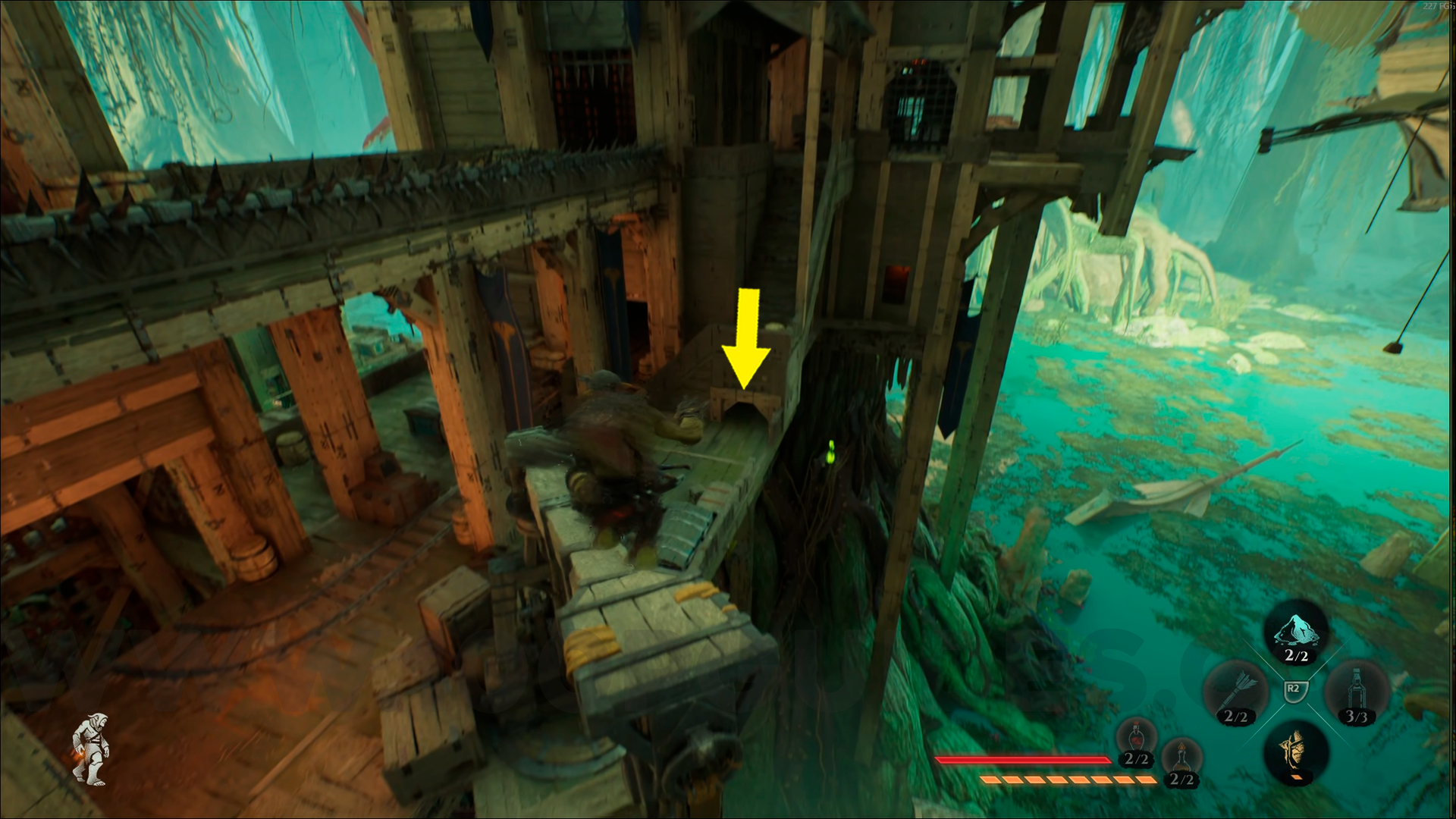 Wood Emblem #3. From the Infested Swamp checkpoint, turn right and jump onto the pillars ahead. Then go past the boat and climb down. Continue forward, jumping across the mushrooms, and climb onto the wooden platform to find this emblem.